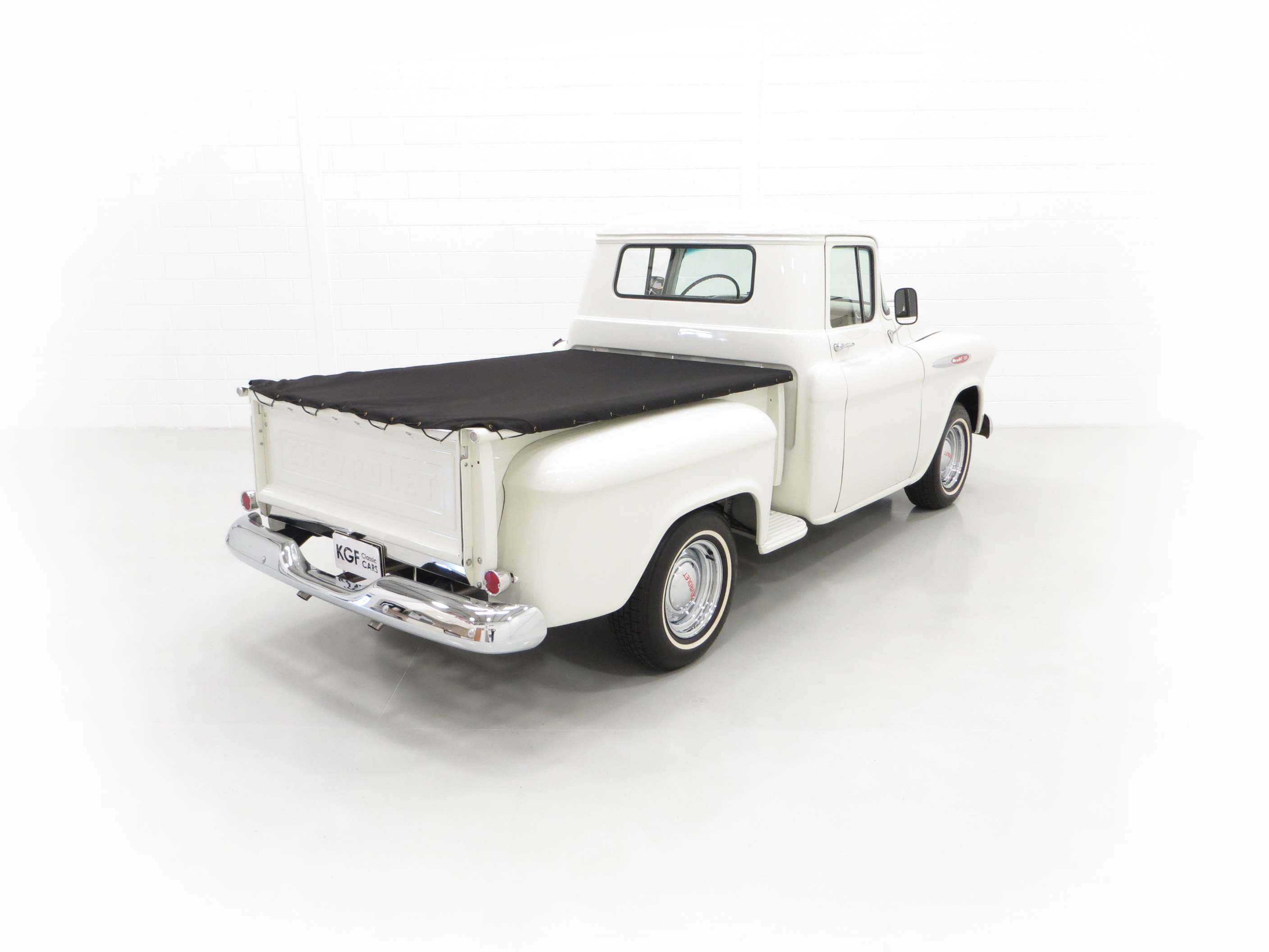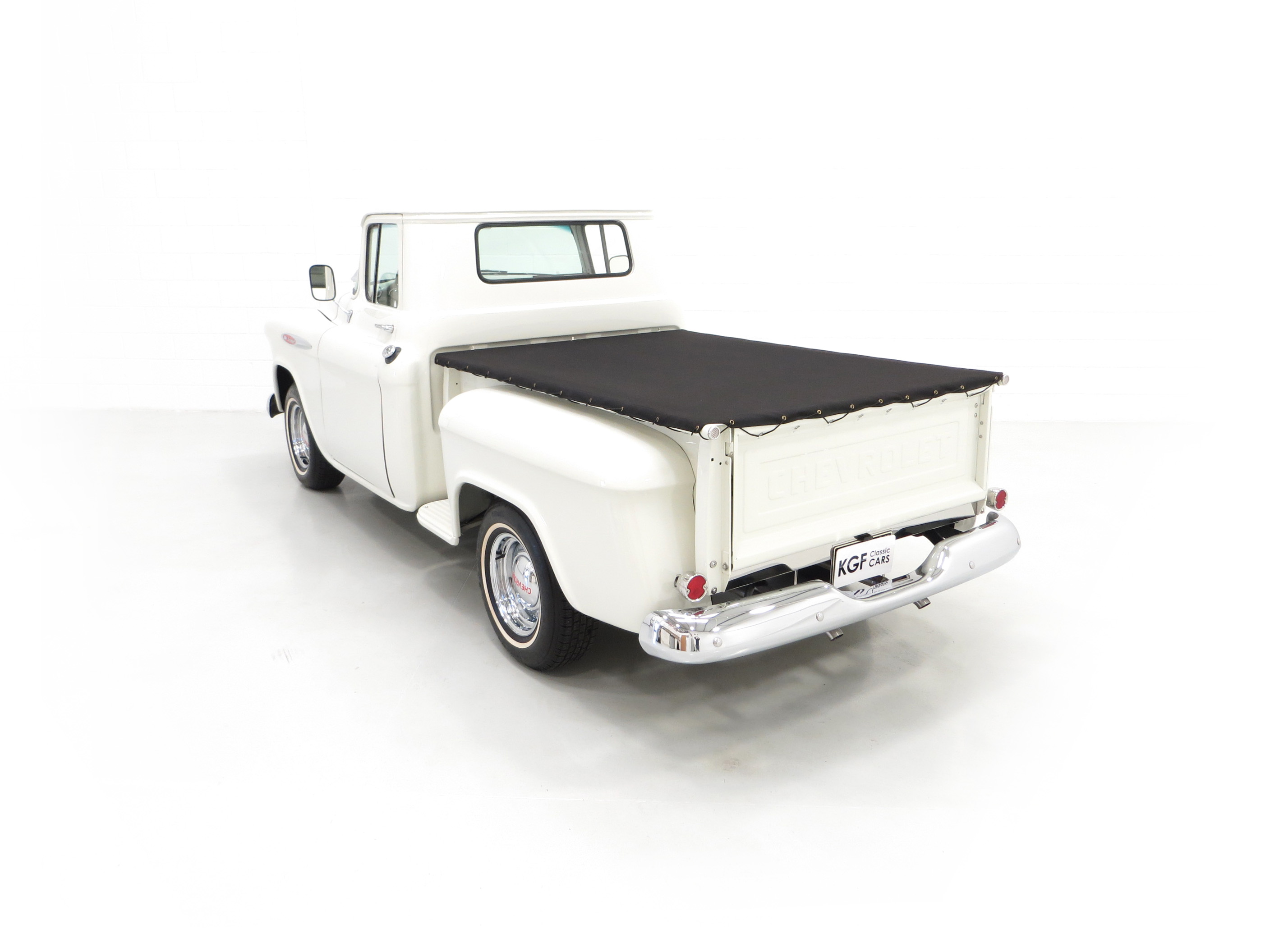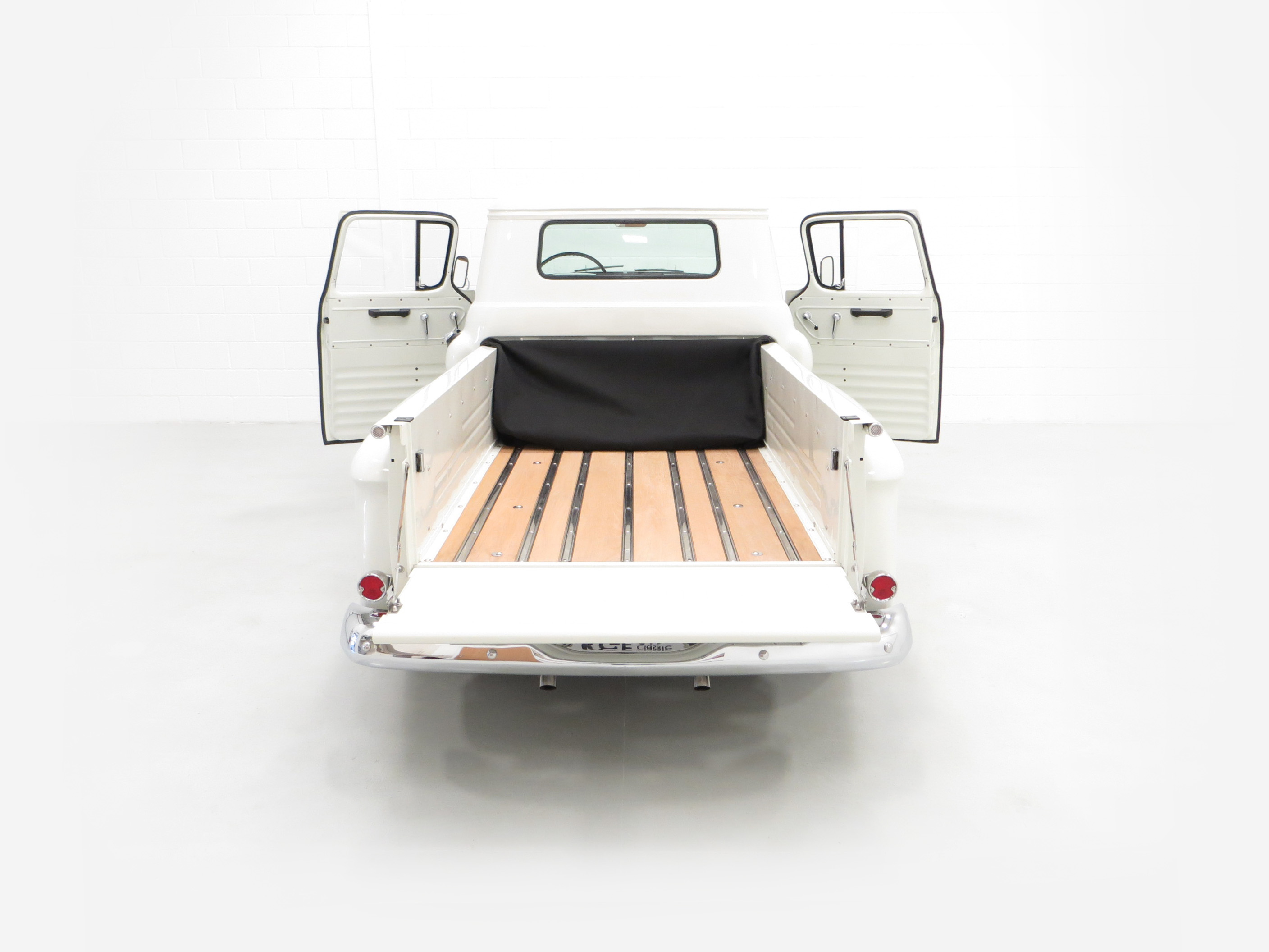 This striking Chevrolet light-duty truck is finished in glossy Pastellweiss, (Code 90D) and has an almost flawless appearance. The sparkling chrome tastefully graces all areas from the imposing front grille to the smoothie rear bumpers. The load-pulling look and forward slanting profile is enhanced with bright metal spear-type side designation plates and chrome headlamp bezels. The rear deck is beautifully finished in polished wood and stainless steel covered by an immaculate black quality waterproof material cover. All trim is in remarkable condition with only the bonnet chrome spears showing slight pitting. The underside is spotlessly clean with the chassis frame and diagonal bracing in perfect order. This Chevy hauler really is a Show Pony!