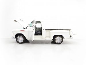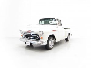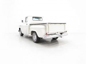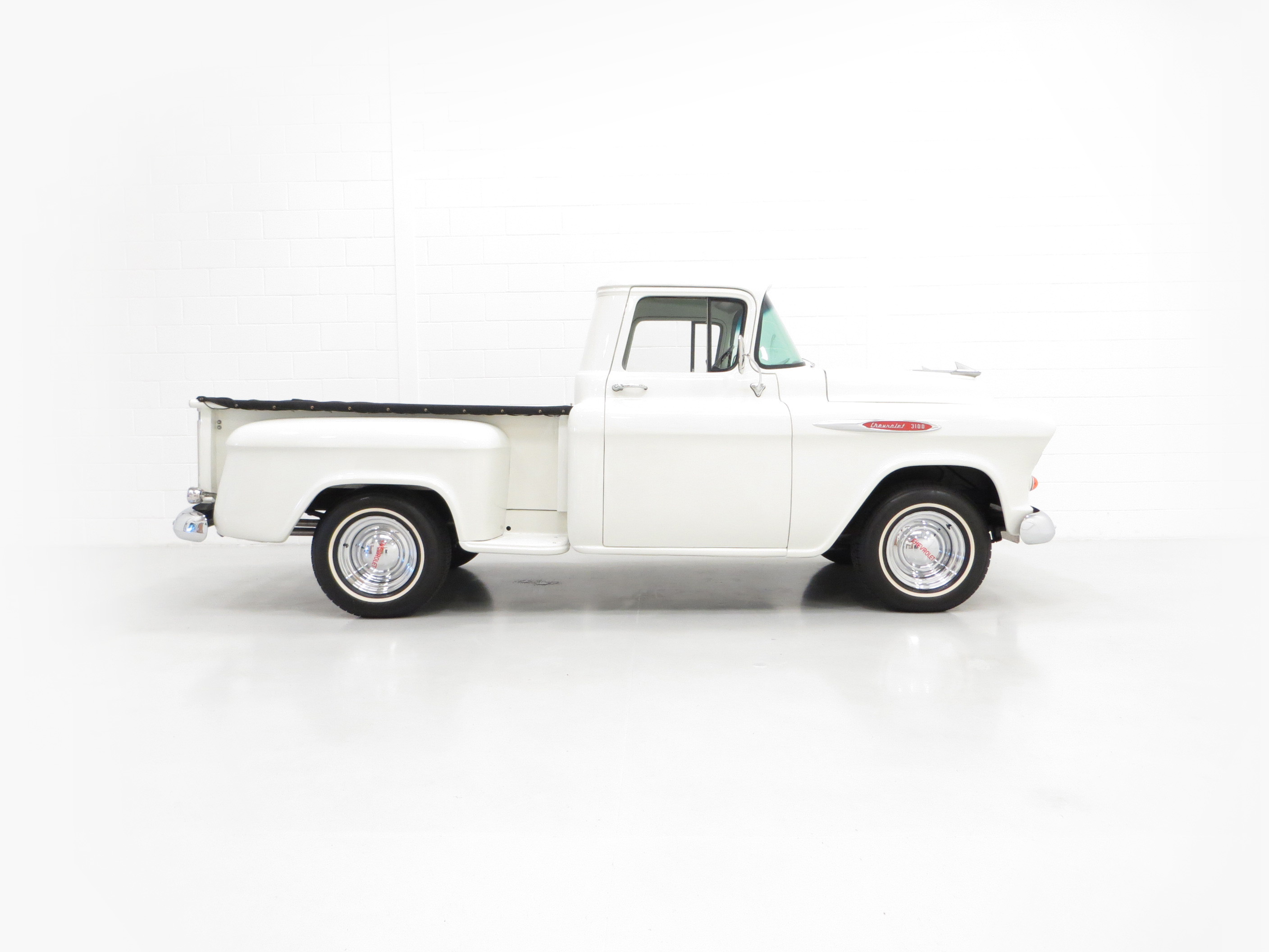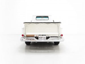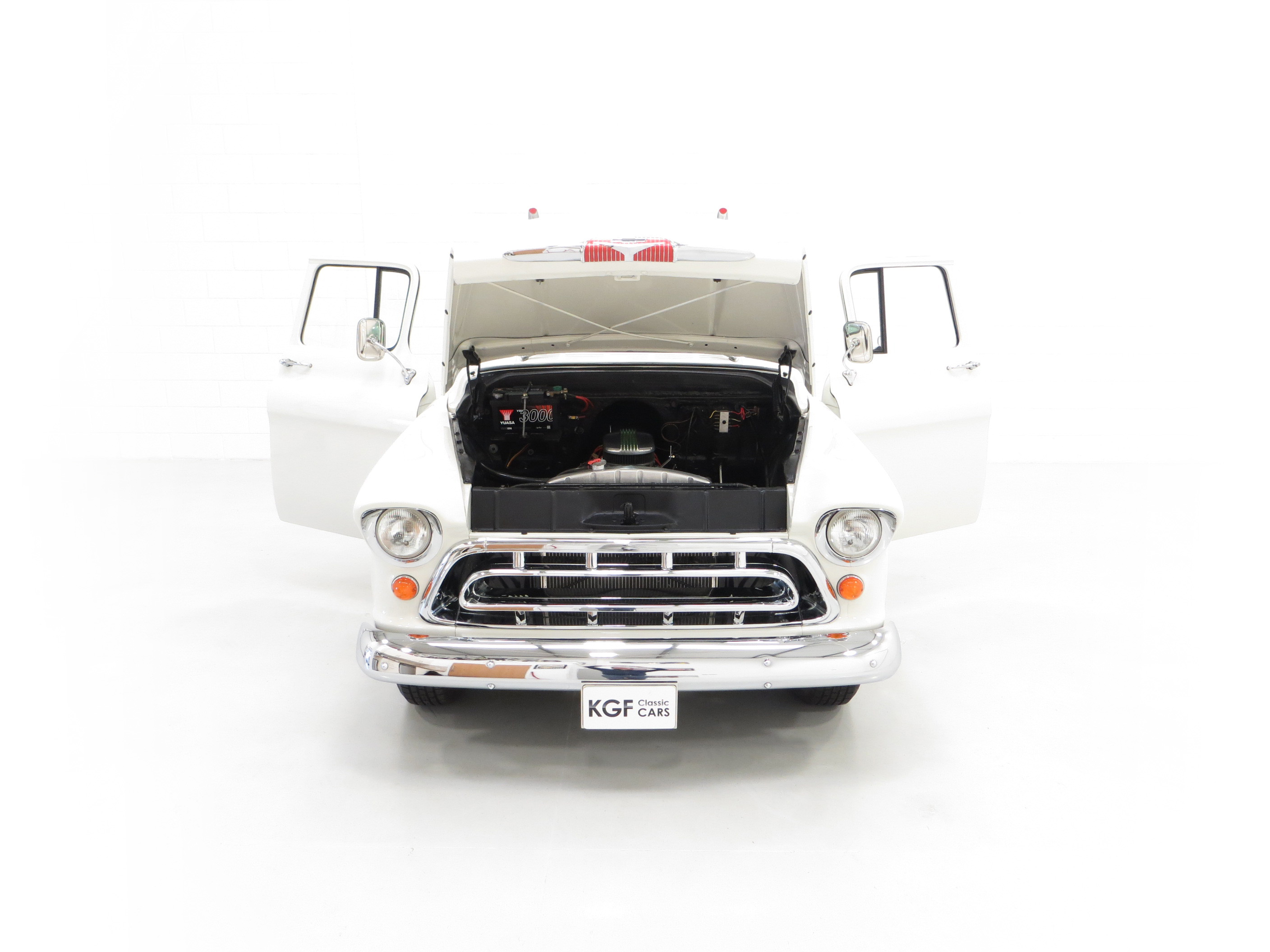 This striking Chevrolet light-duty truck is finished in glossy Pastellweiss, (Code 90D) and has an almost flawless appearance. The sparkling chrome tastefully graces all areas from the imposing front grille to the smoothie rear bumpers. The load-pulling look and forward slanting profile is enhanced with bright metal spear-type side designation plates and chrome headlamp bezels. The rear deck is beautifully finished in polished wood and stainless steel covered by an immaculate black quality waterproof material cover. All trim is in remarkable condition with only the bonnet chrome spears showing slight pitting. The underside is spotlessly clean with the chassis frame and diagonal bracing in perfect order. This Chevy hauler really is a Show Pony!