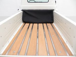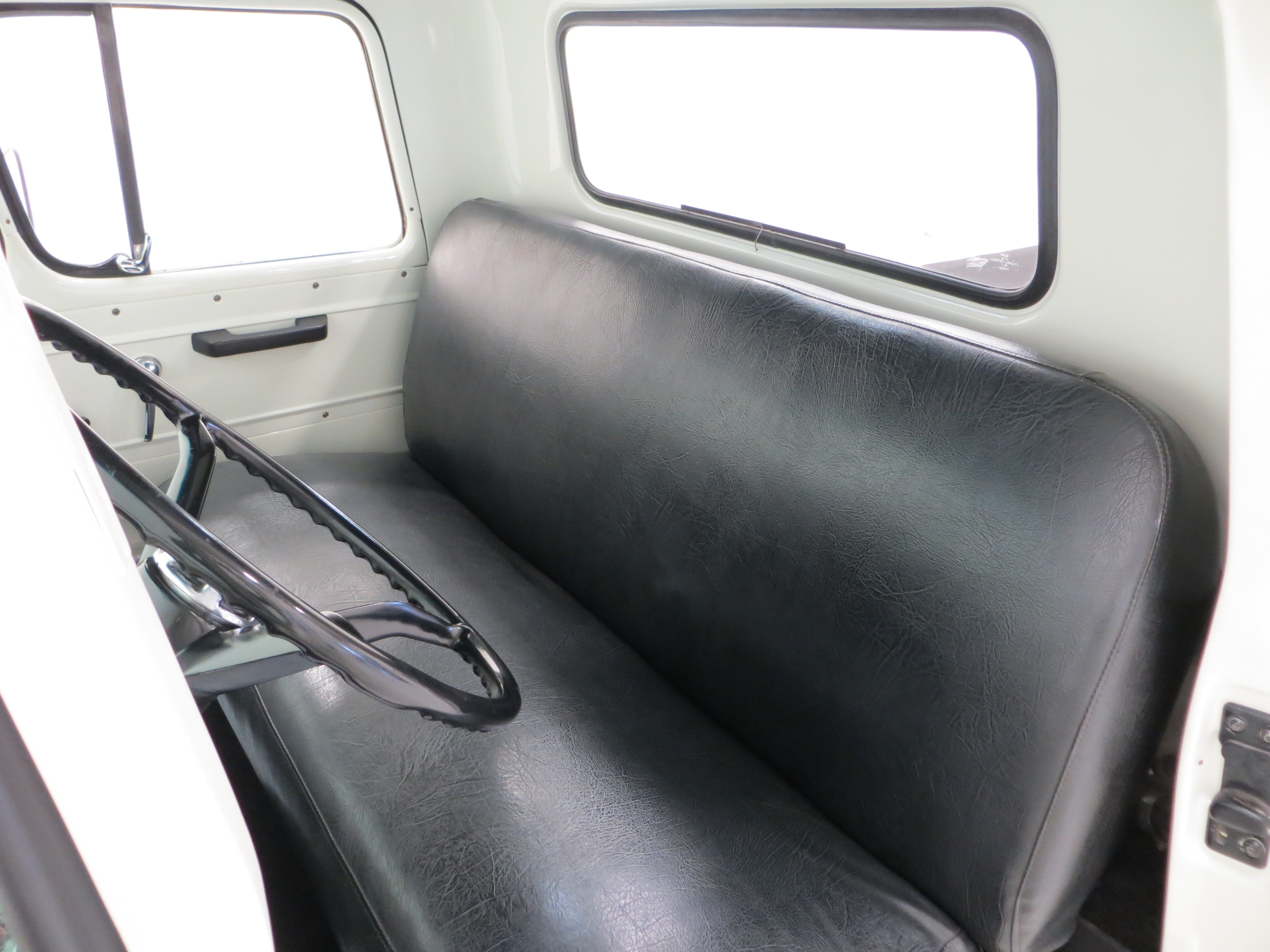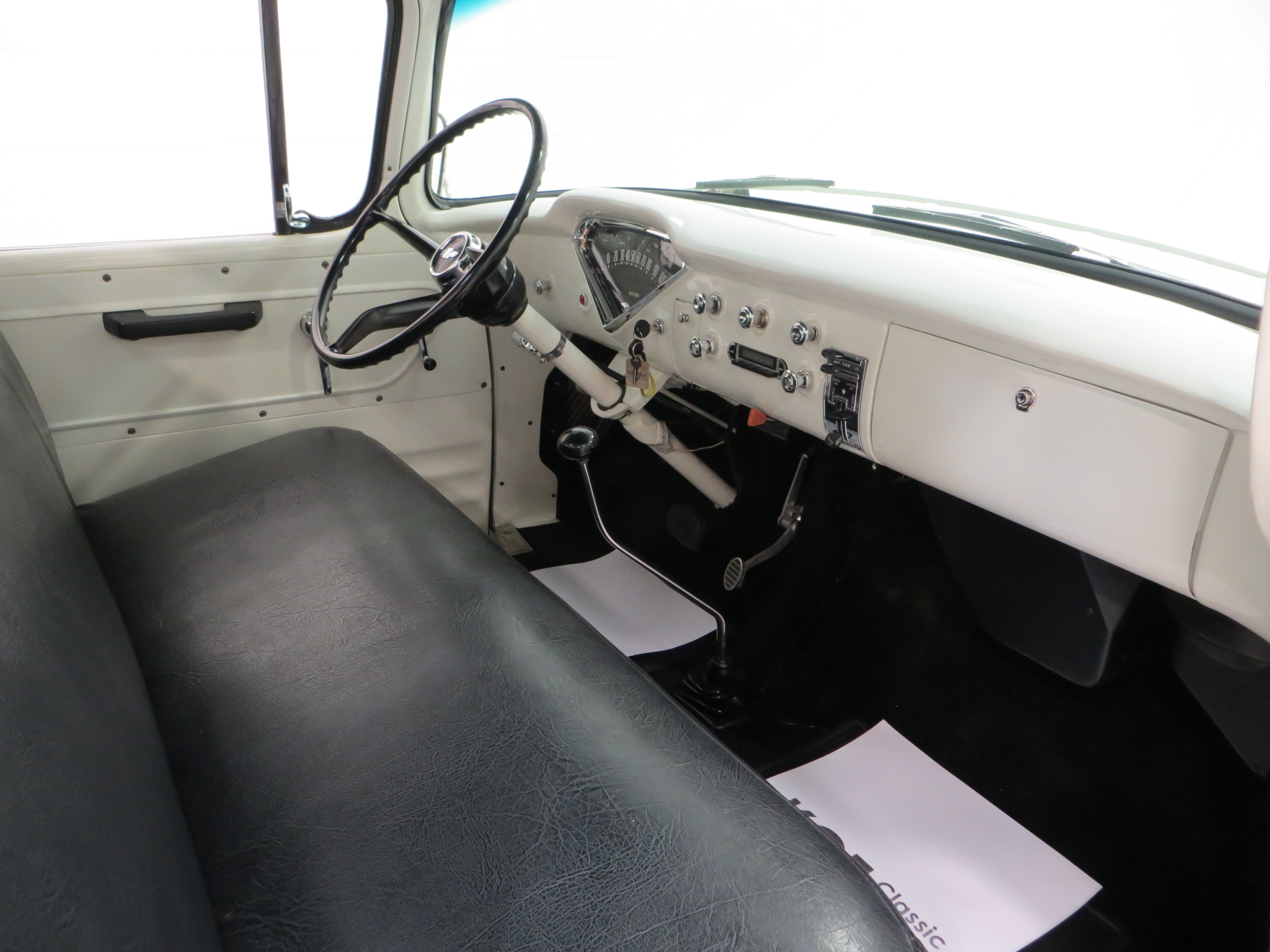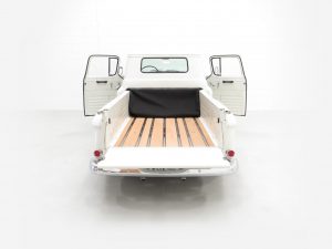 Panoramic tinted windshield with green top shade, concealed safety steps, high-level ventilation, long-leaf rear springs, hooded headlights, bonnet emblem, chrome bumpers front and rear, chrome wing mirrors, wood and stainless steel truck bed with cargo cover, folding tailgate, ventipanes, choke control, cigar lighter, ashtray, temperature, ammeter, oil and fuel gauges, dispatch box, three-person seating, dash mounted handbrake lever, twin sun visors, heater fan, rheostat dash lighting adjustment, chrome interior pack, interior LED lighting, digital radio with Ipod and USB connectivity.