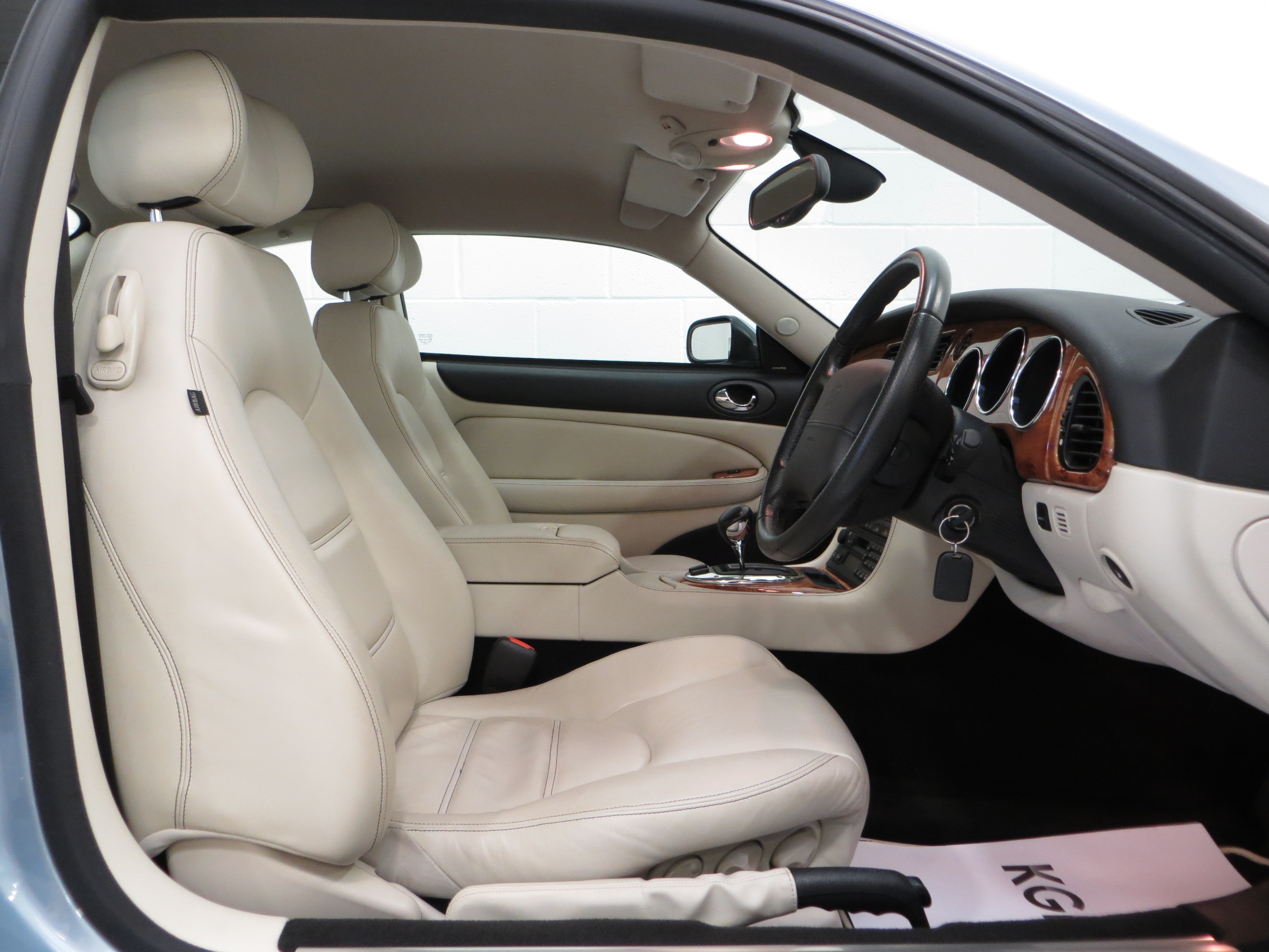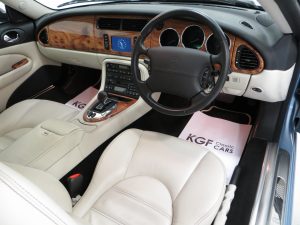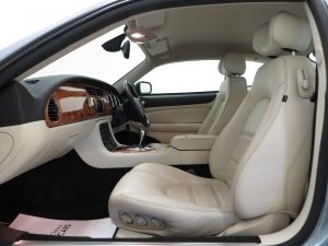 Fabulous in every respect. The blemish free hides are finished in Ivory full leather, (Code NED), with unique Warm Charcoal Third Contrast stitching. The seats are representative of a 16,245 mile example with firm seat structure and supreme heated and electrically controlled comfort. The previous owner even had made a tailored drivers seat cover. The Elm veneer dashboard facings with matching colour scheme Warm Charcoal upper fascia and seatbelts and Ivory lower fascia harmonise with the upholstery perfectly and all trim is perfect. The Flint carpet and Oatmeal headlining are also immaculate and all equipment, mood lighting and high specification functions operate perfectly. The special embossed leather edged floor mats remain fitted with some light wear. Jaguar interior styling and opulence and a truly special 2+2 sports tourer.