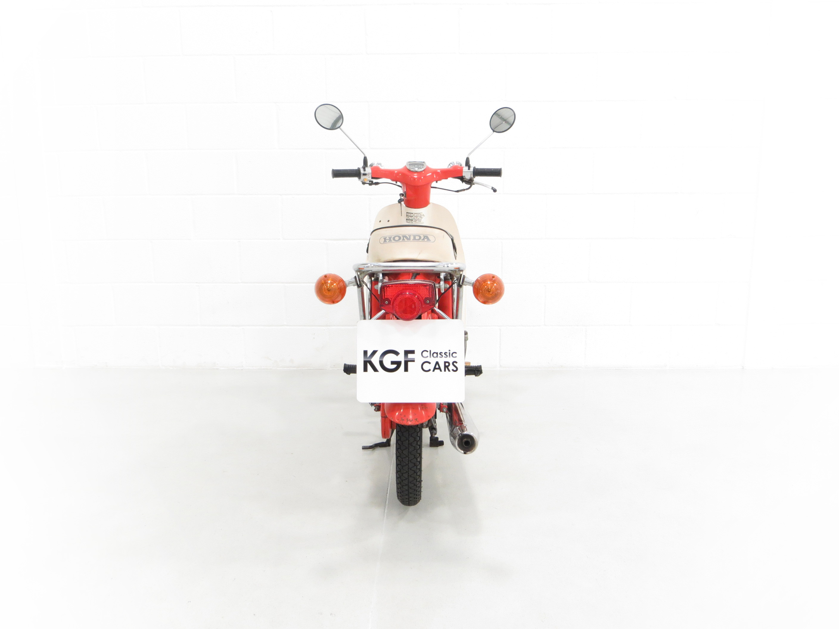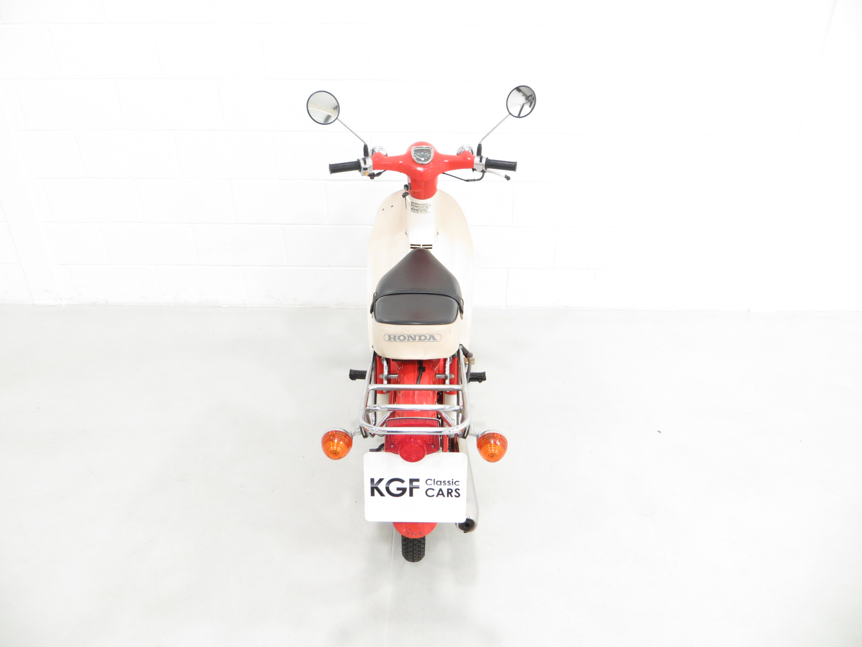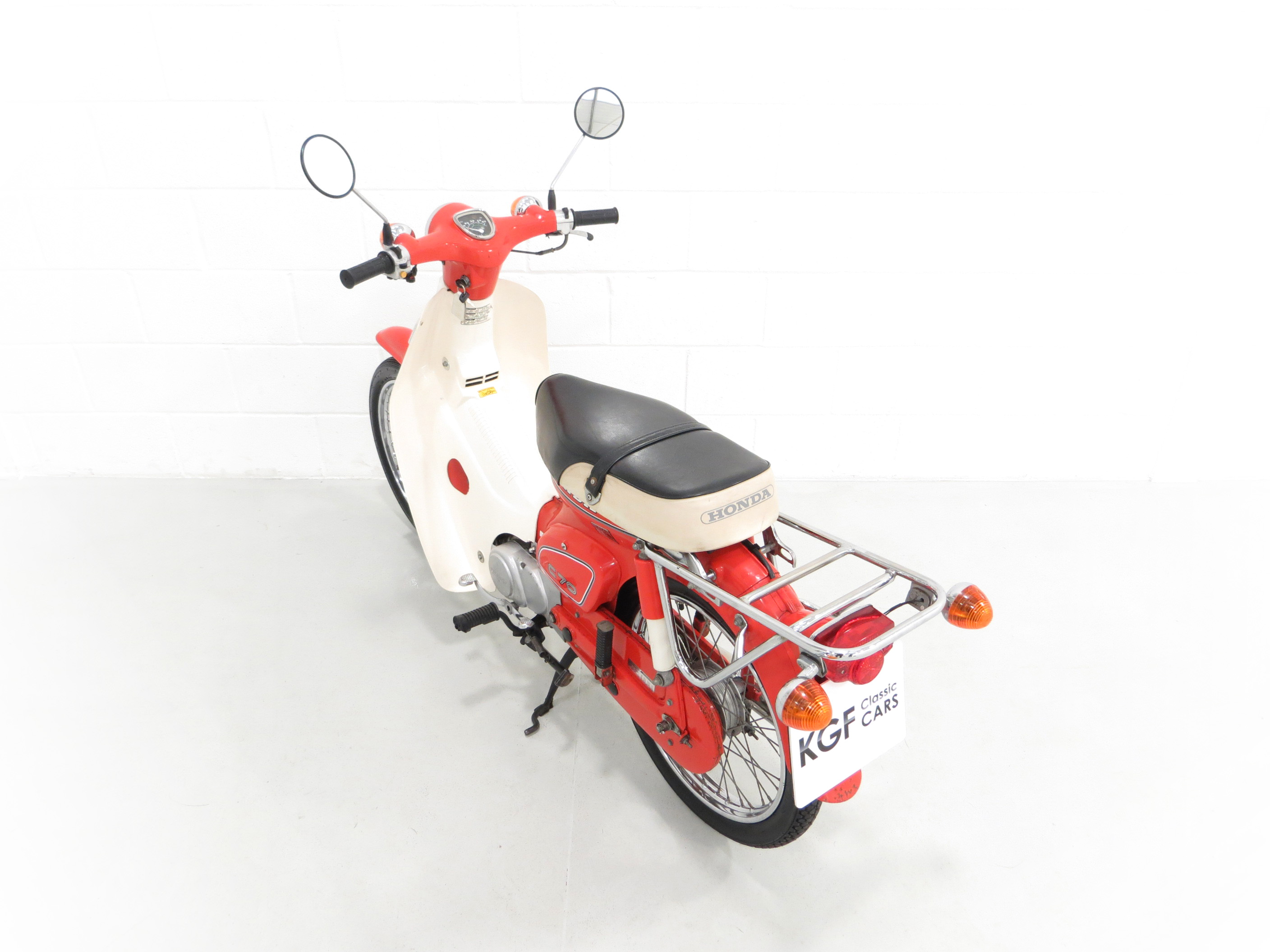 This wonderful 1984 C70-C is the more desirable ‘round headlight’ model and this example is finished in factory original Monza Red. Having covered just 3,600 miles from new, this remarkable example has never been restored and still boasts first paint credentials, virtually unheard of. A natural aged patina is entirely forgivable and does not spoil the appearance. All metal is in remarkable shape has never been welded or repaired and the polyethylene leg guard/cowling is incredibly well-preserved with no cracks. The front mudguard displays a small thumbnail size repair. Factory decals below the seat and original stickers and warning labels will further delight originality seekers, as will the factory badges, supplying dealer cowling sticker and plastic sheath over the foot brake pedal. The fully intact black and white seat covering is also factory fitment and the original number plate remains fitted. The toolkit is present in the side locker. All switchgear, lights and instruments are fully functional. This unspoilt C70 is deliciously retro and a fitting tribute to this Honda icon.