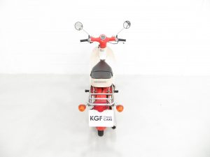 Pressed steel underbone frame, 12-volt electrics, capacitor discharge ignition (CDI), polyethylene leg guard/cowling, black and white long seat, rear luggage rack, 3-speed clutchless transmission, fully enclosed drivetrain, horn, primary coupled kick-starter, chrome indicator housing, two adjustable mirrors, Nippon Seiki HO-791 speedometer, odometer, turn signal switch, headlight switch, neutral indicator, rear footrests, helmet lock, side storage with toolkit.