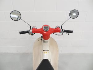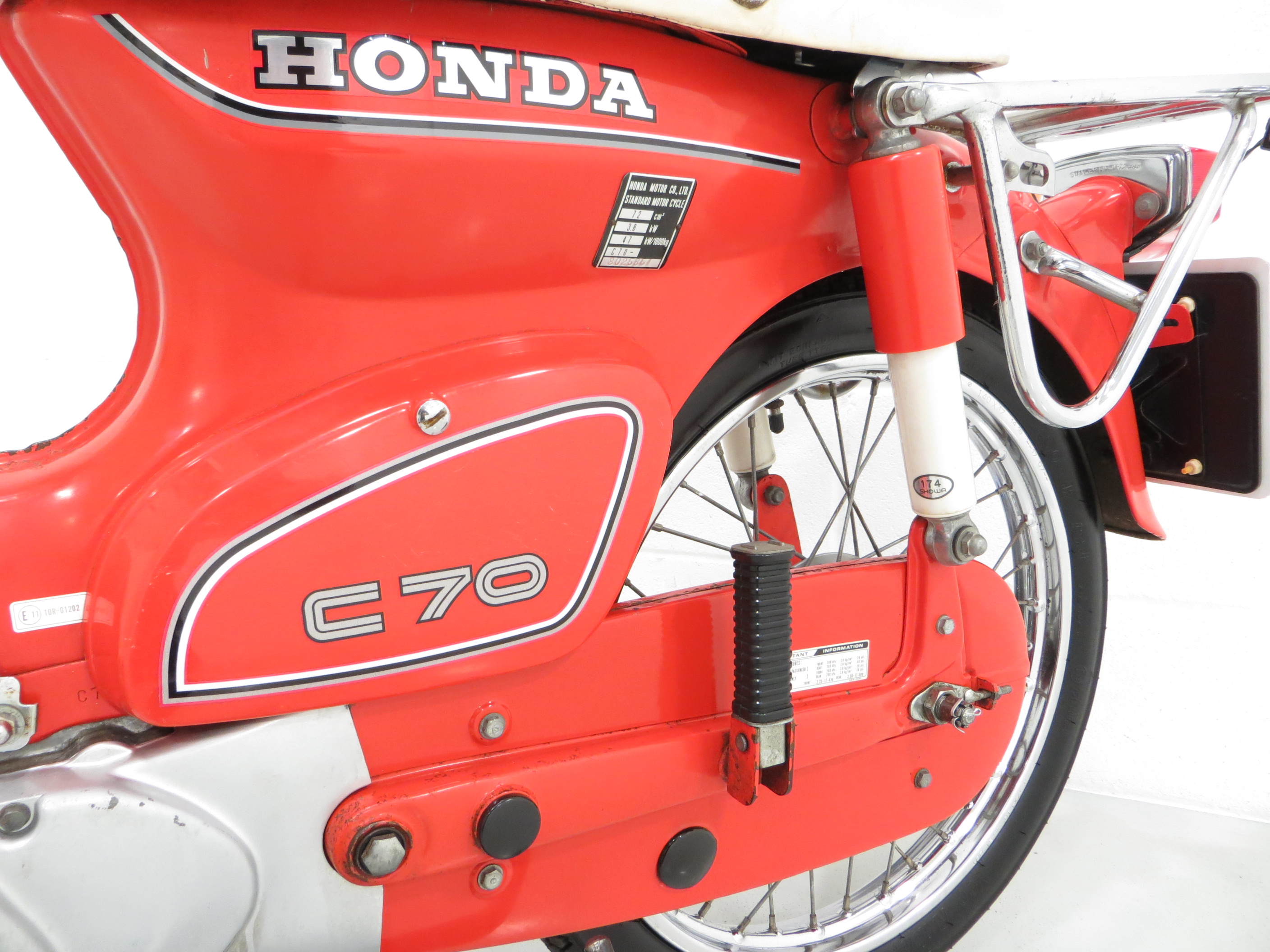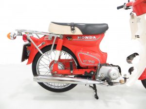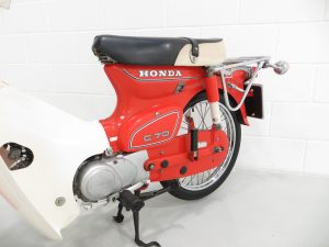 The frame identification stamping and identity plate are correct for the a 1984 C70-C and match the vehicle documentation, as does the clearly legible engine number stamp. The 71.8cc engine develops 6bhp, enough to propel this machine to 43mph (depending on the rider’s weight!). The exhaust is a replacement piece in superb order and a very good replication of the original item. The clutchless 3-speed ‘all down’ transmission is easy to use and in perfect working order. Surprisingly nippy and a lot of fun!