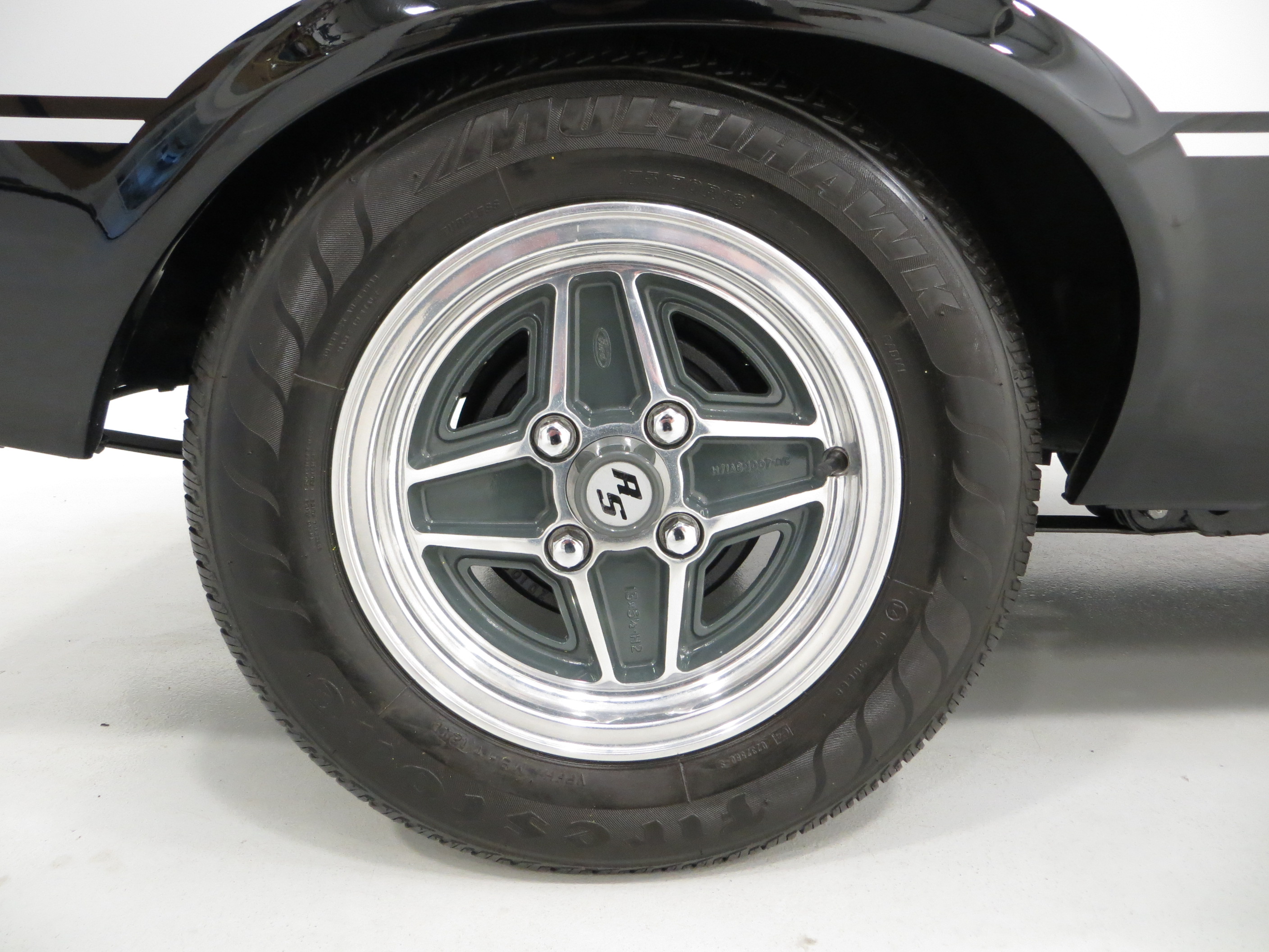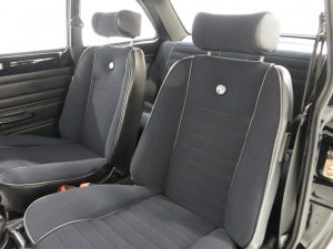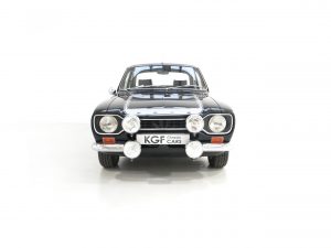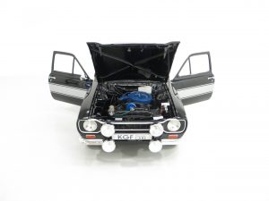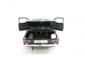 Prepare for lots of attention as this exhilarating RS2000 stands proud in its factory correct and special order only Black paint work, (Code Y). The glossy shine is stunning. The flared front wheel arches and rolled rear arches, to accommodate the wide sports road wheels, are set off beautifully by the contrasting colour decal scheme. Original factory fitted items like the 7” diameter round sealed beam Cibe IODE H4 headlights and RS optional working Oscar high mounted driving lamps are synonymous with Group 2 Rally events and the Roger Clark Escort championship success. Detailed items remain fitted such as the RS wiper aerofoil and correct FoMoCo rear lights and reversing lamps. A black painted underside is very clean and allows perfect inspection and will please those enjoying the show scene.