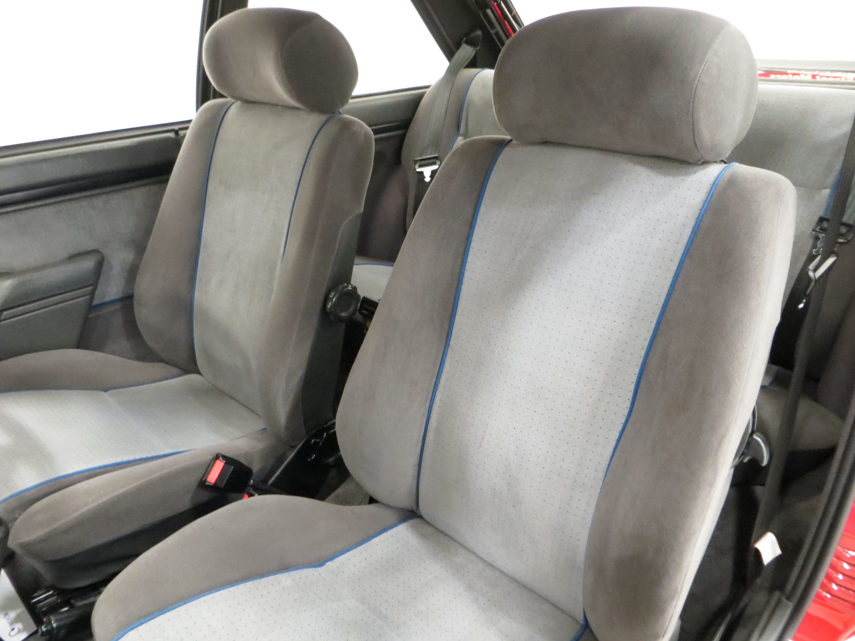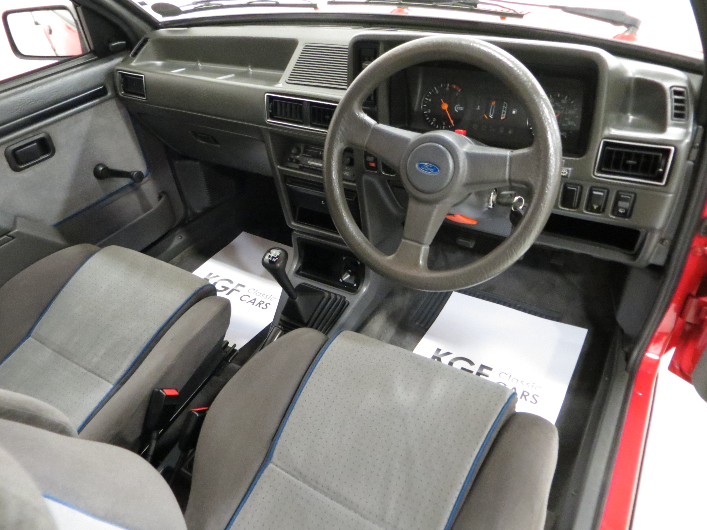 Aerodynamic spoilers front and rear, wheel arch air deflectors, colour keyed bumpers, colour keyed remote door mirrors, front and rear overriders, black finish window surrounds, tailgate wash wipe, XR3i badge on tailgate, sports reclining seats, head restraints, side window demisters, perforated headlining, coat hooks, vanity mirror on passenger sun visor, cigar lighter, rear ashtrays, front door stowage bins, 3-speed heater fan, coin box, Ford SRT 32P radio cassette, trip recorder, tachometer, roof mounted digital clock, three spoke soft feel steering wheel. Factory options; Sunroof, tinted glass, rear seat belts.