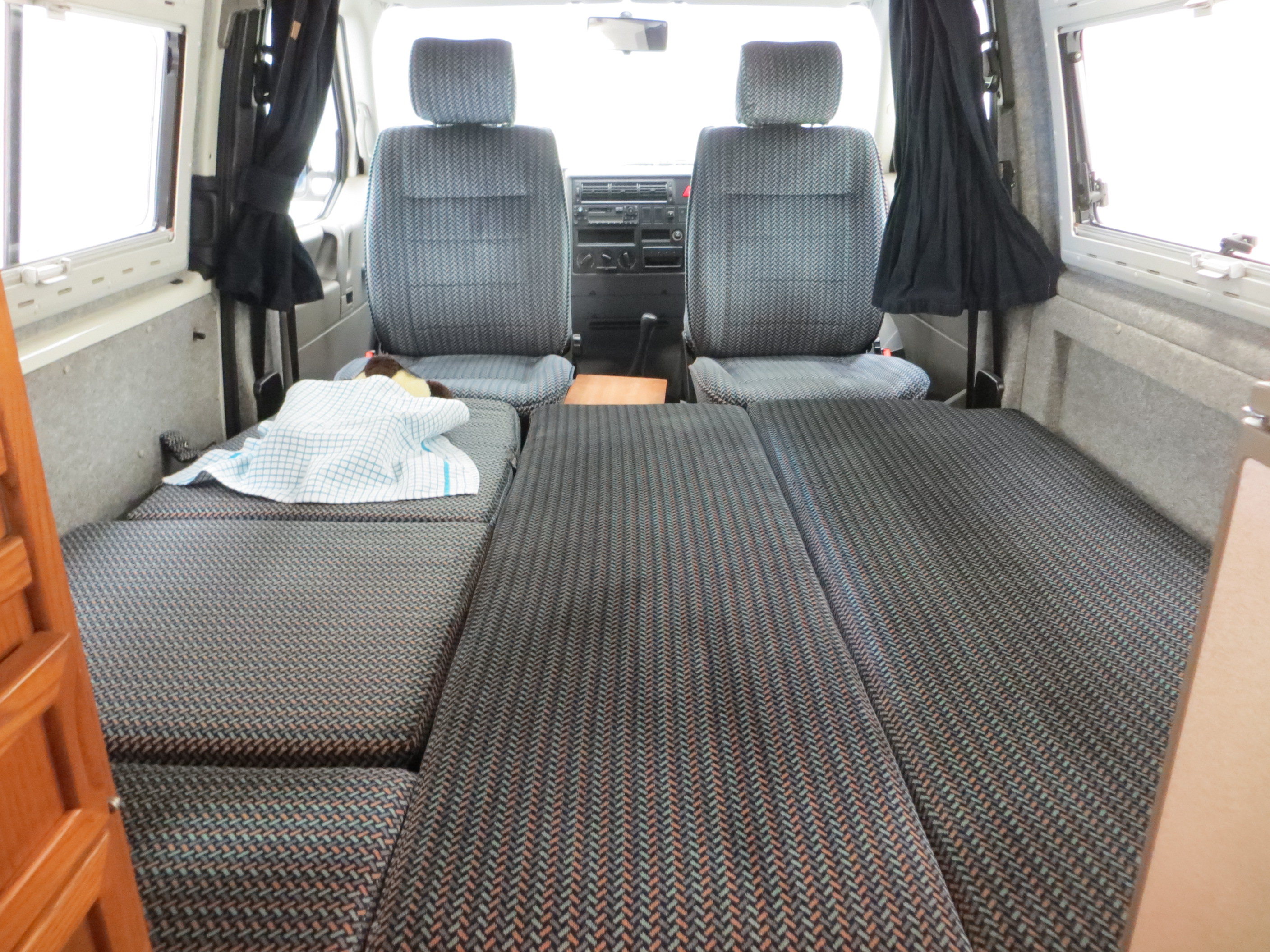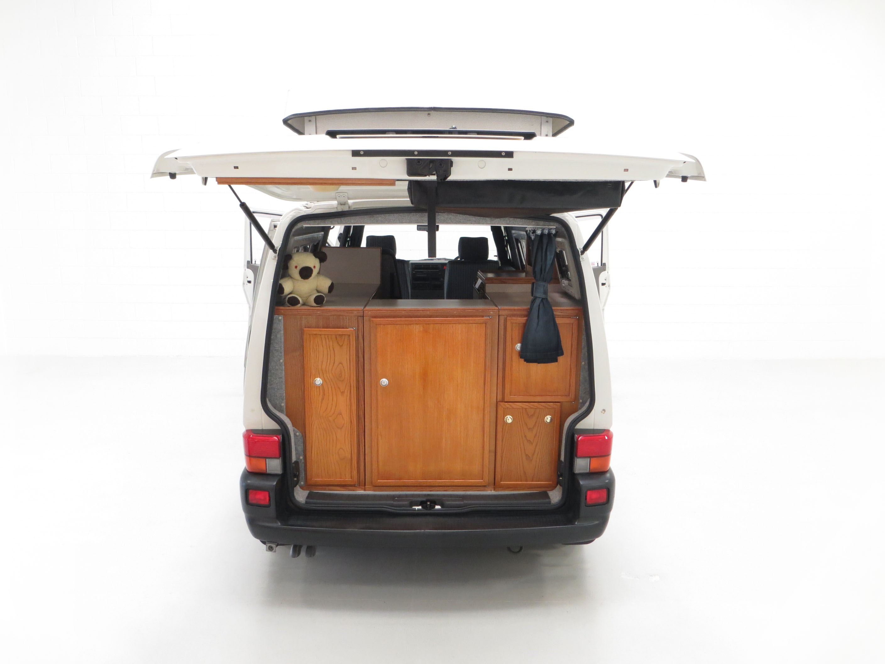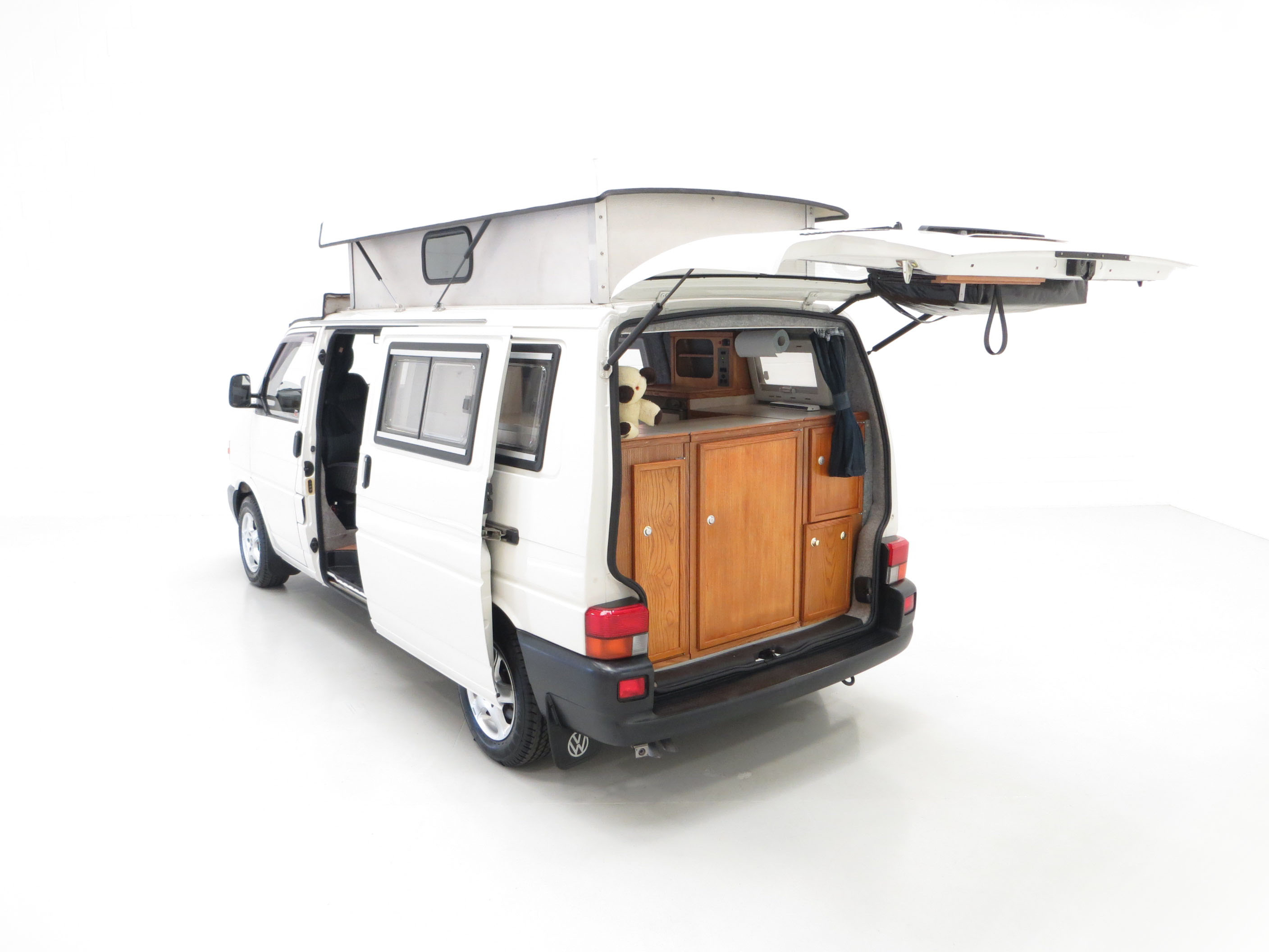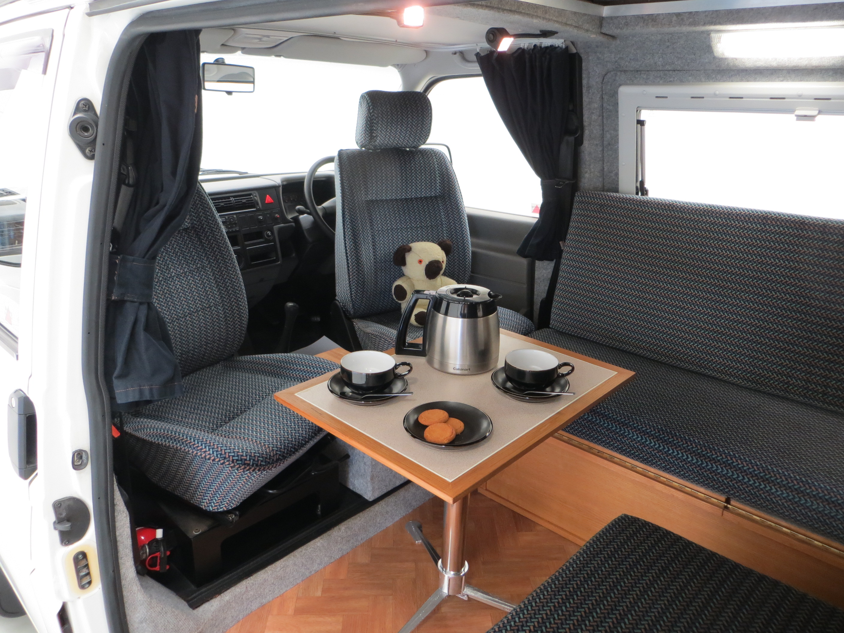 Long wheelbase body, alloy wheels, power assisted steering, rear tailgate door, side sliding door, Volkswagen BETA radio/cassette, remote central locking. Camping Equipment; Young Conversions Ltd bespoke ‘Islay’ design to include; Double glazed windows with blinds and fly screens, 12 Volt electrical system, auxiliary leisure battery, control panel, 12 volt socket, 2 x 16w fluorescent lights, 4 x flexible reading lights, 2 x gas cylinder in steel gas locker, Islay kitchen in Ash veneer MDF, Formica work tops, 2 burner hob and grill, Electrolux RM4201 fridge/freezer, solid-sided elevating roof, Islay seat/bed configuration, table with tripod, insulated roof, floor and trim panels, underfloor water tank with self-priming pump, sink, Trumatic E2400 blown air heating, swivel front captain seats. Dealer options; Mud flaps, Volkswagen carpet mats, door wind deflectors, fire extinguisher.