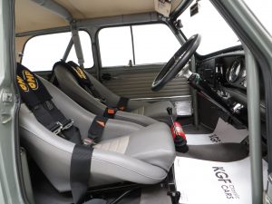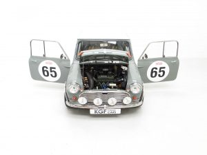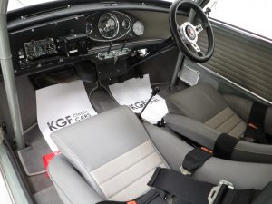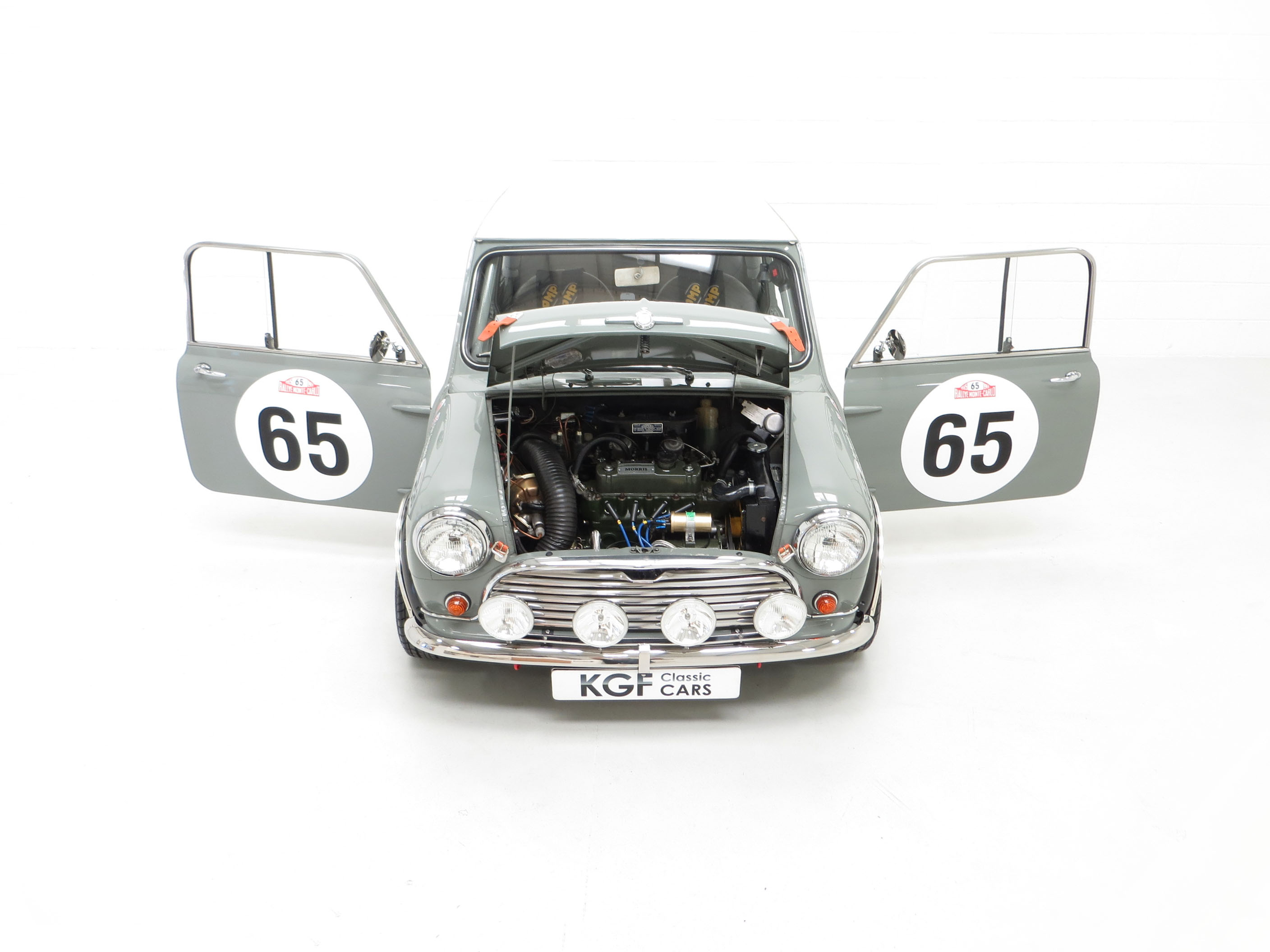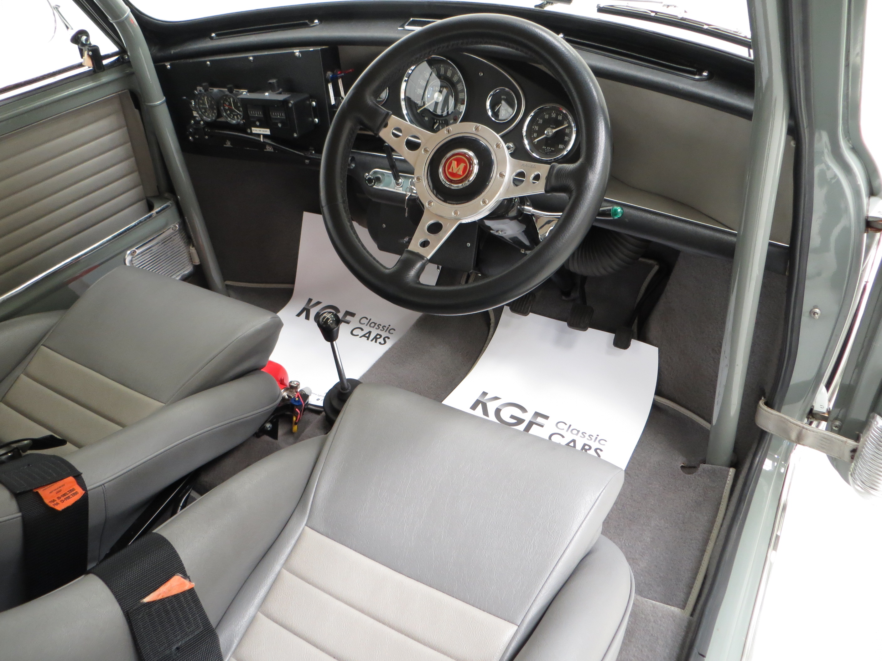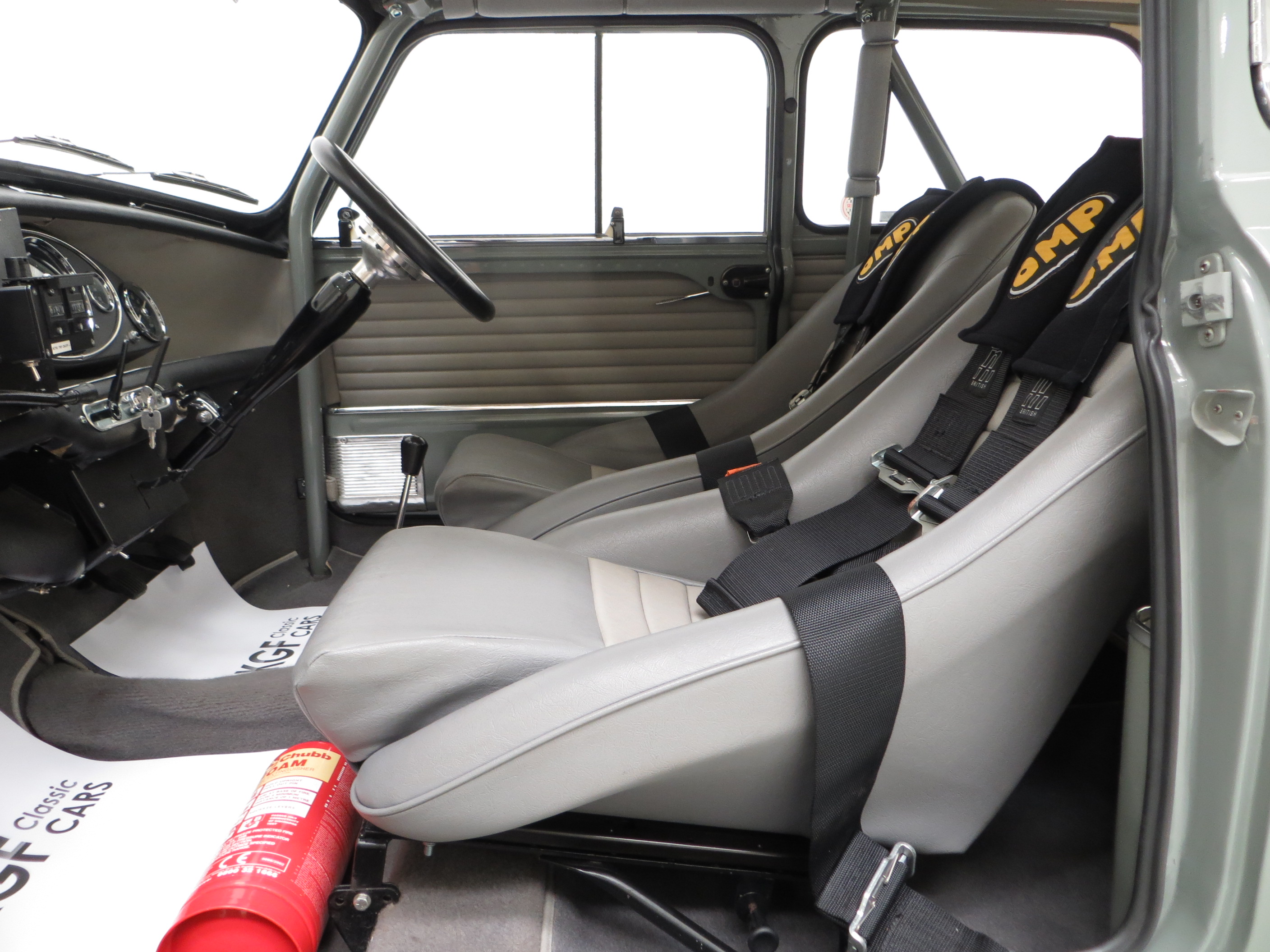 Truly amazing with uprated Newton Commercial bucket seats in the correct colour of Dove Grey/Dark Grey, (the original seats are also included) and fully updated to a ‘works’ spec with rev counter and panel, including passenger retro trip, expensive Herwins stop watches and map lights. The Cumulus Grey carpeting is immaculate and the door panels and roof lining is extremely clean. All gauges function including the 120mph speedometer. Colour coded Safety Devices bolted in cage with removable sections as required by the FIA supplement other period accessories such as the Moto-Lita steering wheel, (original included), and all offer an amazing Mini experience. The boot area very clean fitted with the optional second fuel tank, spare wheel and jack.