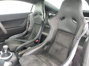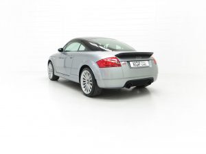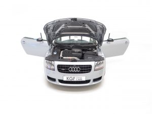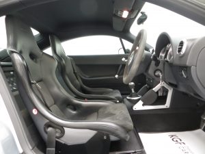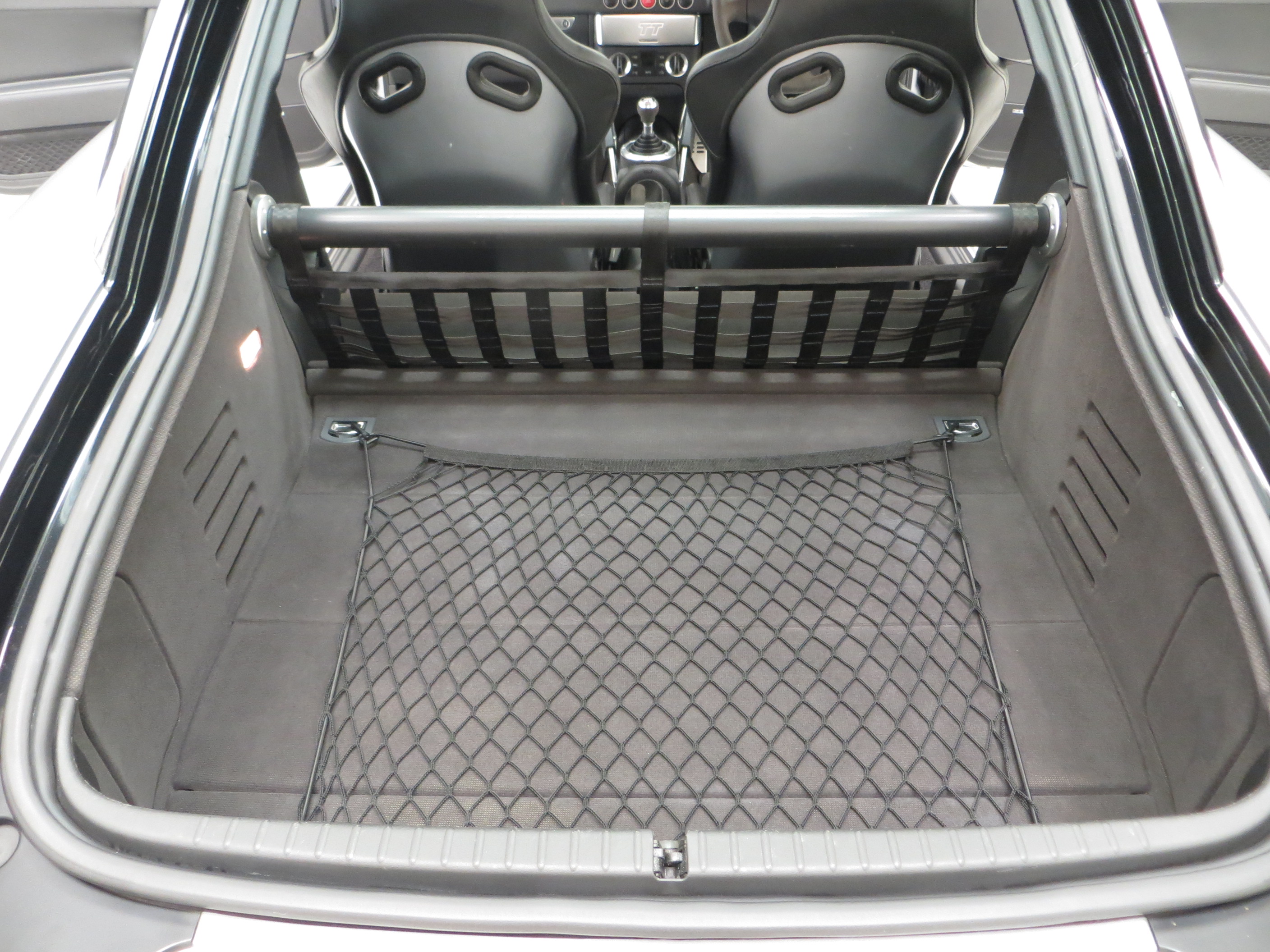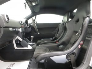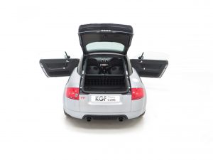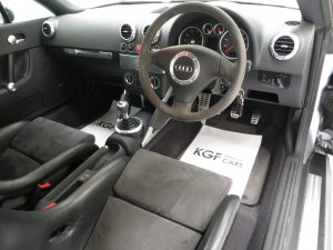 The interior of this Audi TT remains in remarkable good condition. The Recaro Bucket seats with Phantom Black seat backs exclusive for the TT Sport remain fitted and are alternative to the less desirable standard sport seats that were available as a no cost option chosen by some buyers on comfort grounds. The black alcantara/leather seats coverings, (Code TT), are in very good order with only slight bobbling to the alcantara base panels and some light wear to the steering wheel. All trim pieces, controls and functions operate perfectly including the ice-cold air conditioning. Genuine Audi carpet mats remain fitted and manufacturer stickers are still attached in the door shuts. Obvious weight saving measures to contribute towards to overall weight loss of 75kg is achieved by a stability bar and luggage net in place of the rear seat, and removal of the spare wheel and heated seats. The discreet and unique Quattro Sport badge above the glove box acts as a subtle hint towards this very special TT’s capabilities.