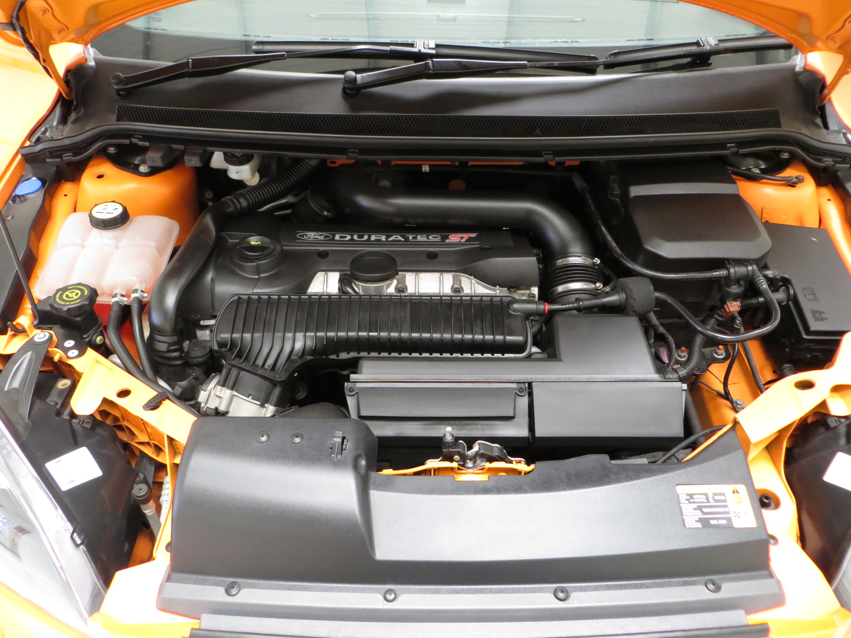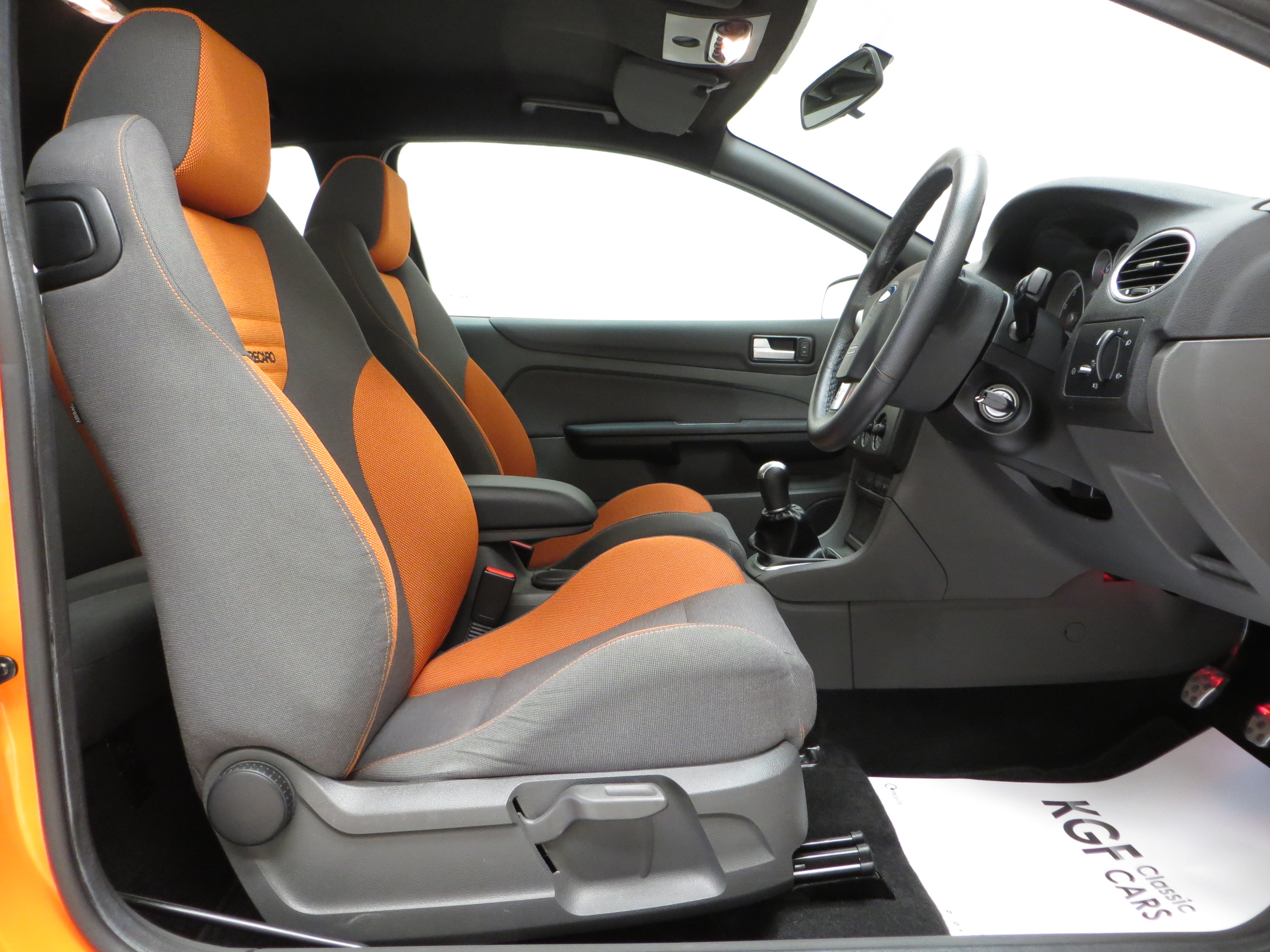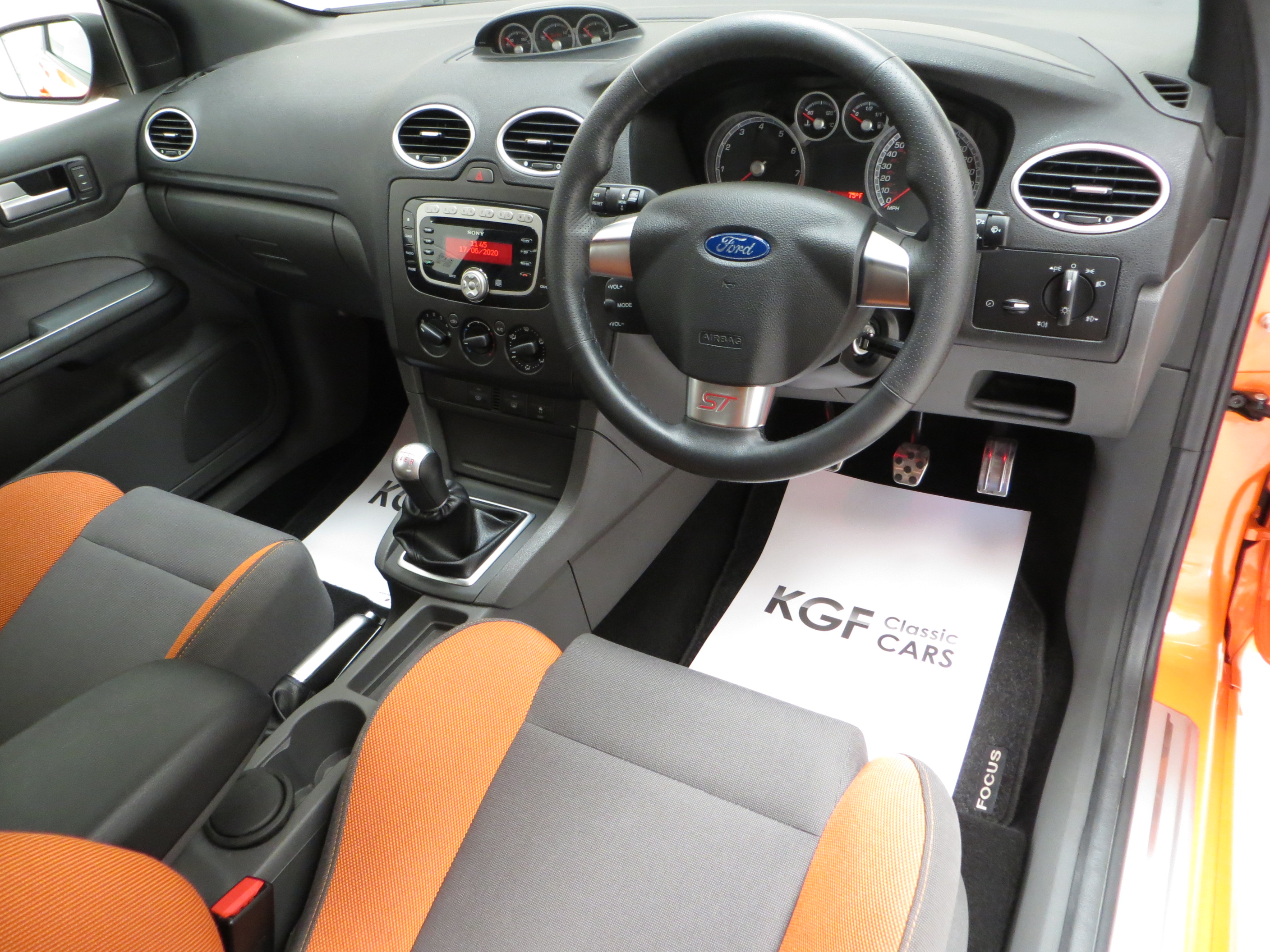 Exclusive ST sports bodykit, unique ST bumpers and mesh grille, ST single wing spoiler, chrome tipped twin sport exhaust tailpipes, side and curtain airbags, Passive Anti-theft System (PATS), CAT 1 Thatcham Approved alarm, energy absorbing crumple zones, air conditioning, Quickclear front windscreen, auxiliary instrument panel housing turbo boost, oil pressure and oil temperature gauges, Ford Sony MP3 stereo radio/CD, Recaro sport seats, ST Sports steering wheel, jet black headlining, submarine lighting, brushed aluminium gear knob and handbrake grip with racing pedals. Factory options; Park Assist. Dealer options; Fitted Focus floor mats, badge delete.