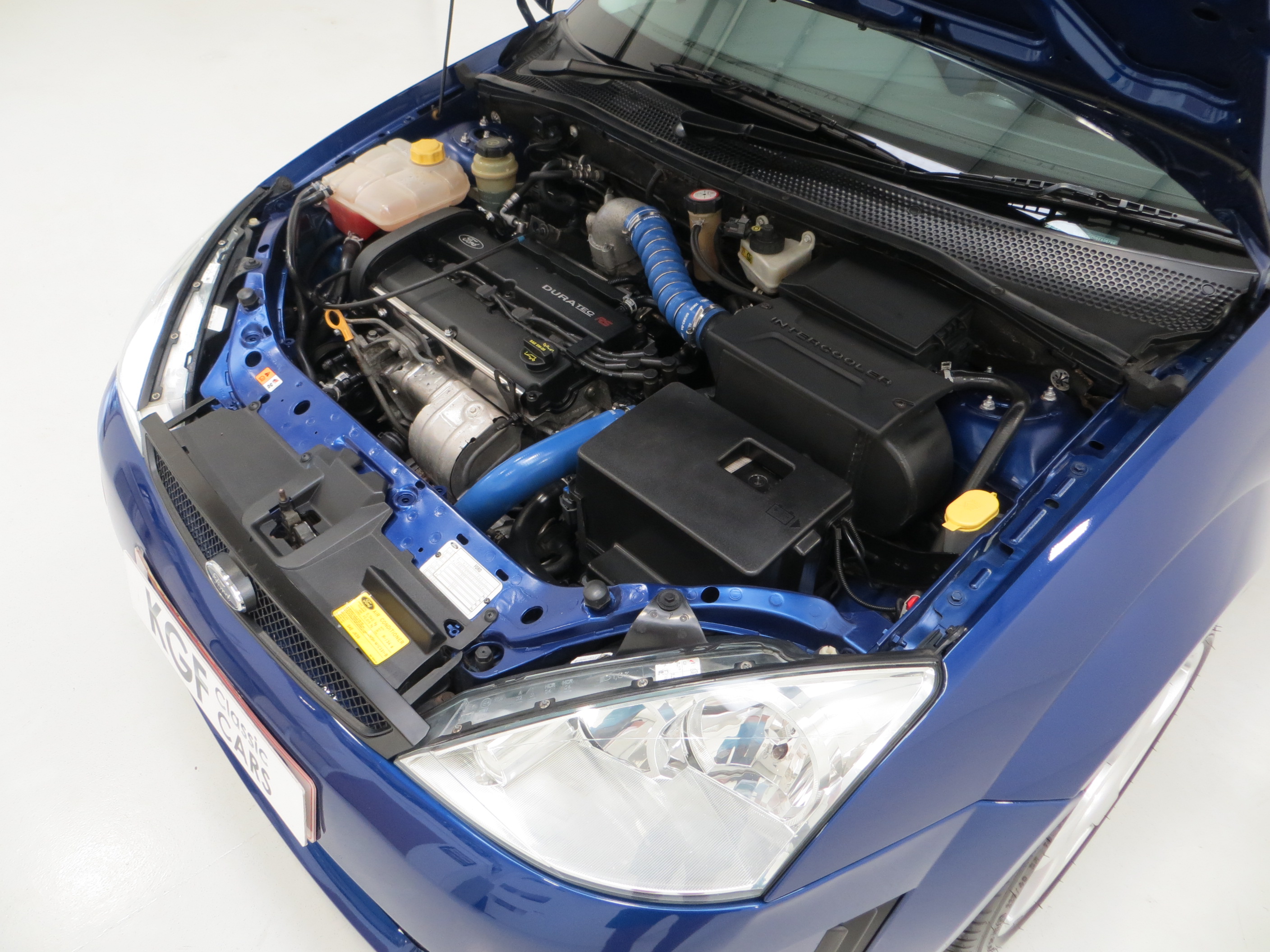 Inside this white-hot Ford are a pair of body-hugging Sparco road-race seats swathed in luxurious Racing Black and Blue Leather and Black Alcantara, (Code AR). The RS and Sparco logos are embossed and stitched into the upholstery, and this coupled with the aluminium fittings, push button start and numbered plaque, leave you with little doubt this is no ordinary Focus! The interior is beautifully preserved and the seats are completely free from damage and have firm bolsters all-round. The steering wheel blue leather, a known weak point, is bright and unworn thanks to being replaced by a genuine Ford item in 2014 with an invoice from Ford for £632.45. The RS carpet mats remain fitted and are further protected by a second set of genuine Ford Focus mats. All controls function including the ice-cold air conditioning and Ford 6006E stereo. The conscientious owner has replaced the coin tray, (included), and installed a slot-in ScanGauge vital systems monitor to keep a watchful eye on water temperature amongst other readings. Ford built this car to truly delight its motorsport loving RS devoted fan base and the long-awaited car did not disappoint.