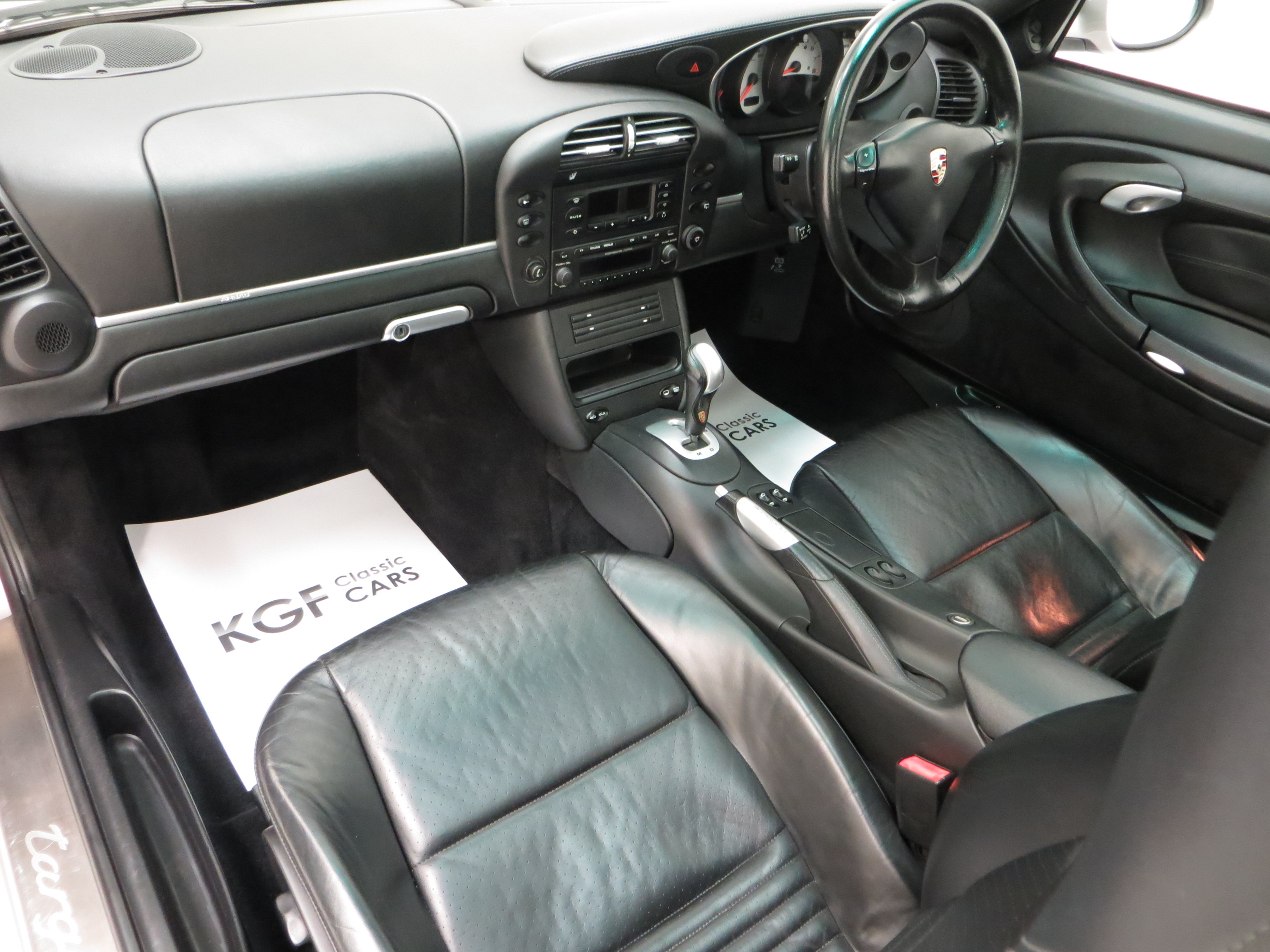 Electrically operated Targa roll-up sun screen, PSM (Porsche Stability Management), Porsche Side Impact Protection (POSIP), front occupant airbags, side airbags, active rear spoiler, integrated wind deflector, electrically operated hinged opening rear screen, volumetric alarm system, automatic climate control, digital speed indicator, CDR23 sound system, rear seats. Factory Options; Tiptronic S 5-speed transmission, metallic paint, 18in Carrera 5-spoke alloy wheels, wheel caps with coloured Porsche crest, rear parking sensors, Litronic (Xenon) headlamps, headlamp cleaning, leather interior, electric memory seats, CDC-4 CD changer, aluminium look dials, Tiptronic gear selector and handbrake lever in aluminium and leather.
