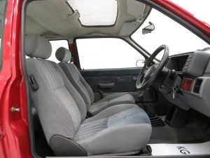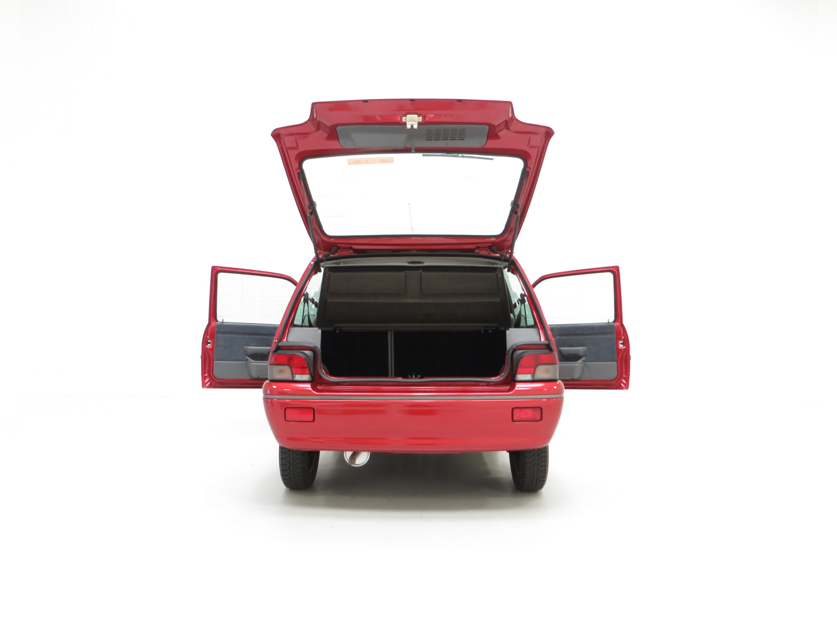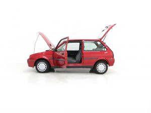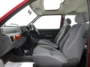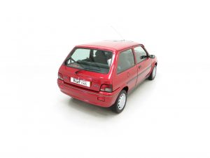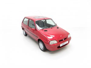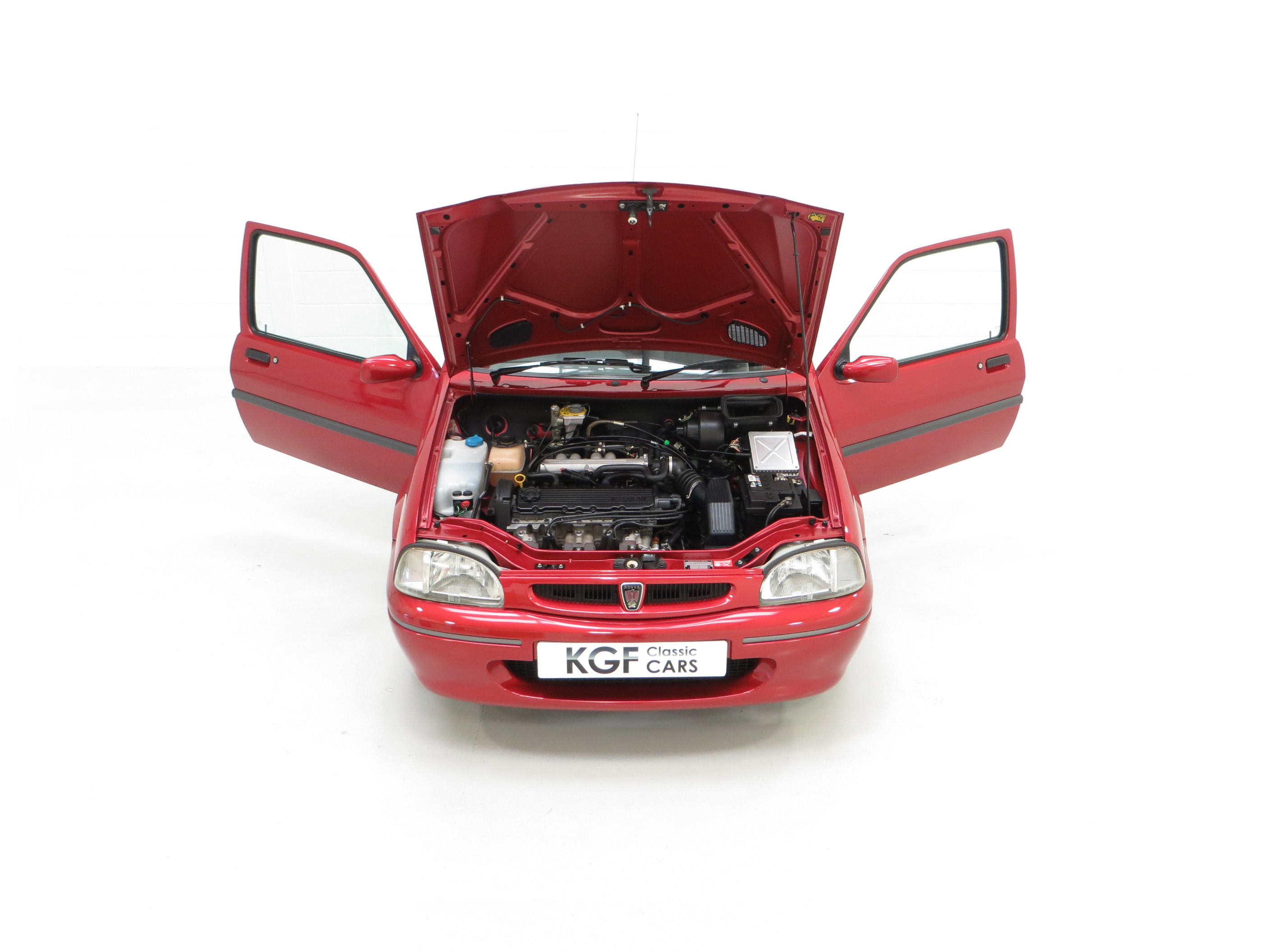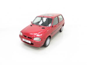 This delightful Rover 114GSi represents the final and much revised incarnation of Austin-Rovers iconic Mini-Metro, a car that played a huge part in upholding the manufacturer’s existence throughout the 1980’s and 90’s. The presentation of this truly incredible example thoroughly echoes the mere 9,876 miles covered with its factory original paintwork boasting a deep polished and uniform shine throughout. The optional Nightfire Red Pearlescent paintwork, (Code CAQ), simply gleams and all factory panels are straight with uniform gaps. A tiny mark to the rear bumper and one to the boot lid corner are visible only upon close inspection. The unmolested appeal of this charming baby Rover is further emphasised with standard trim sections, colour coded bumpers and badges all present and correct. Even the supplying dealer number plates, and rear screen sticker remain fitted! Hugely superior in condition to the usual offerings, one for continued preservation and enjoyment.