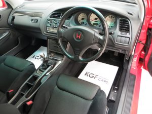 Front spoiler, rear skirt, side fairings, mesh grille, auto levelling High Intensity Discharge (HID) headlamps with washers, helical limited slip differential, uprated springs and dampers, Momo leather steering wheel, digital clock, headlight ‘on’ reminder chime, remote fuel filler release, illuminated ignition switch, dashboard illumination control, dual SRS airbags, power front windows and door mirrors, titanium gear shift knob. Factory Options; Boot spoiler, air conditioning, rear parking sensors, Level 2 ICE Programme with Pioneer DEH-P6000R. Dealer accessories; Tailored Type R embossed floor mats.