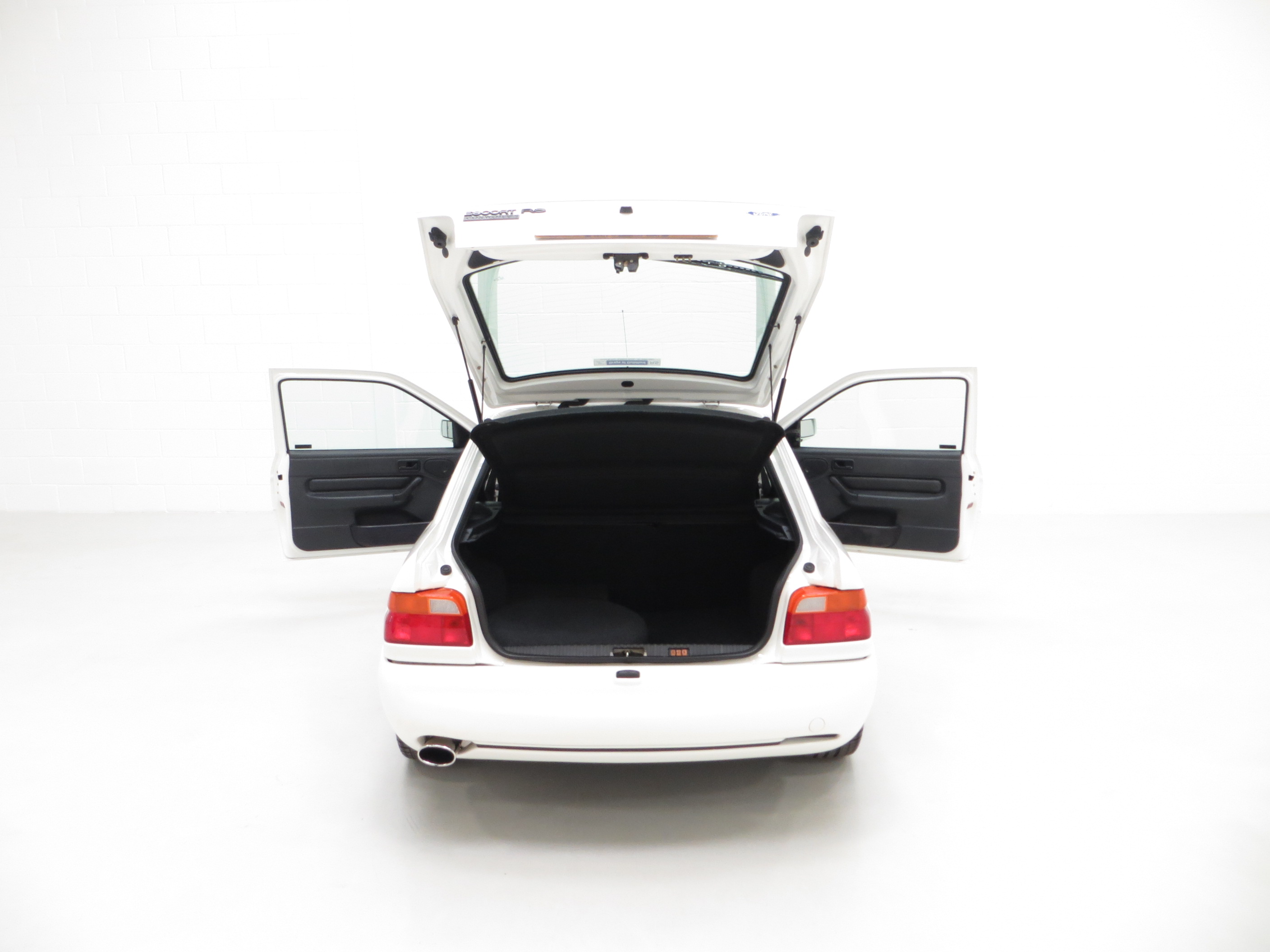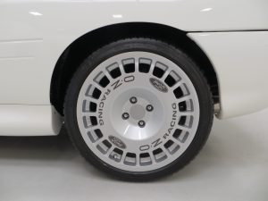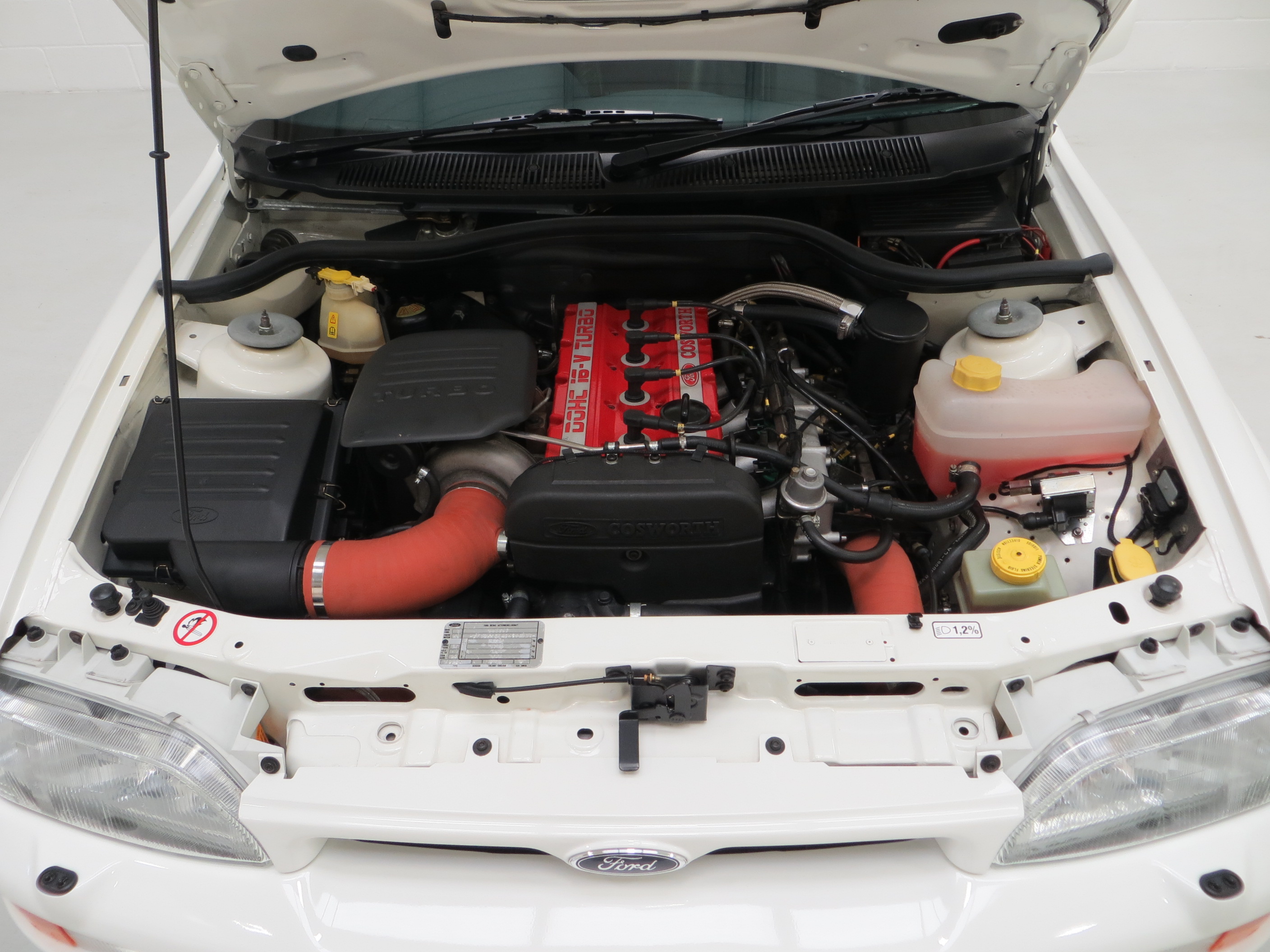 The interior of this Escort Cosworth is a very special place to be. The Recaro seats are finished in optional Dark Grey Leather with virtually no visual imperfections. The cut-pile carpets are perfect and still protected by genuine Ford rubber mats. The comprehensive electro-luminescent instrument panel is all functional. The vehicle is fitted with the optional and very rare air conditioning and Ford 2040 CD player so with the Luxury package, represents full specification. A discreet WRC 12 position boost control switch and Clifford Concept 650 alarm is fitted. The boot area is pristine and houses the factory fitted space-saver spare wheel and correct jack.