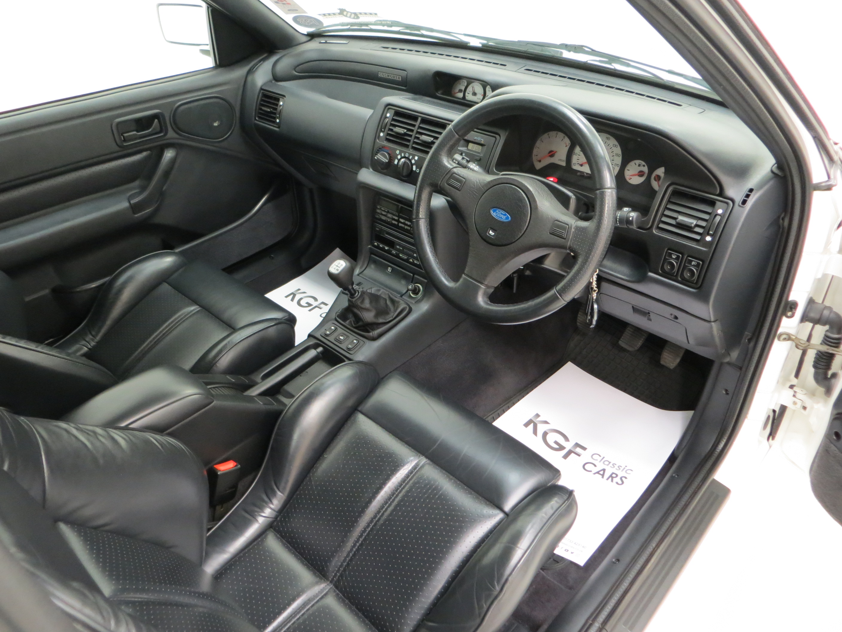 The striking exterior of this Escort RS Cosworth is nothing short of stunning. Finished in iconic Diamond White, (code B2), the paintwork boasts a professional detailed shine from the smooth polished exterior. Early homologation clues such as the exposed petrol cap remain and larger door mirrors. All exterior trim is in excellent order including the lights, badges and rubbers. The black lower splitter has a few tiny marks and the supplying dealer number plates and rear window sticker are still fitted. One for the Blue Oval fanatic.