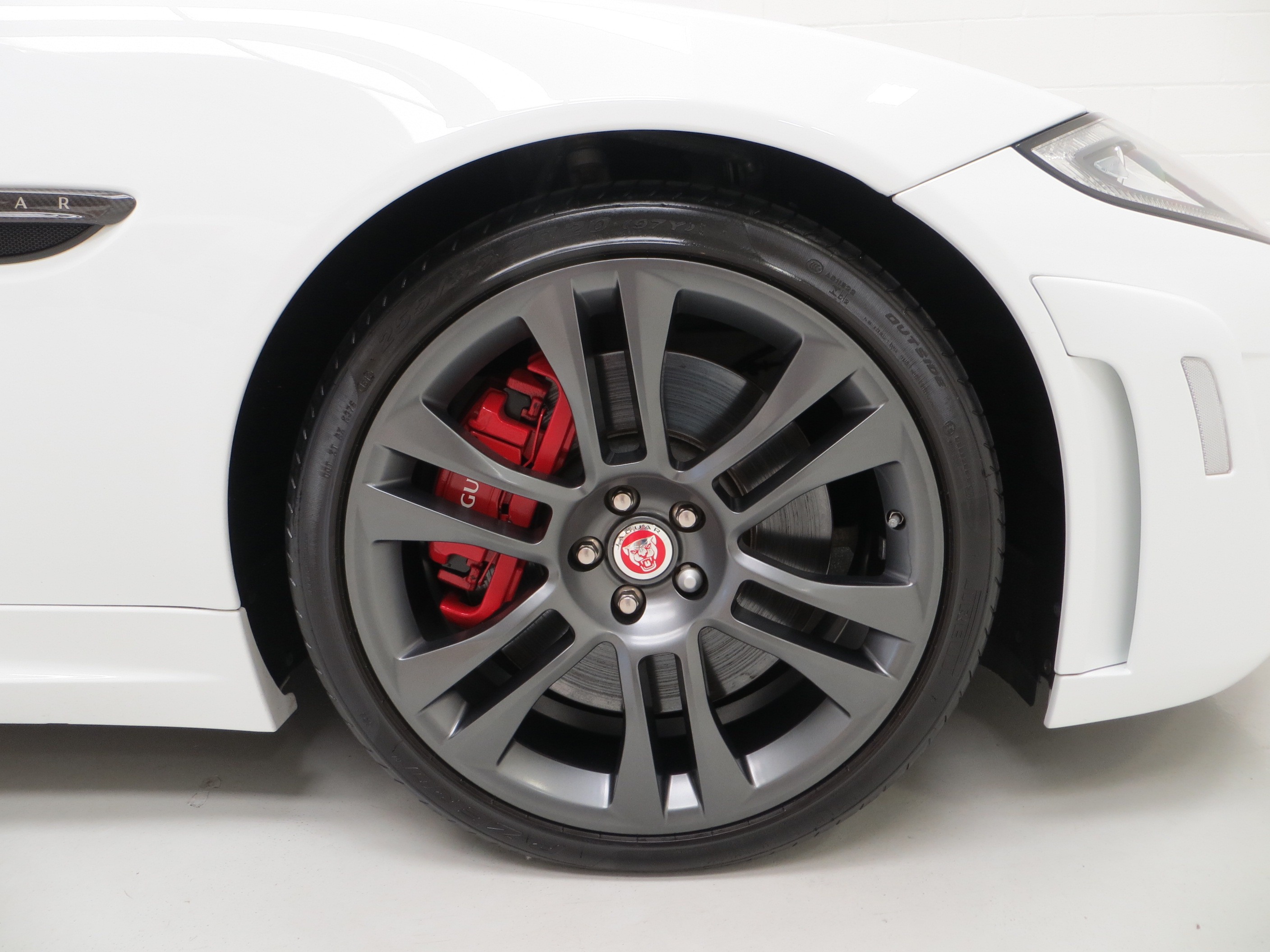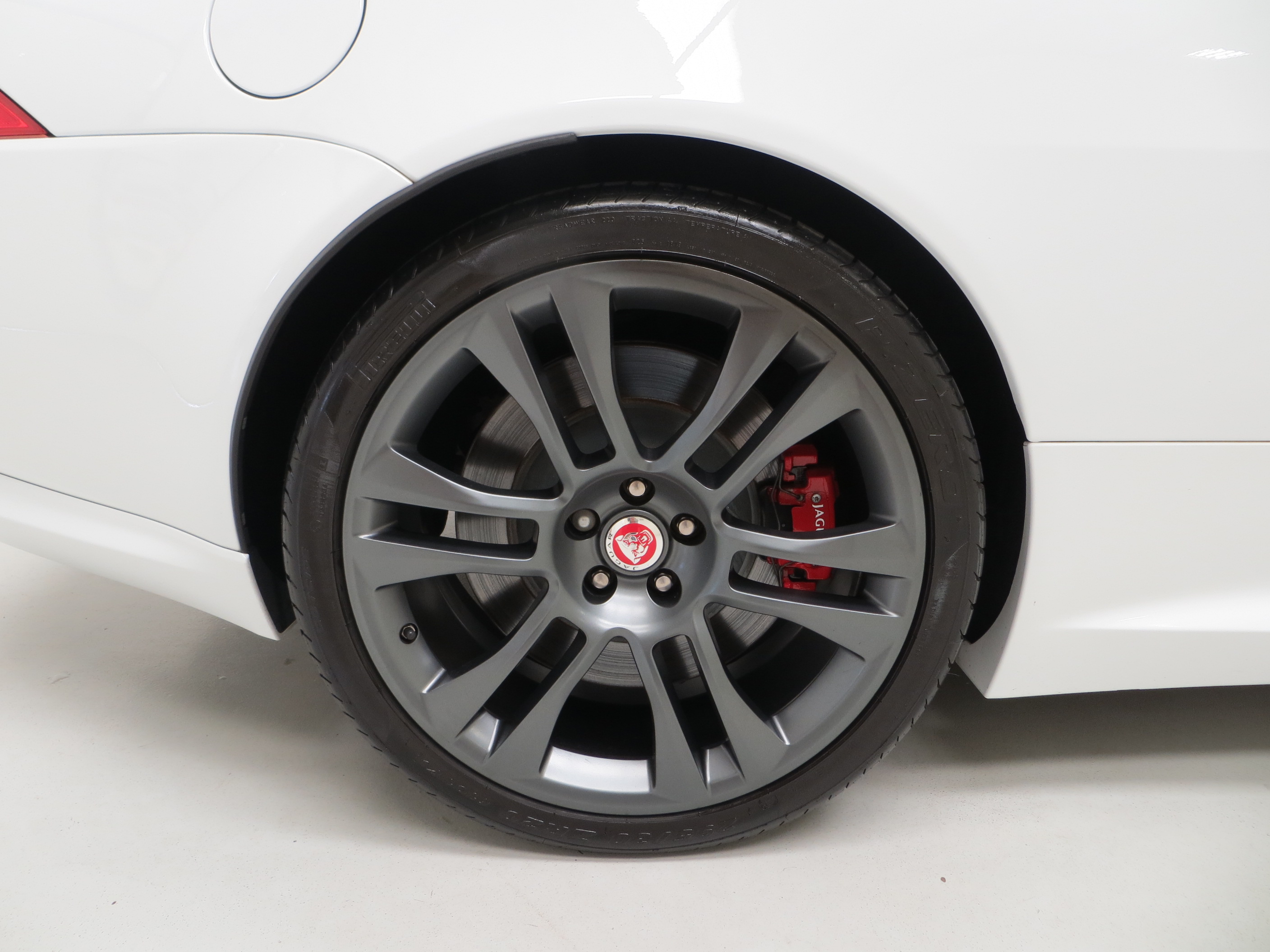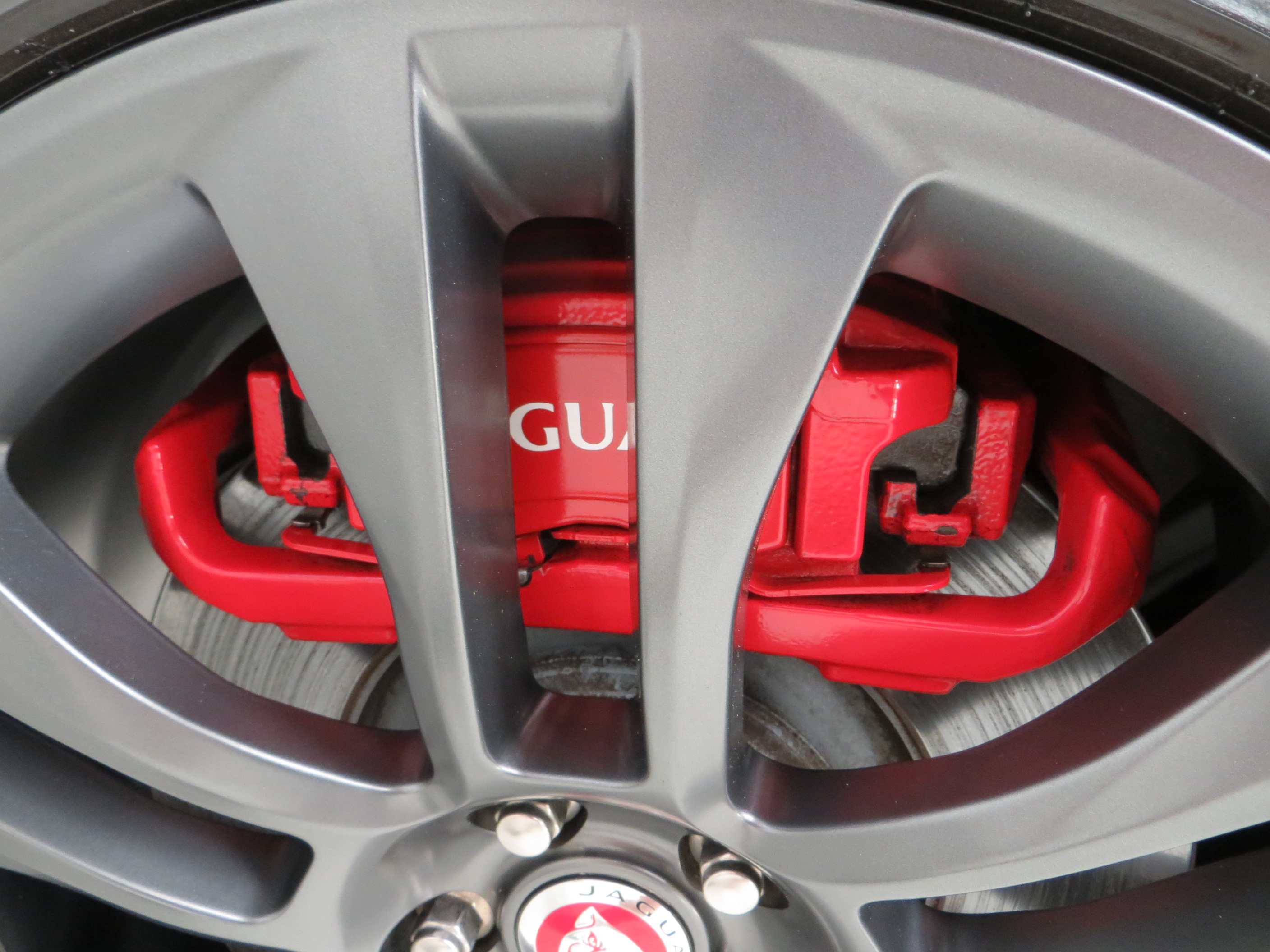 20” Vulcan lightweight forged alloy wheels reduce unsprung weight finished in Dark Technical finish and are unmarked. All four tyres are Pirelli P Zero 255/35 front and 295/30 ZR20 rear with ample tread. This powerful model is fitted with the Jaguar high performance braking system with ventilated 380mm front discs and 376mm ventilated rear discs. The result is being able to stop the car in 7.8 seconds from 186mph! Red aluminium brake calipers look awesome and complete the package.