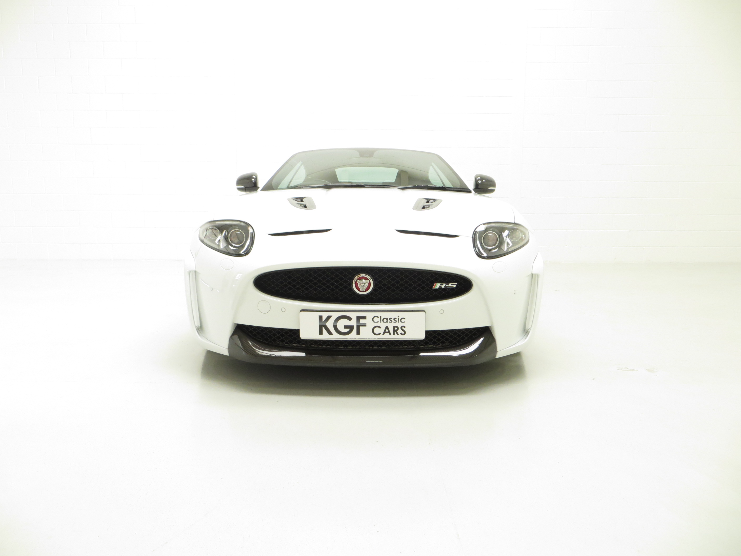 This sports car is finished in striking Polaris White, (Code NER), which contrasts beautifully against all the carbon fibre helping to achieve a bold and assertive stance. A unique front bumper with twin nacelles, broad vertical side vents and carbon fibre splitter are all unmarked. Extended side sills and a reduced ride height of 10mm along with carbon fibre technology on the exterior benefits airflow and aerodynamic performance. Leaving no doubt to the significance of this ultimate model is XKRS branding front and rear. The wheel arch apertures and underside reveal fair weather use only and pampered garage storage from new. This really is a very special example.