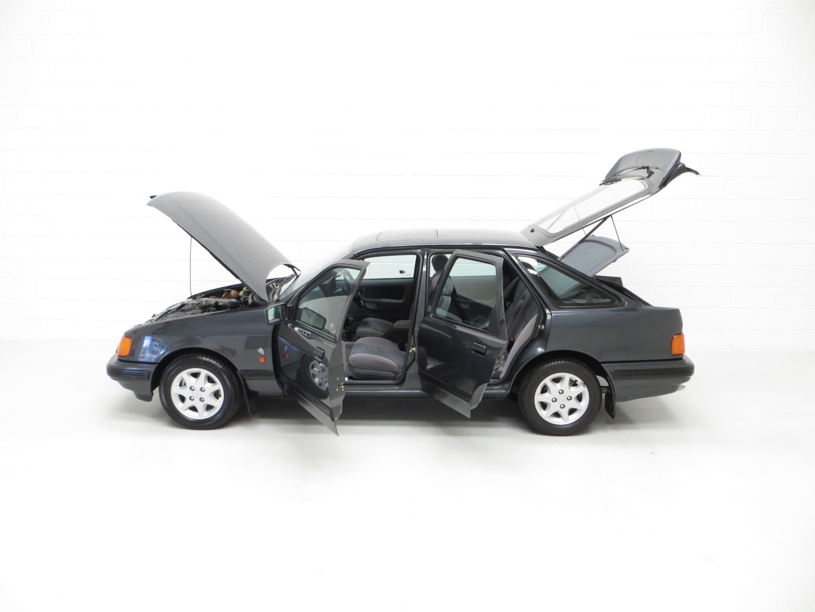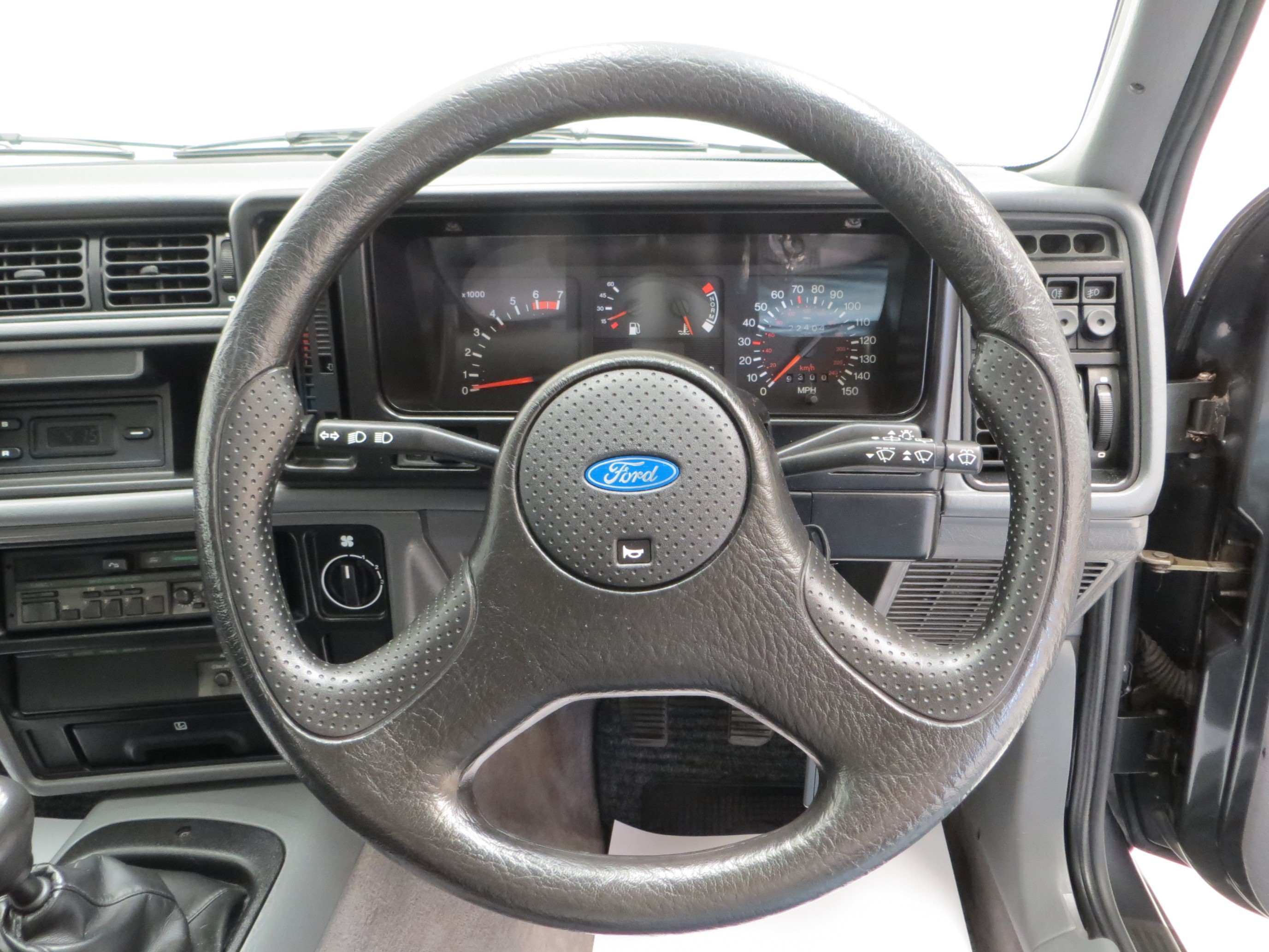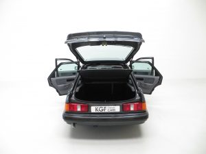 Representative of the incredibly low mileage is this beautifully clean and unspoilt interior, again in totally standard form. The plush Shadow Astral upholstery, (Code L1), is in fantastic order. The door cards in matching Astral/Starline fabric have virtually no shrinkage to the fabric, an otherwise very common occurrence, and there is a tiny nick to the driver’s door arm rest. Protected by genuine Ford carpet mats, the colour-keyed velour carpet is very clean and free from wear and the special soft cloth headlining is excellent with no sagging whatsoever. The fully intact dashboard has no cracks and all switchgear is functional and intact, including the original Ford stereo radio/cassette (Model 2007) and power amplifier. The spotless boot area has immaculate carpeting, an undamaged circular ply-board wheel cover and unused jack and all factory build stickers are intact. A very rare modern classic Ford remaining exactly as intended.