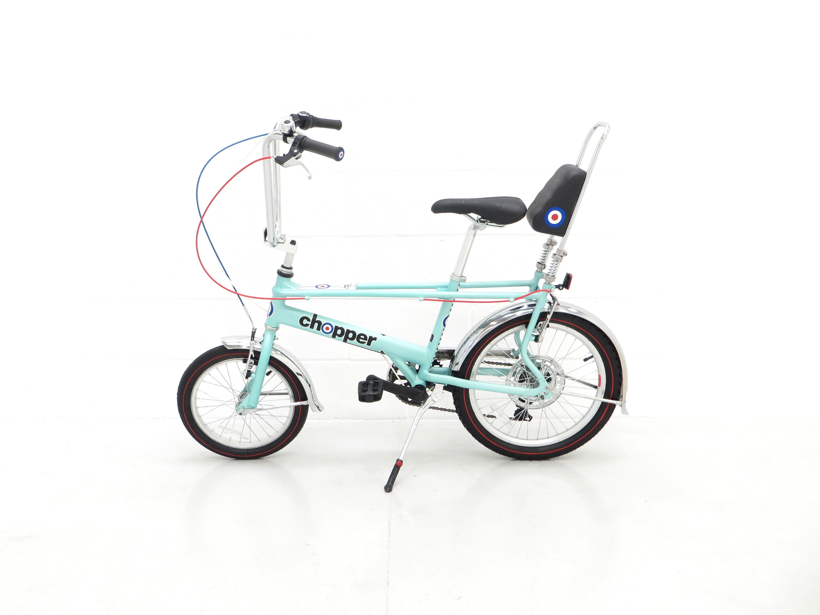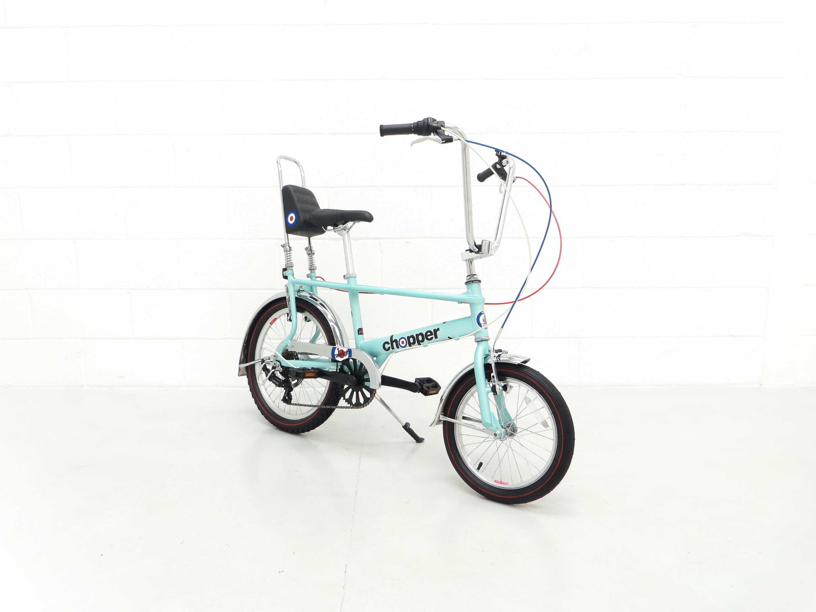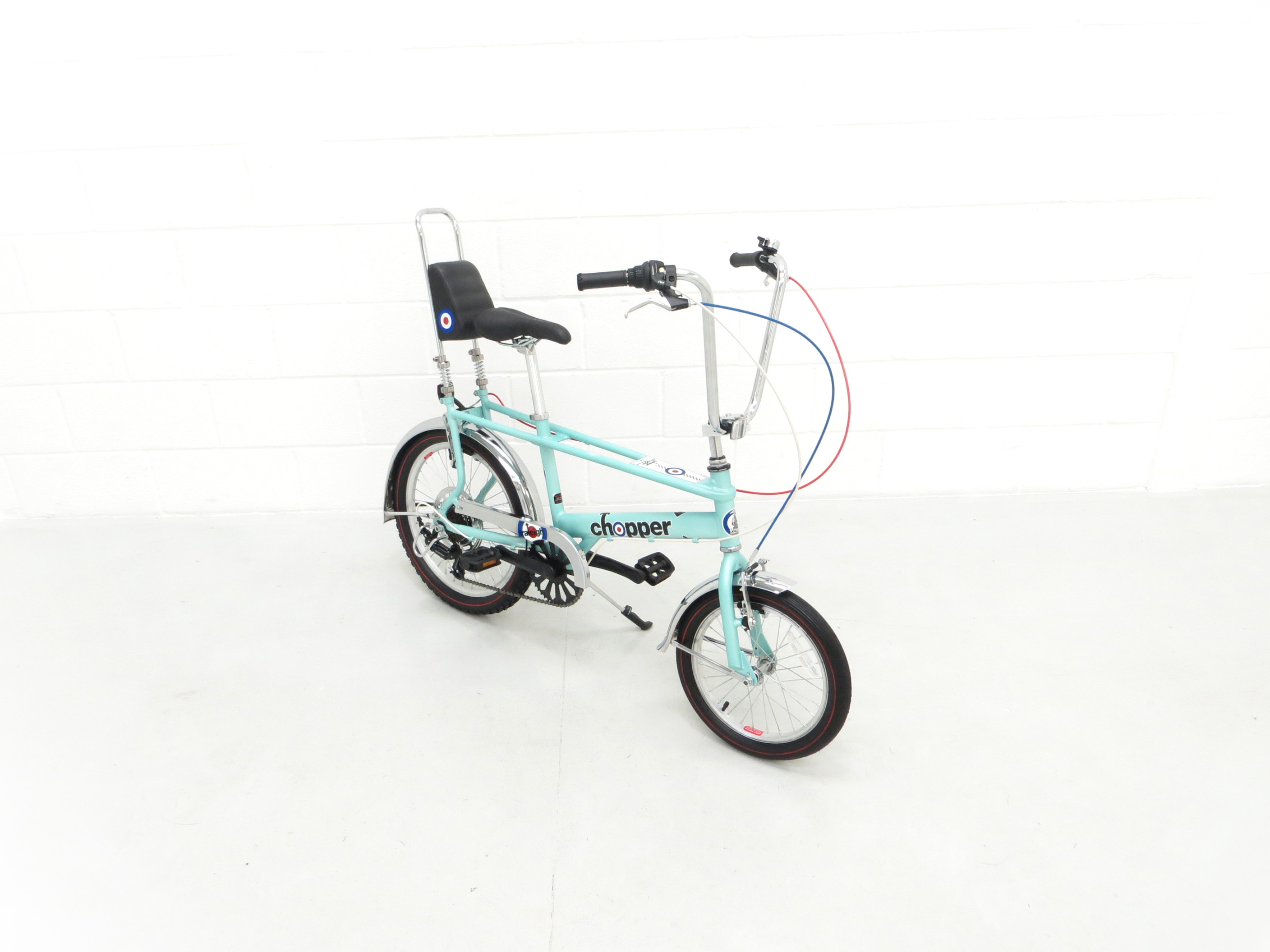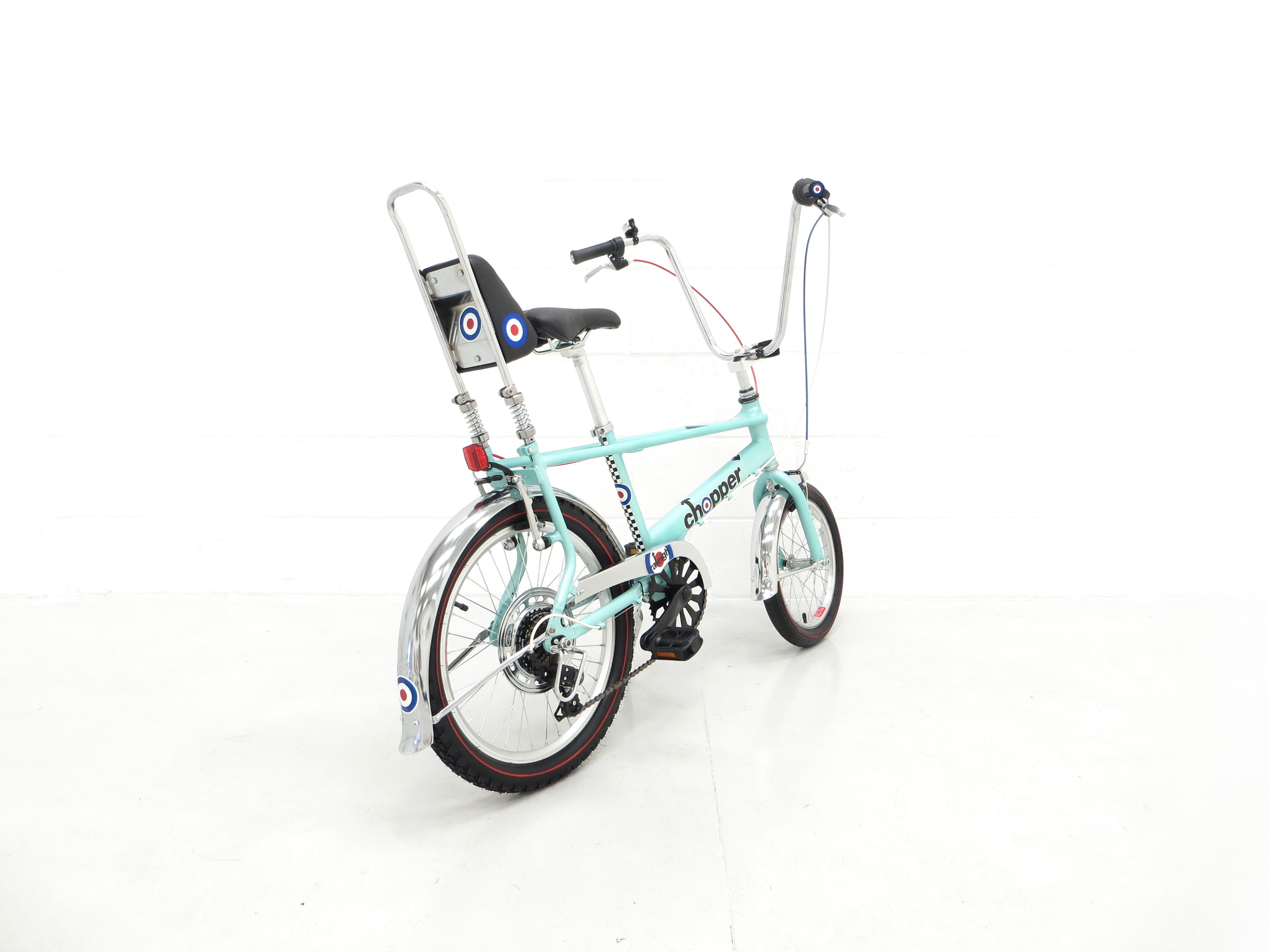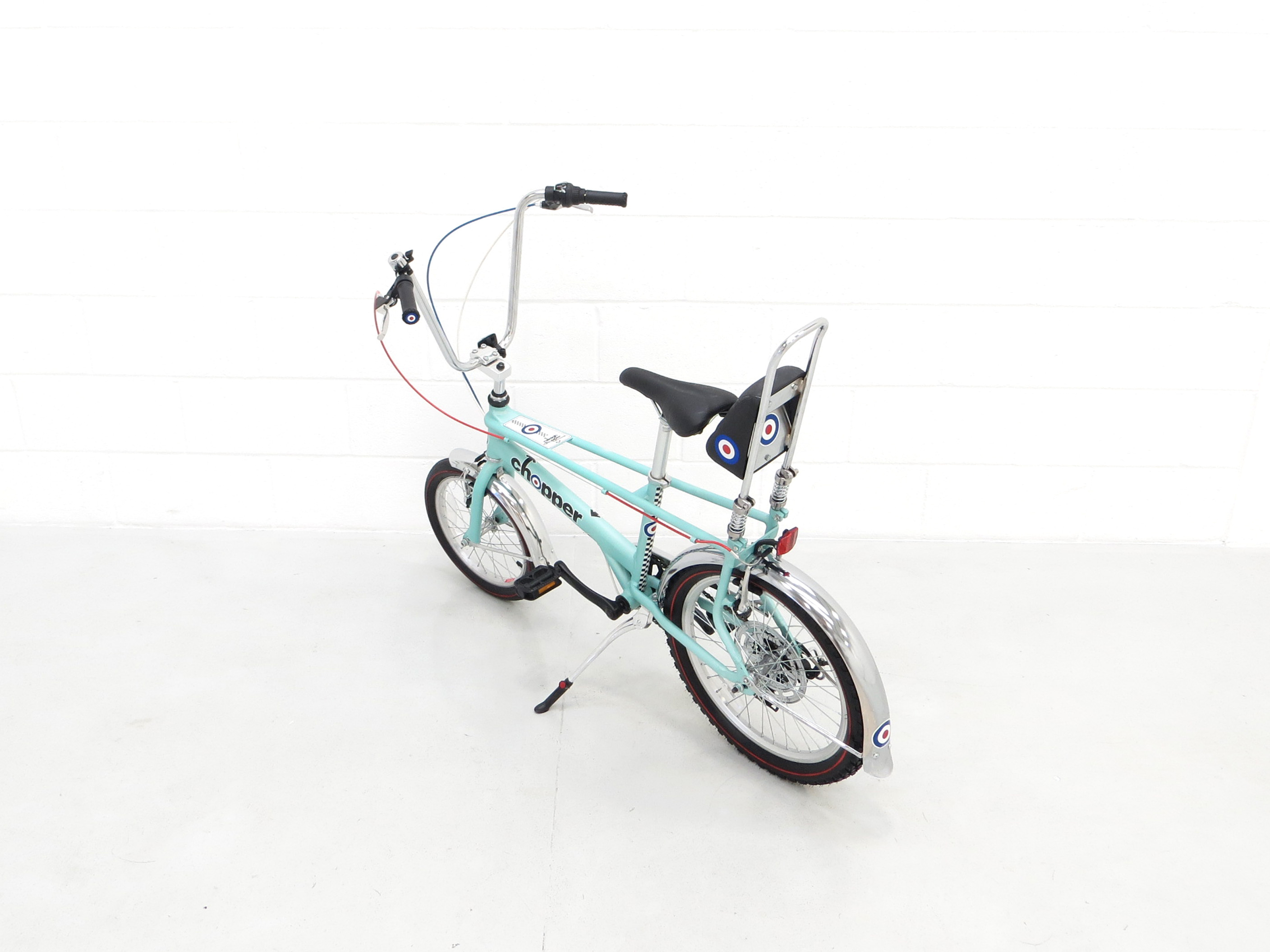 Fully assembled but never ridden, this very rare official UK Raleigh Mod Chopper Limited Edition represents a perfect collector’s item for Chopper fans all over the world. The Blue Matt finish to the frame is pristine and all Mod decals are as new. The explosion of the Mod subculture in the 1960’s and 70’s is perfectly reflected in this limited-edition Chopper with Roundel Target decals which were popularised largely by rock band The Who. The Roundel Target red, white and blue colours have been used on the brake/gear cable sheaths. Impossible to source and very expensive period Chopper tyres with the red pinstriping are fitted and are deliciously retro! Commensurate with the bike’s unridden credentials, this Raleigh Mod Chopper Limited Edition is in amazing order with only slight damage to the lower rear mudguard worthy of mention. What better to show your allegiance to the Mod cause, than a Mod emblazoned Raleigh Chopper!