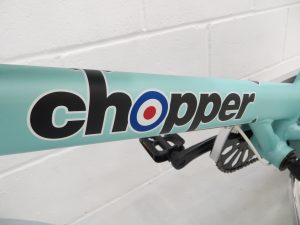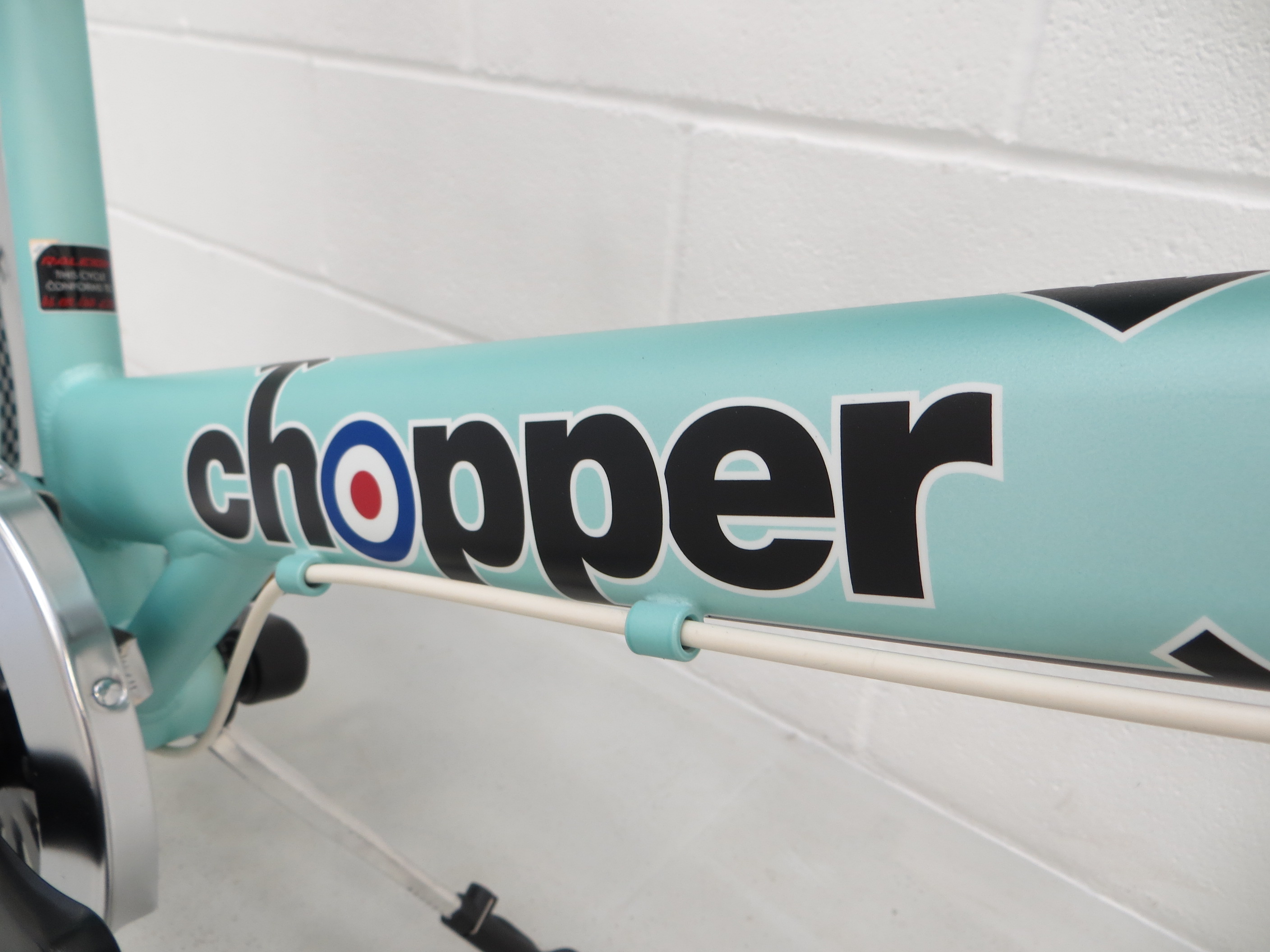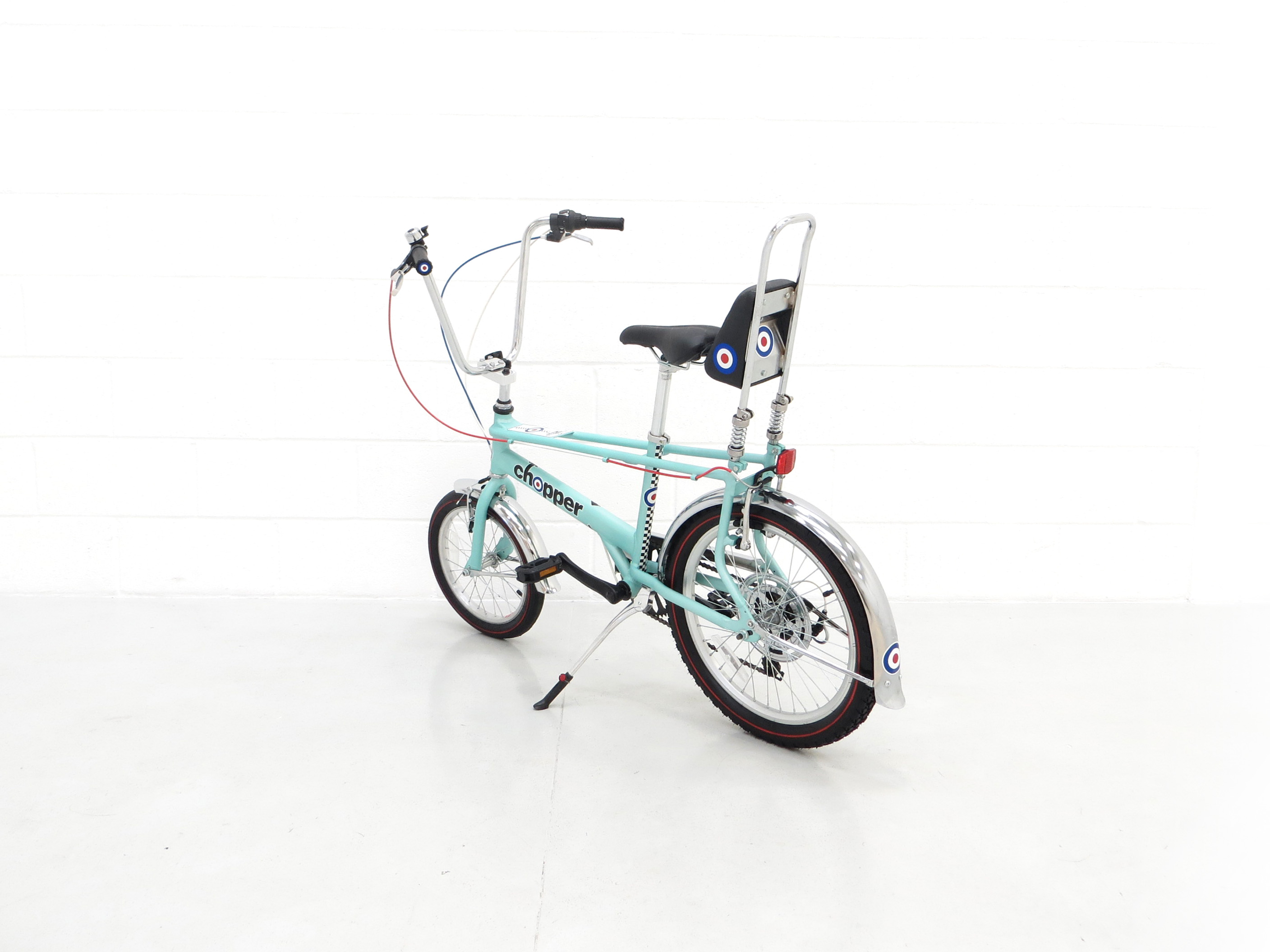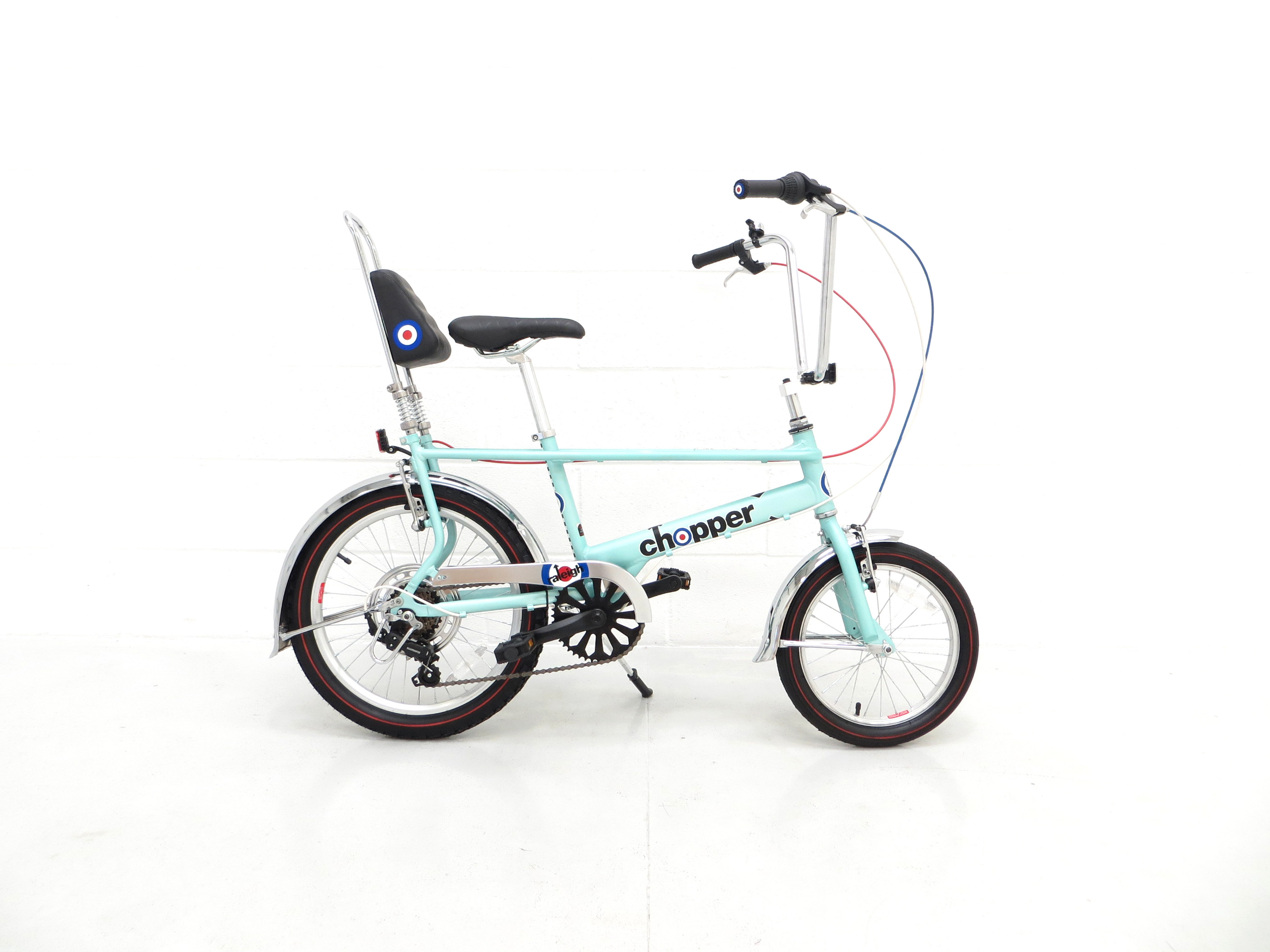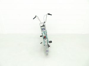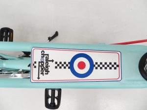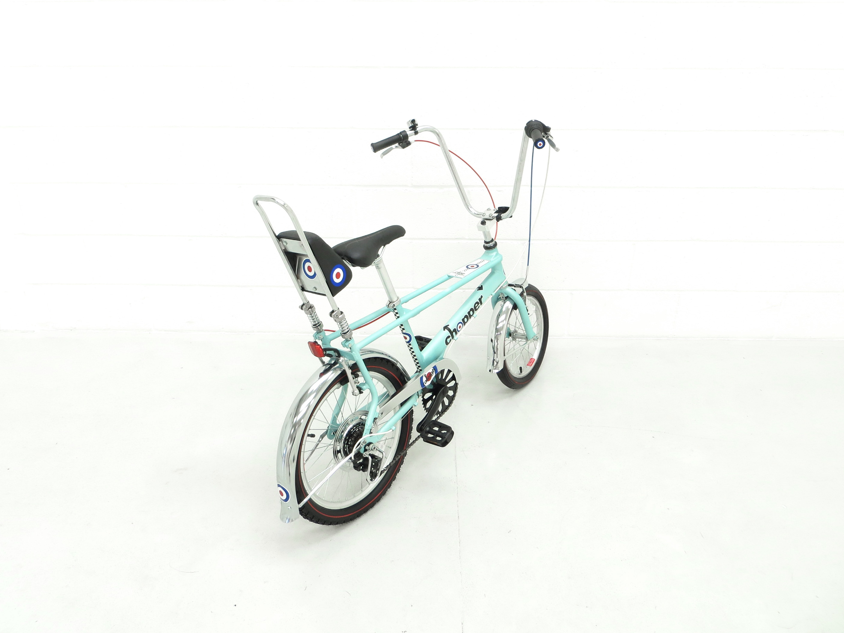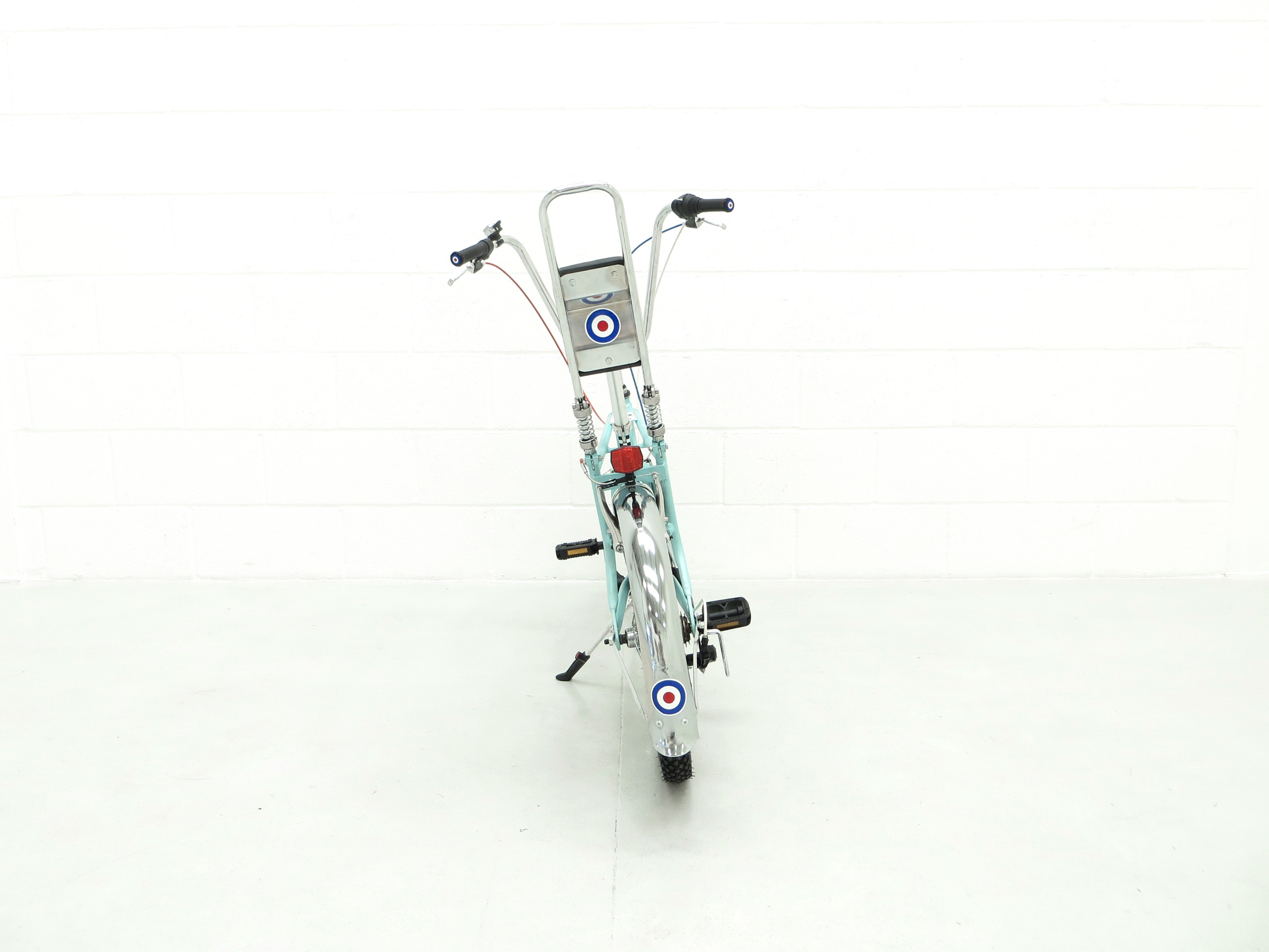 Fully assembled but never ridden, this very rare official UK Raleigh Mod Chopper Limited Edition represents a perfect collector’s item for Chopper fans all over the world. The Blue Matt finish to the frame is pristine and all Mod decals are as new. The explosion of the Mod subculture in the 1960’s and 70’s is perfectly reflected in this limited-edition Chopper with Roundel Target decals which were popularised largely by rock band The Who. The Roundel Target red, white and blue colours have been used on the brake/gear cable sheaths. Impossible to source and very expensive period Chopper tyres with the red pinstriping are fitted and are deliciously retro! Commensurate with the bike’s unridden credentials, this Raleigh Mod Chopper Limited Edition is in amazing order with only slight damage to the lower rear mudguard worthy of mention. What better to show your allegiance to the Mod cause, than a Mod emblazoned Raleigh Chopper!