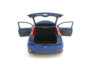Inside this white-hot Ford are a pair of body-hugging Sparco road-race seats swathed in luxurious Racing Black and Blue Leather and Black Alcantara, (Code AR). The RS and Sparco logos are embossed and stitched into the upholstery, and this coupled with the aluminium fittings, push button start and numbered plaque, leave you with little doubt this is no ordinary Focus! The interior is beautifully preserved and the seats are free from damage, have firm bolsters all-round and only a tiny area of bobbling to the Alcantara driver’s seat bolster. The steering wheel blue leather, a known weak point, is still bright retaining its colour. The RS front carpet mats remain fitted. Ford built this car to truly delight its motorsport loving RS devoted fan base and the long-awaited car did not disappoint.