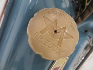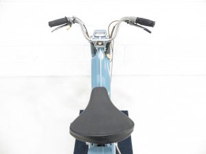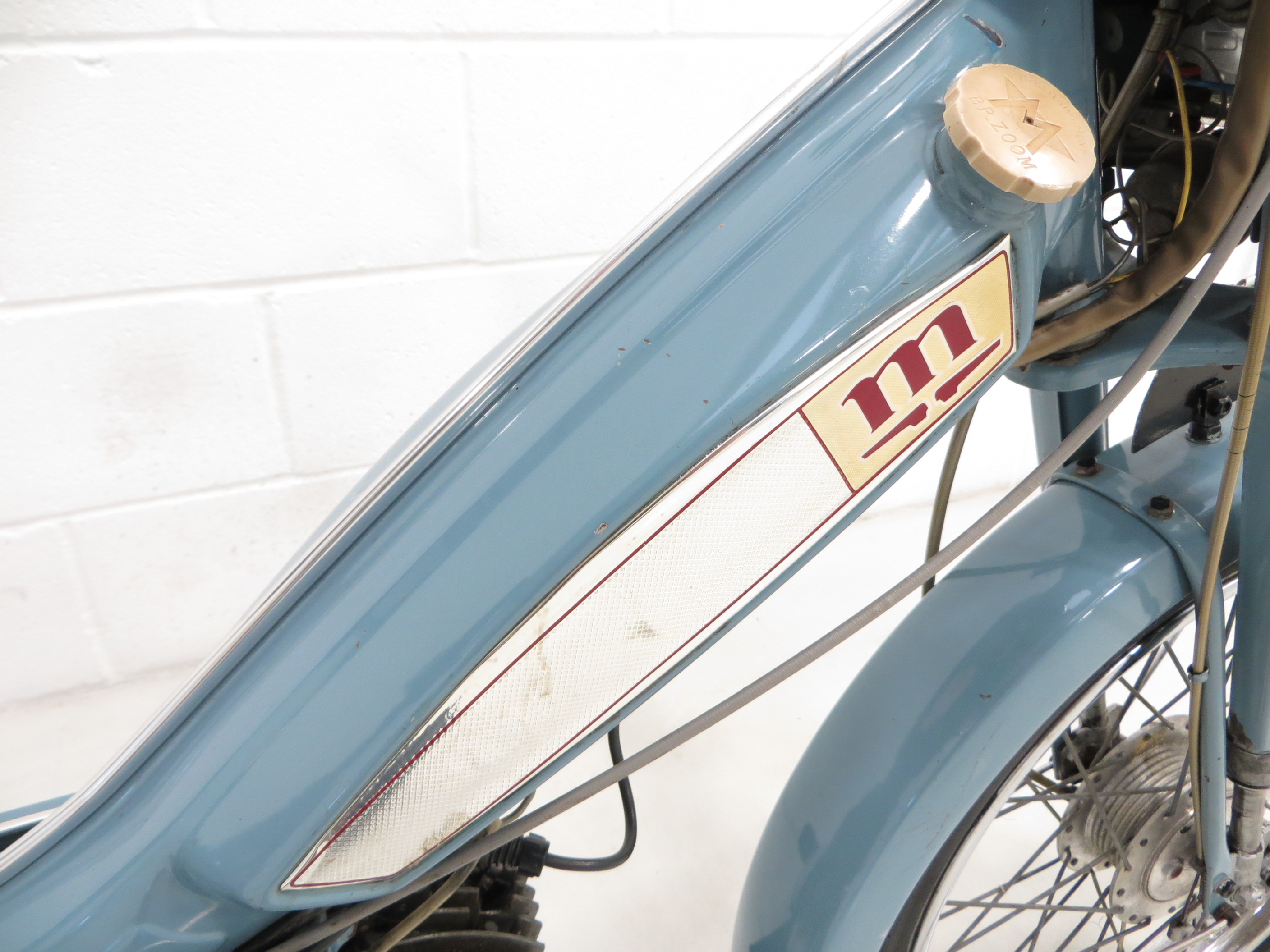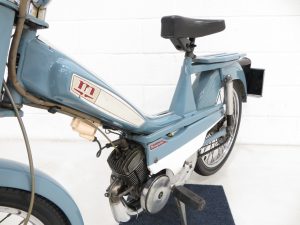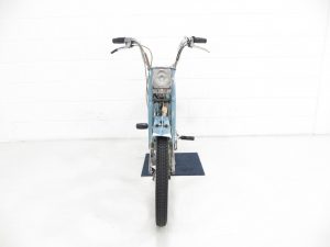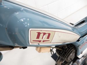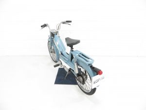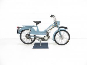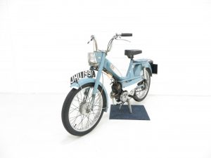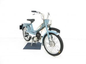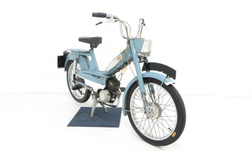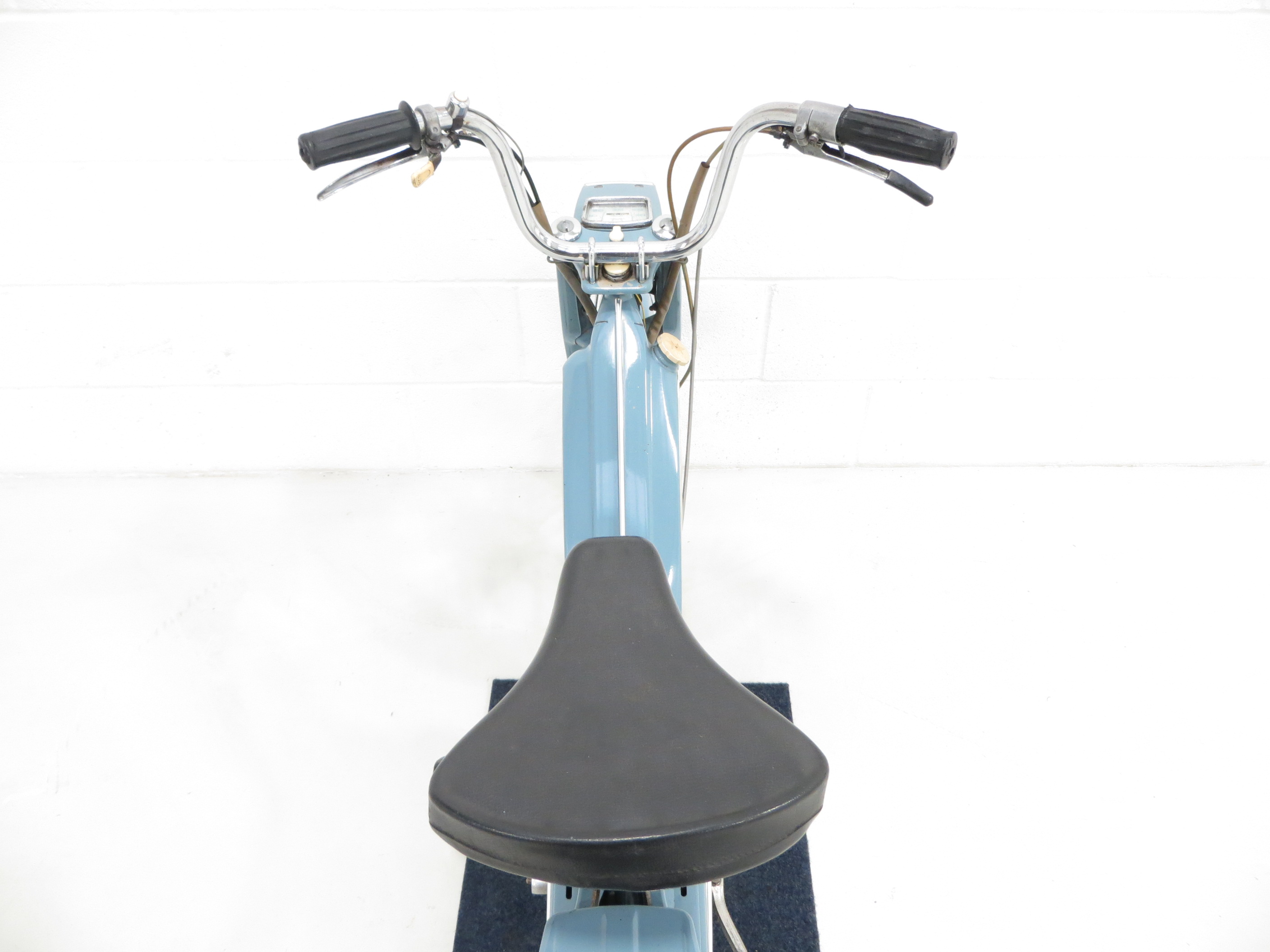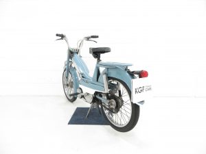 The Mobylette affectionately known as ‘Moby’ was made by the French manufacturer Motobécane with production lasting from 1949 to 1997. This 1972 AV50 model is wonderfully preserved in original condition having been kept by the original owner until 2014! The factory Bleue (light blue) paintwork is remarkably good with faint age related markings which have been left untreated in order to uphold originality. The decals and badges have remained intact and exactly as the maker intended. The pristine wide seat is surprisingly comfortable. Virtually impossible to replace features such as the correct ‘M’ stamped pedals and BP Zoom filler cap remain fitted. The lights, gauge and push button horn all work perfectly. Guaranteed to raise a smile!