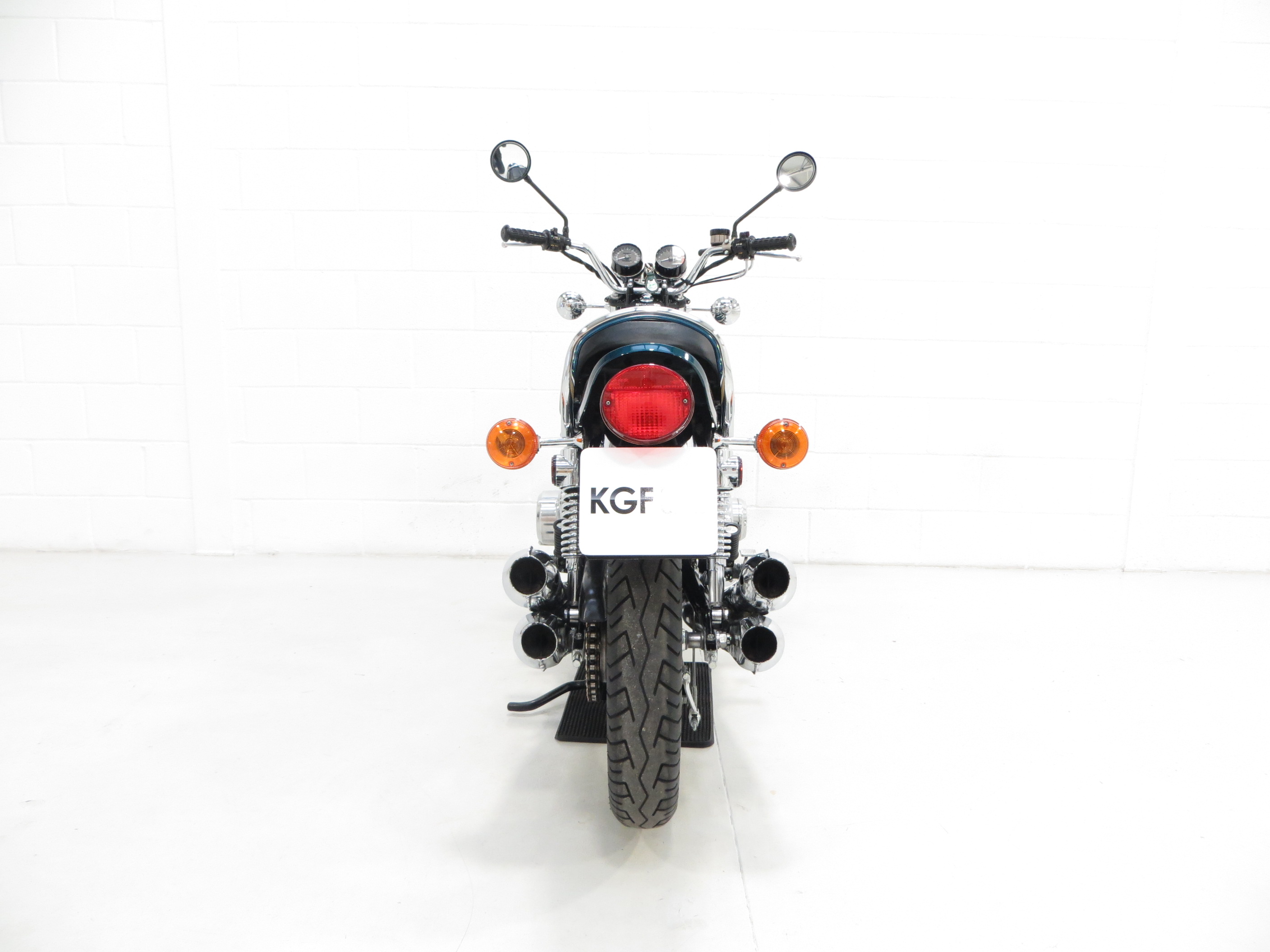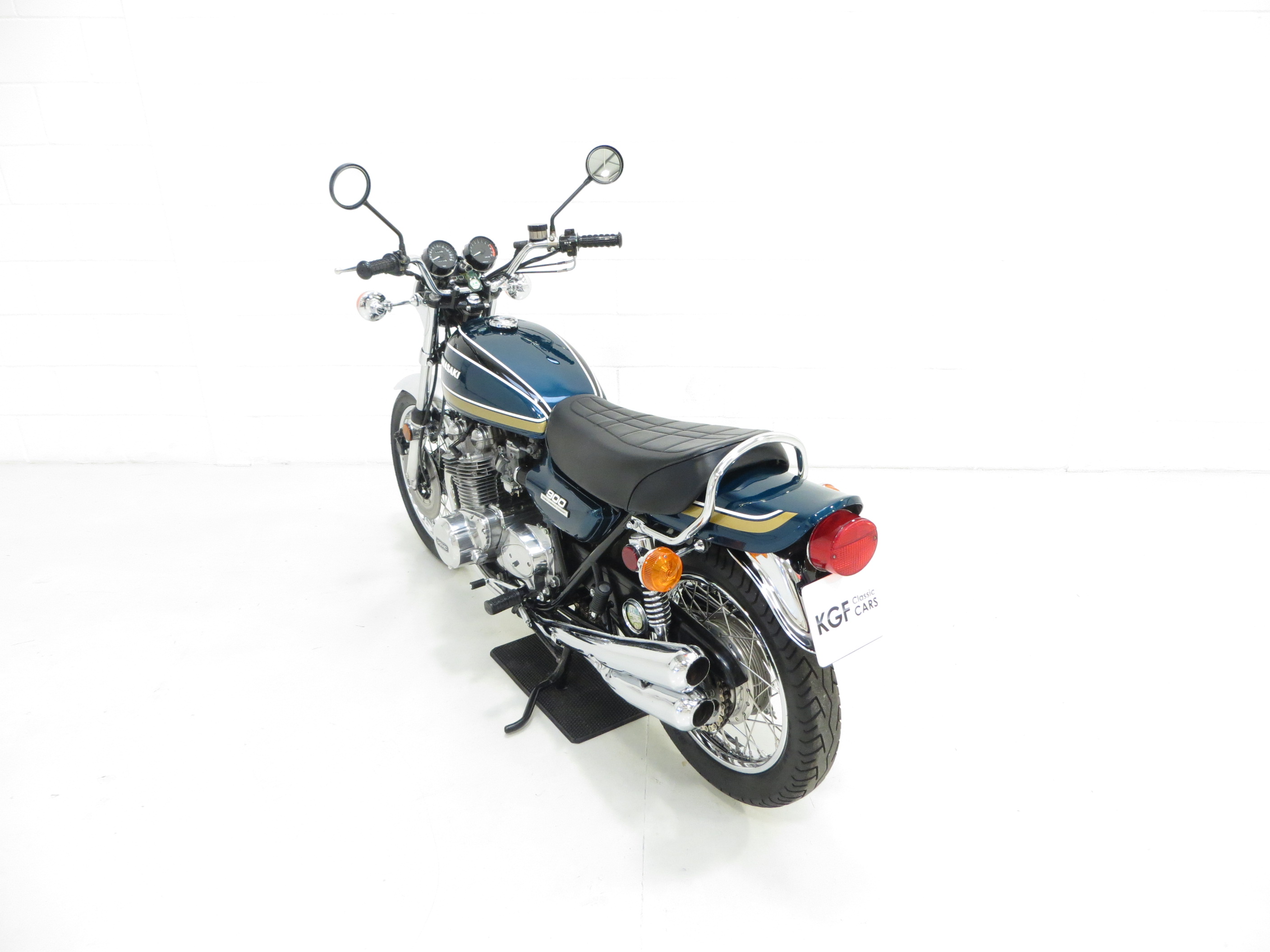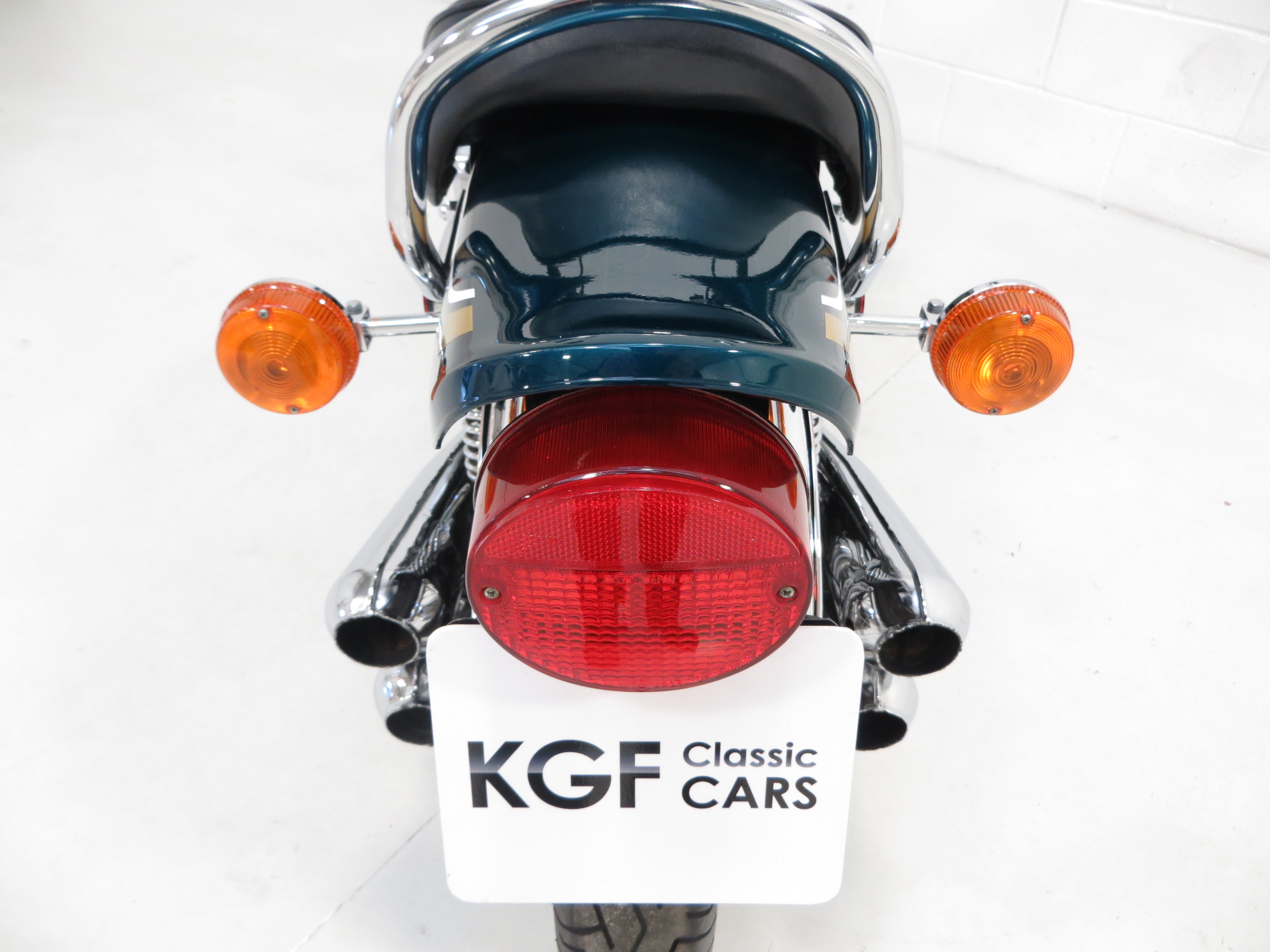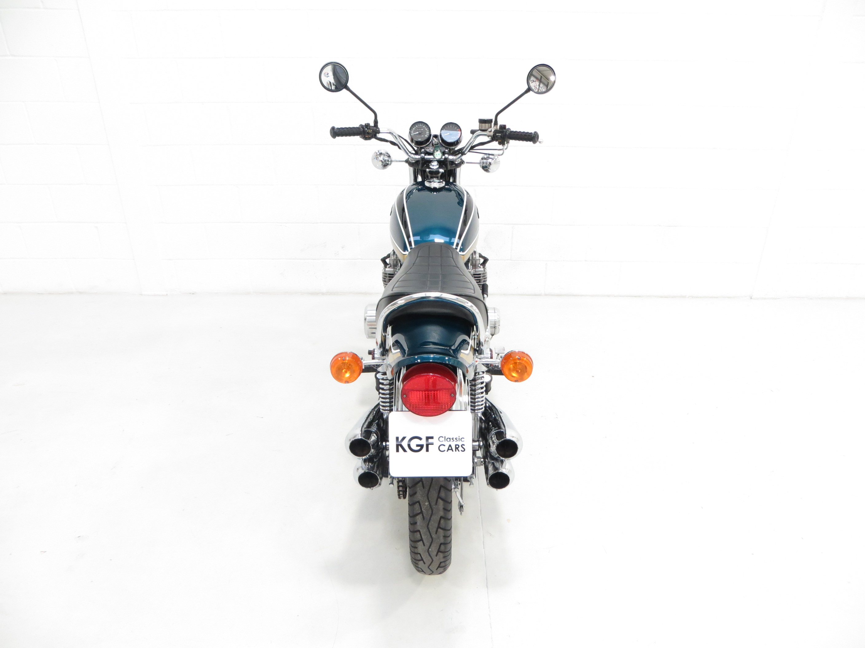 Finished in the unique for the Z1B model and highly desirable, Candy Super Blue, the finish on this motorcycle is stunning. The attention to detail can be seen with correct and exact decals such as the broad gold stripe, with a thin white stripe above it, running along the bottom of the fuel tank and continuing along the tailpiece curving upwards at the rear. Beautifully detailed, but not to the detriment of originality, this example is a useable showpiece. Purists will notice the correct Z1B attributes such as the speedometer calibrated in increments of 10mph and the side cover nomenclature DOUBLE OVERHEAD CAMSHAFT in black lettering inset into an alloy background. All the chrome has a mirror finish and the lower swing arm has some minor stone chips. The original instrument cowling finished in black are included. The frame number is clearly stamped and correct. The original ornate four exit exhaust system still has the KHI 900Z part numbers visible on this matching numbers bike. Iconic in every way.