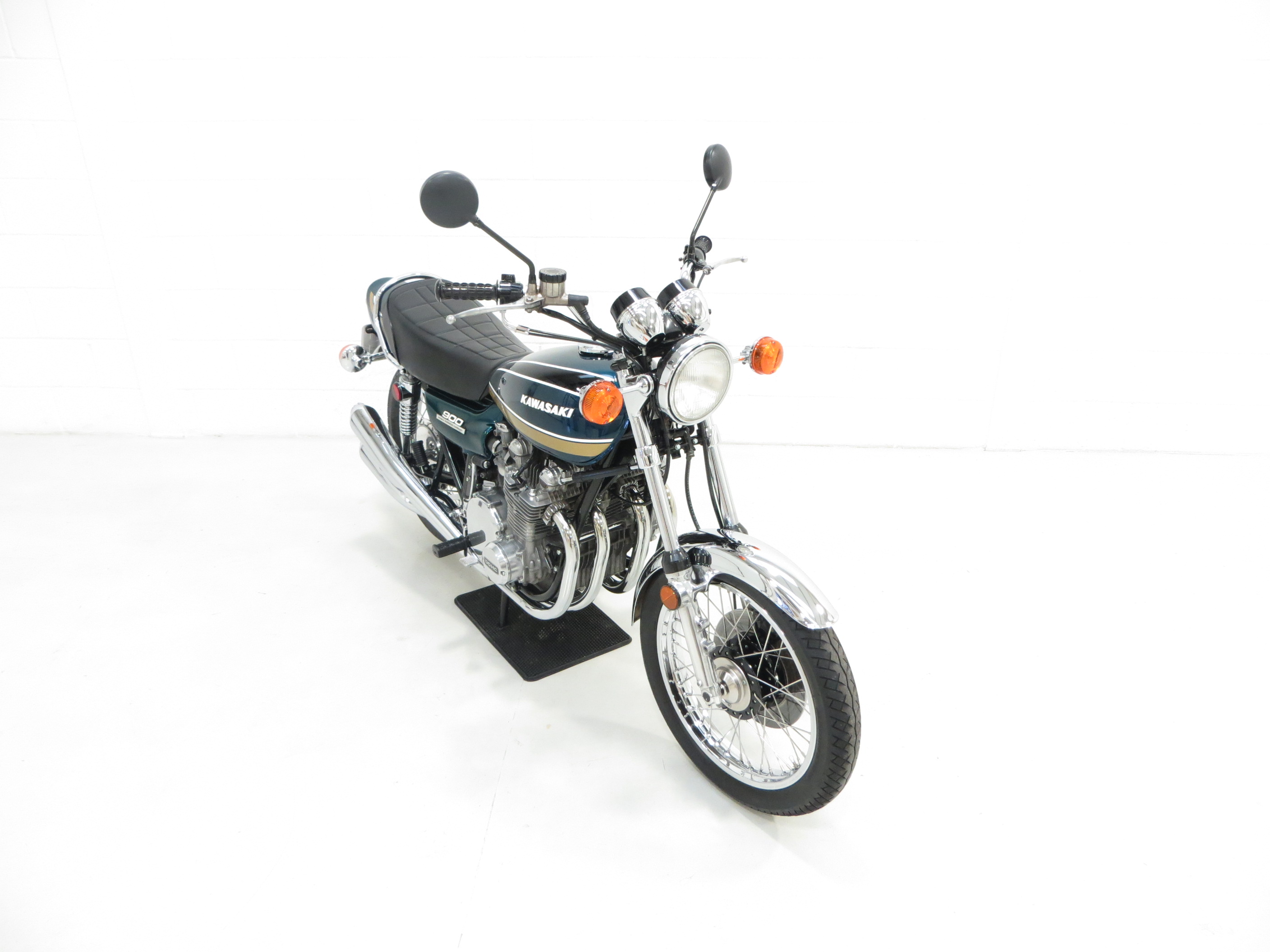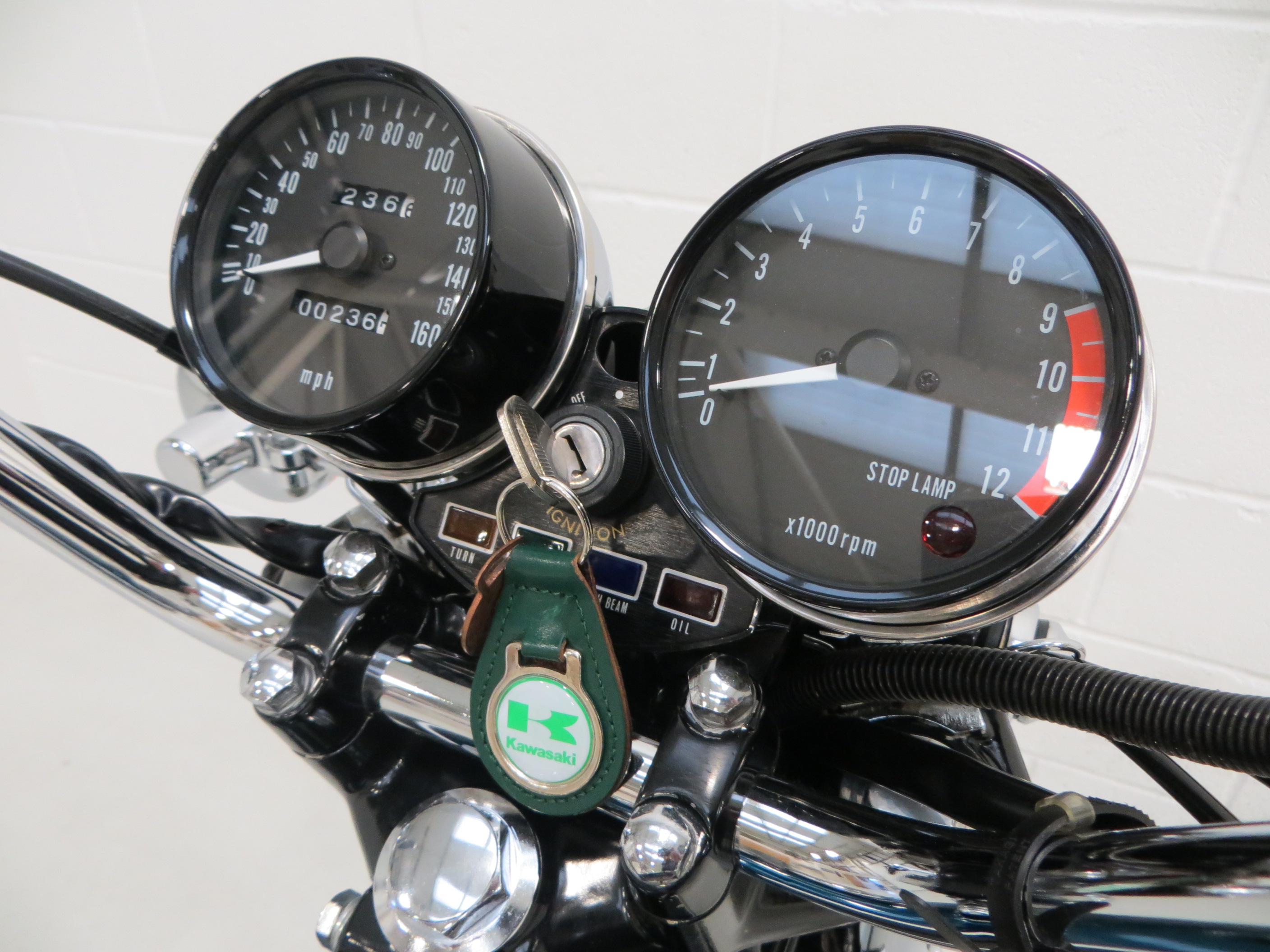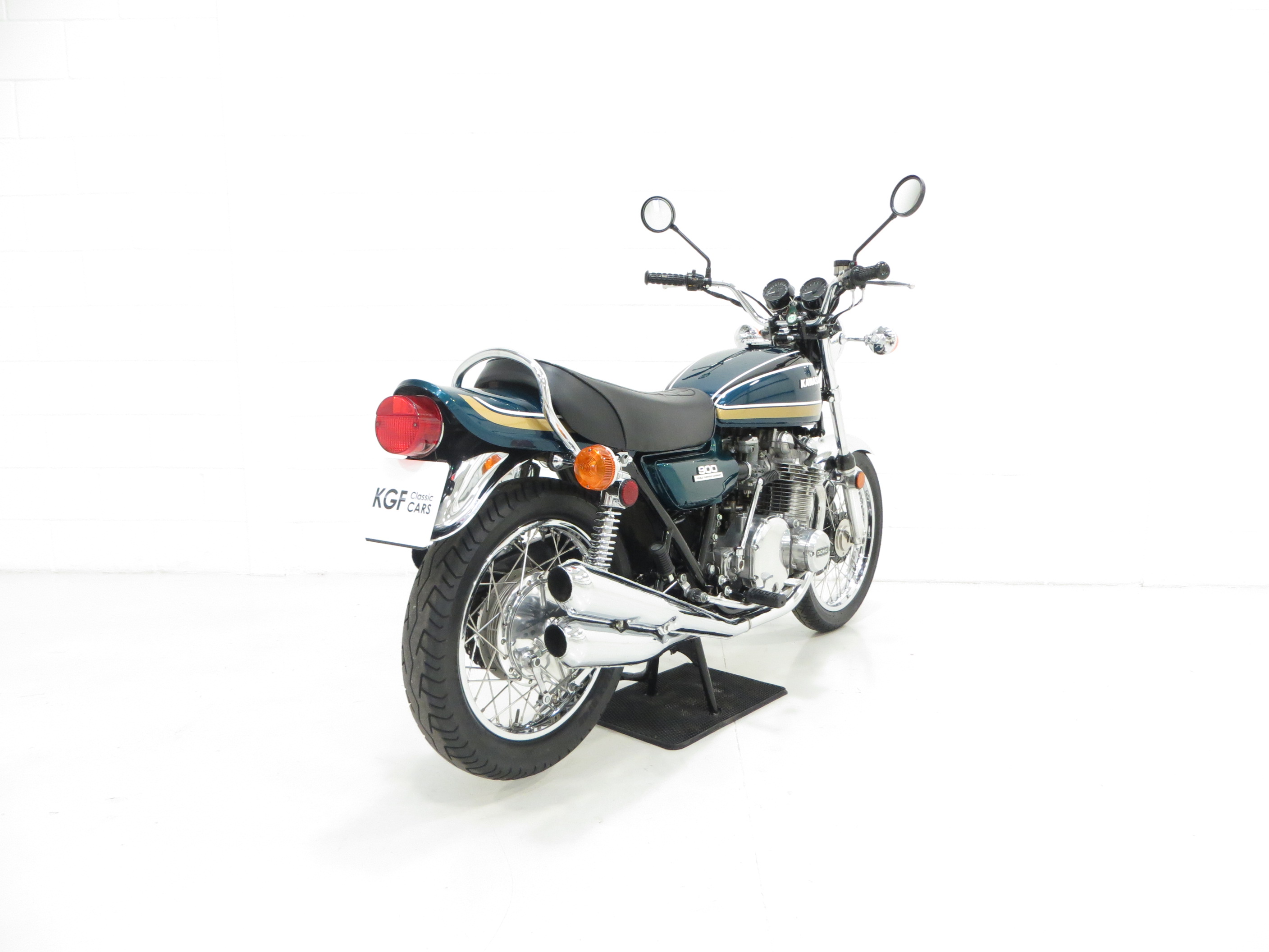 Finished in the unique for the Z1B model and highly desirable, Candy Super Blue, the finish on this motorcycle is stunning. The attention to detail can be seen with correct and exact decals such as the broad gold stripe, with a thin white stripe above it, running along the bottom of the fuel tank and continuing along the tailpiece curving upwards at the rear. Beautifully detailed, but not to the detriment of originality, this example is a useable showpiece. Purists will notice the correct Z1B attributes such as the speedometer calibrated in increments of 10mph and the side cover nomenclature DOUBLE OVERHEAD CAMSHAFT in black lettering inset into an alloy background. All the chrome has a mirror finish and the lower swing arm has some minor stone chips. The original instrument cowling finished in black are included. The frame number is clearly stamped and correct. The original ornate four exit exhaust system still has the KHI 900Z part numbers visible on this matching numbers bike. Iconic in every way.