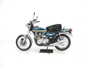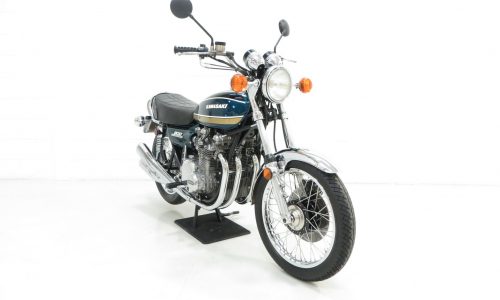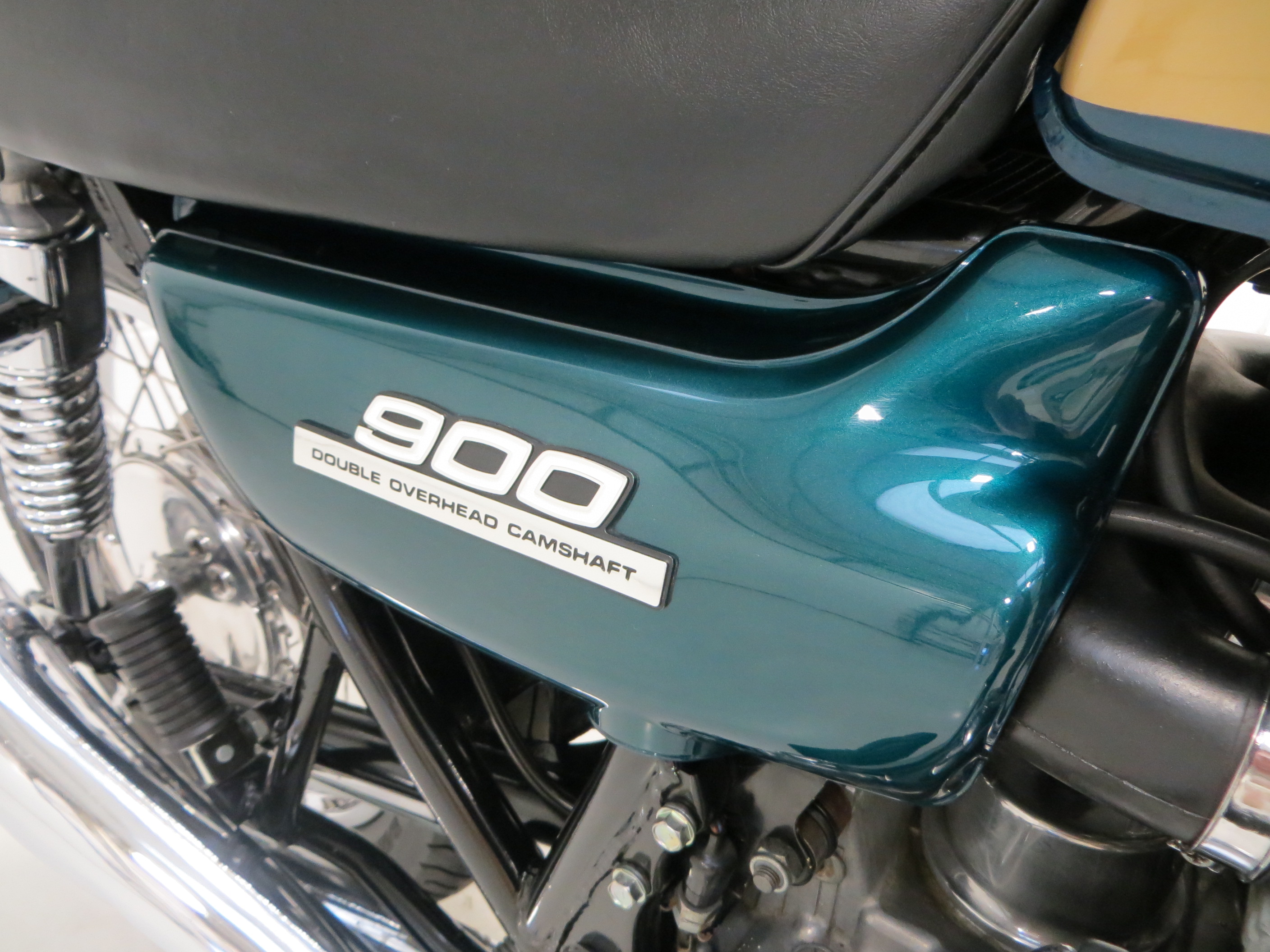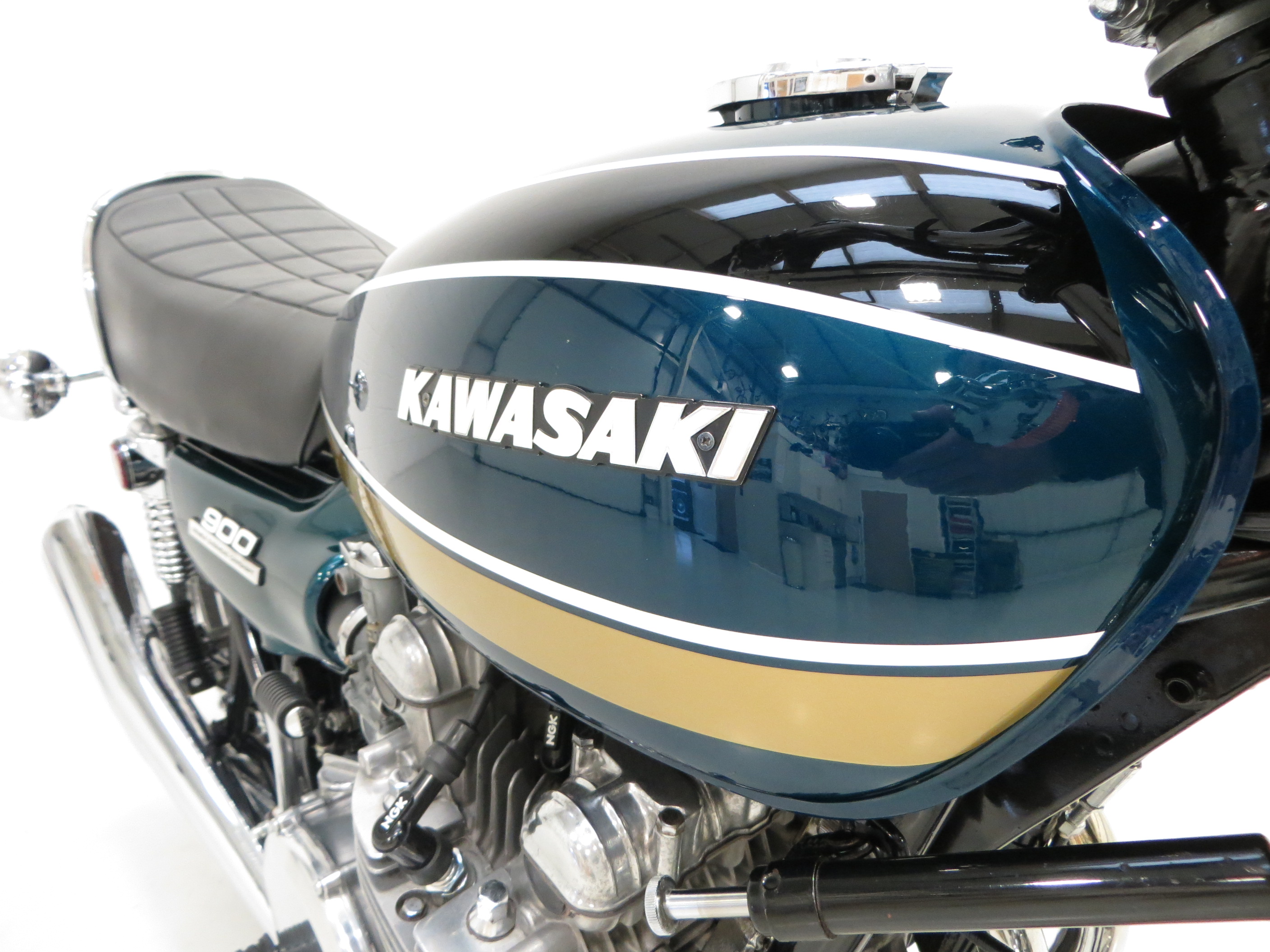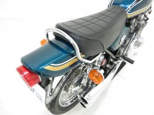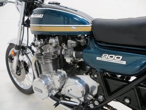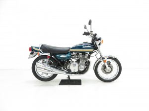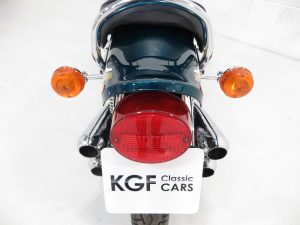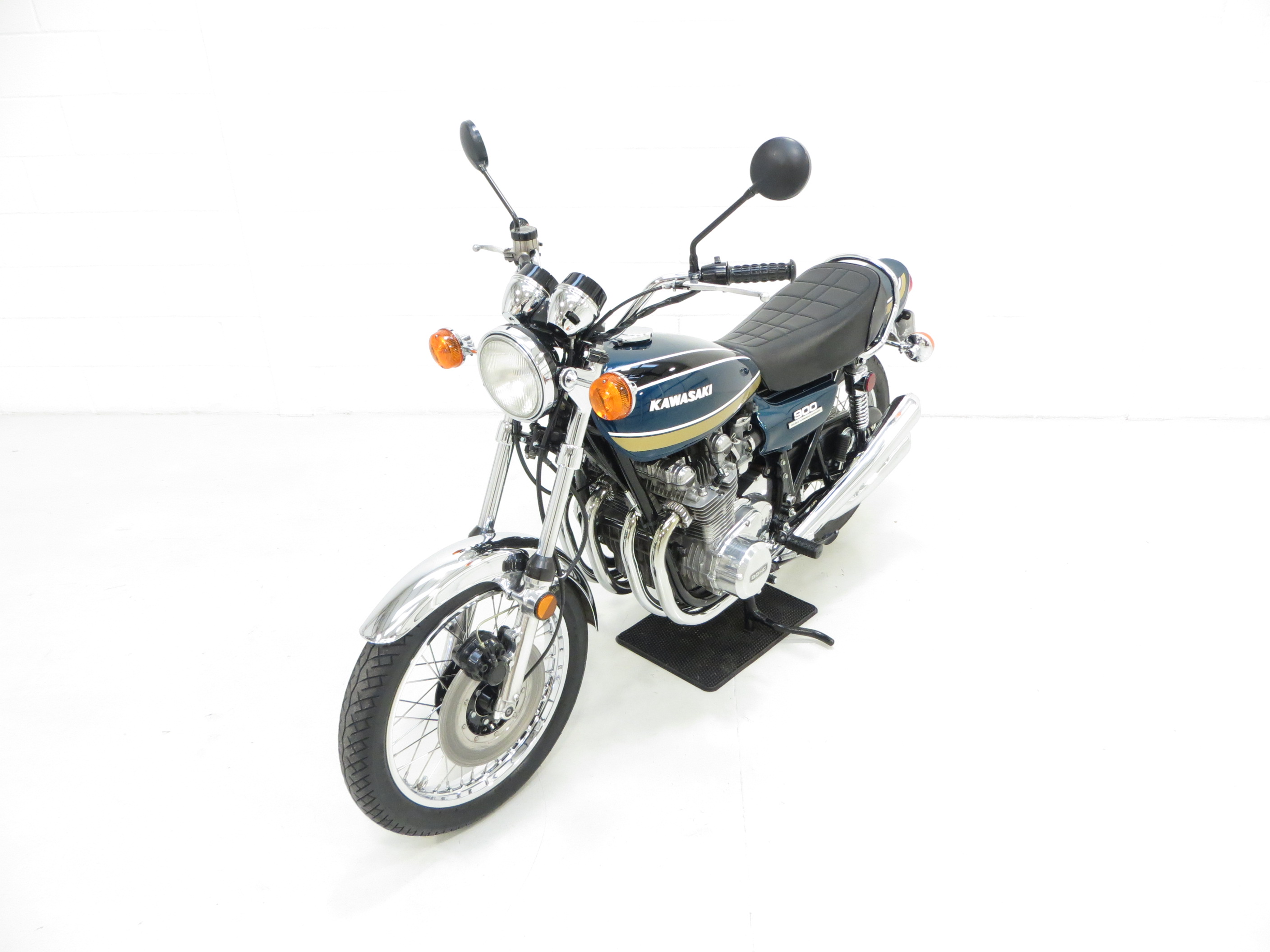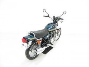 Finished in the unique for the Z1B model and highly desirable, Candy Super Blue, the finish on this motorcycle is stunning. The attention to detail can be seen with correct and exact decals such as the broad gold stripe, with a thin white stripe above it, running along the bottom of the fuel tank and continuing along the tailpiece curving upwards at the rear. Beautifully detailed, but not to the detriment of originality, this example is a useable showpiece. Purists will notice the correct Z1B attributes such as the speedometer calibrated in increments of 10mph and the side cover nomenclature DOUBLE OVERHEAD CAMSHAFT in black lettering inset into an alloy background. All the chrome has a mirror finish and the lower swing arm has some minor stone chips. The original instrument cowling finished in black are included. The frame number is clearly stamped and correct. The original ornate four exit exhaust system still has the KHI 900Z part numbers visible on this matching numbers bike. Iconic in every way.