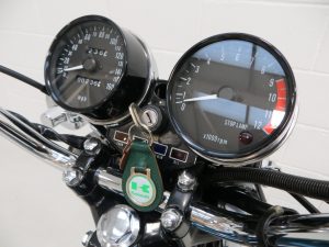 This Z900 retains its beautiful original chrome Takasago wire wheels in exceptional condition and shod in premium Bridgestone 100/90-19 front and 120/90-18 rear tyres. A hydraulically operated single 296mm disc and rod operated 200mm single leading shoe drum brake stop this powerful bike safely.
