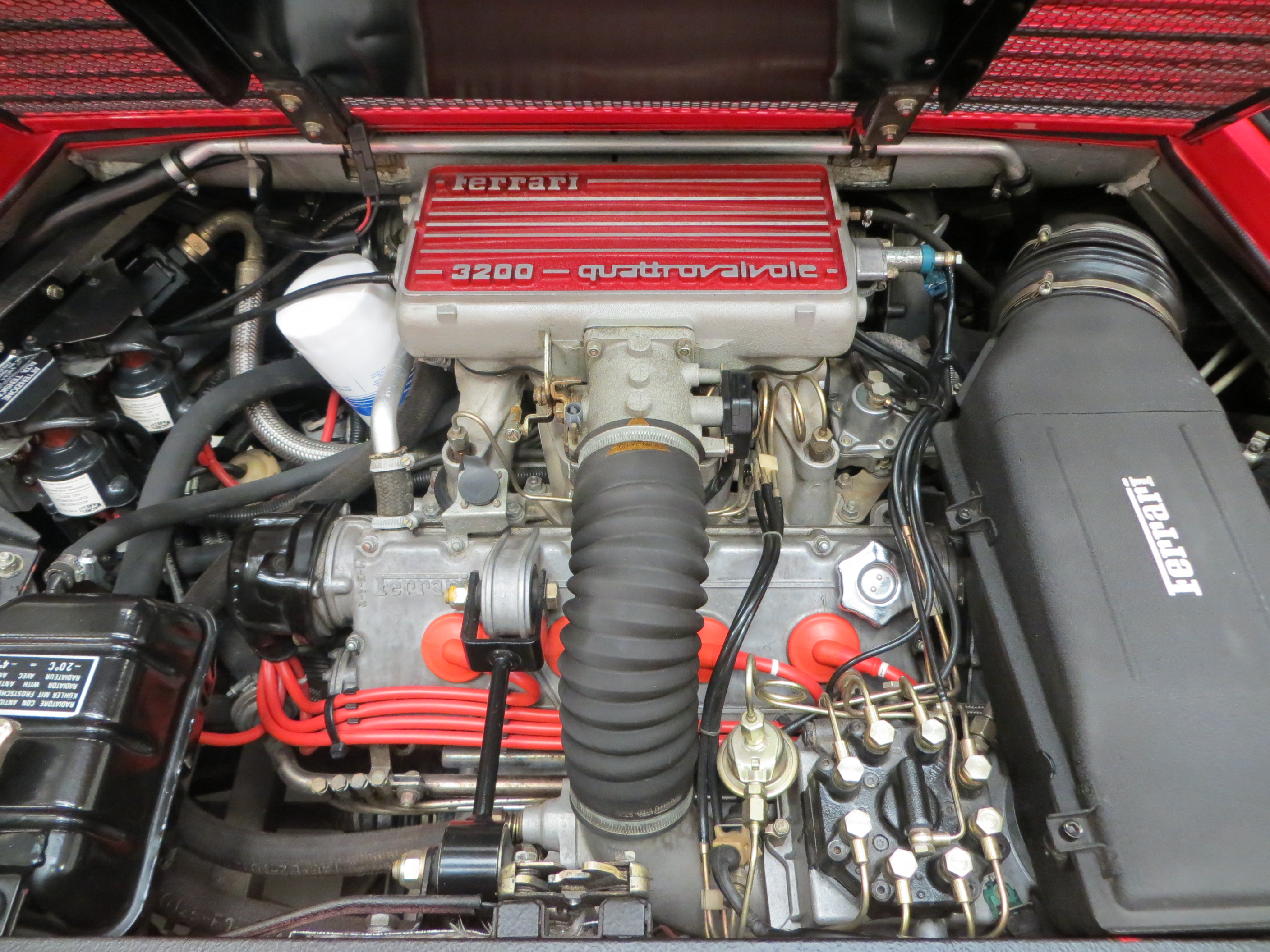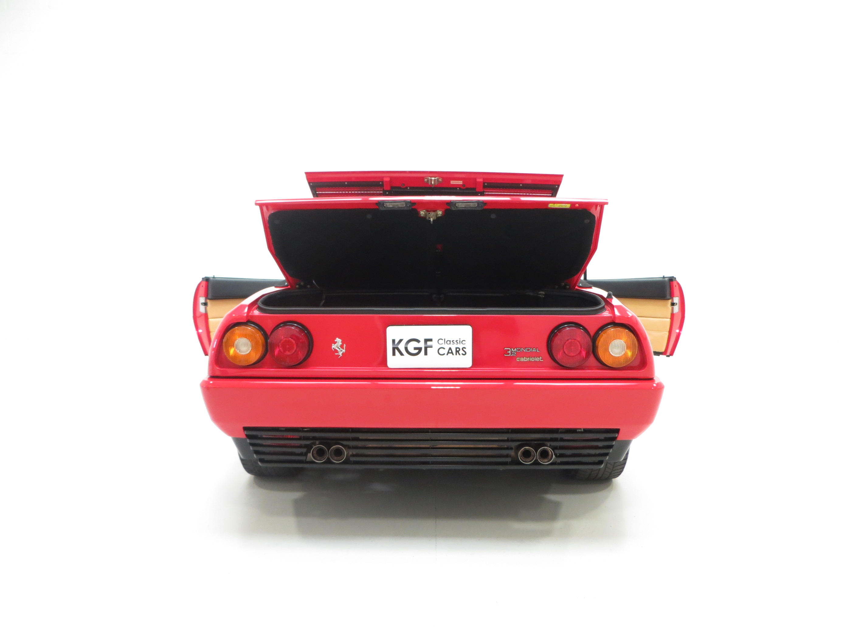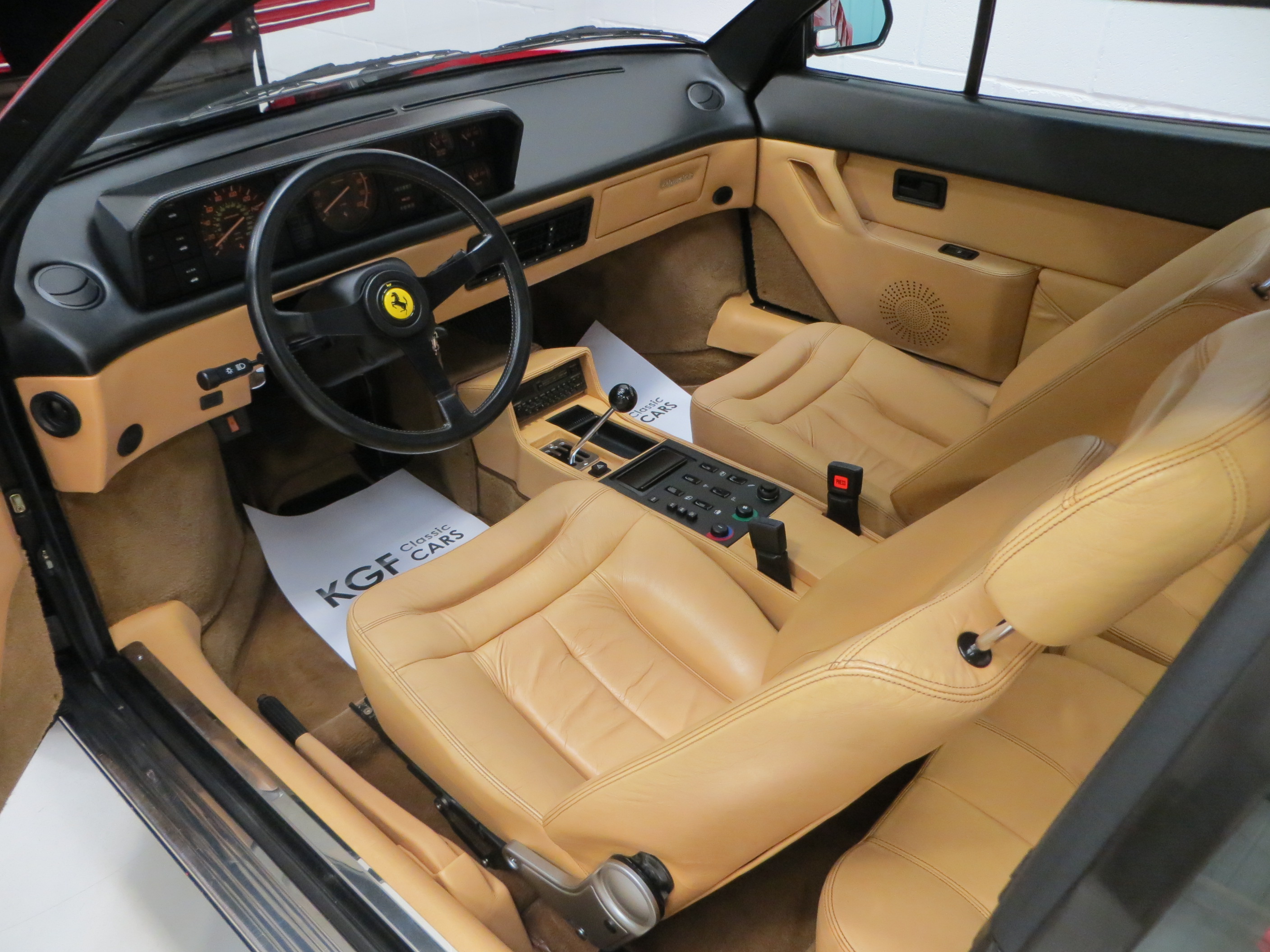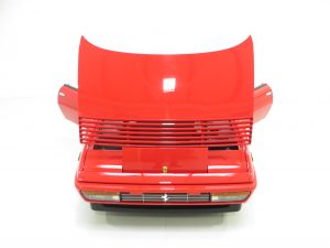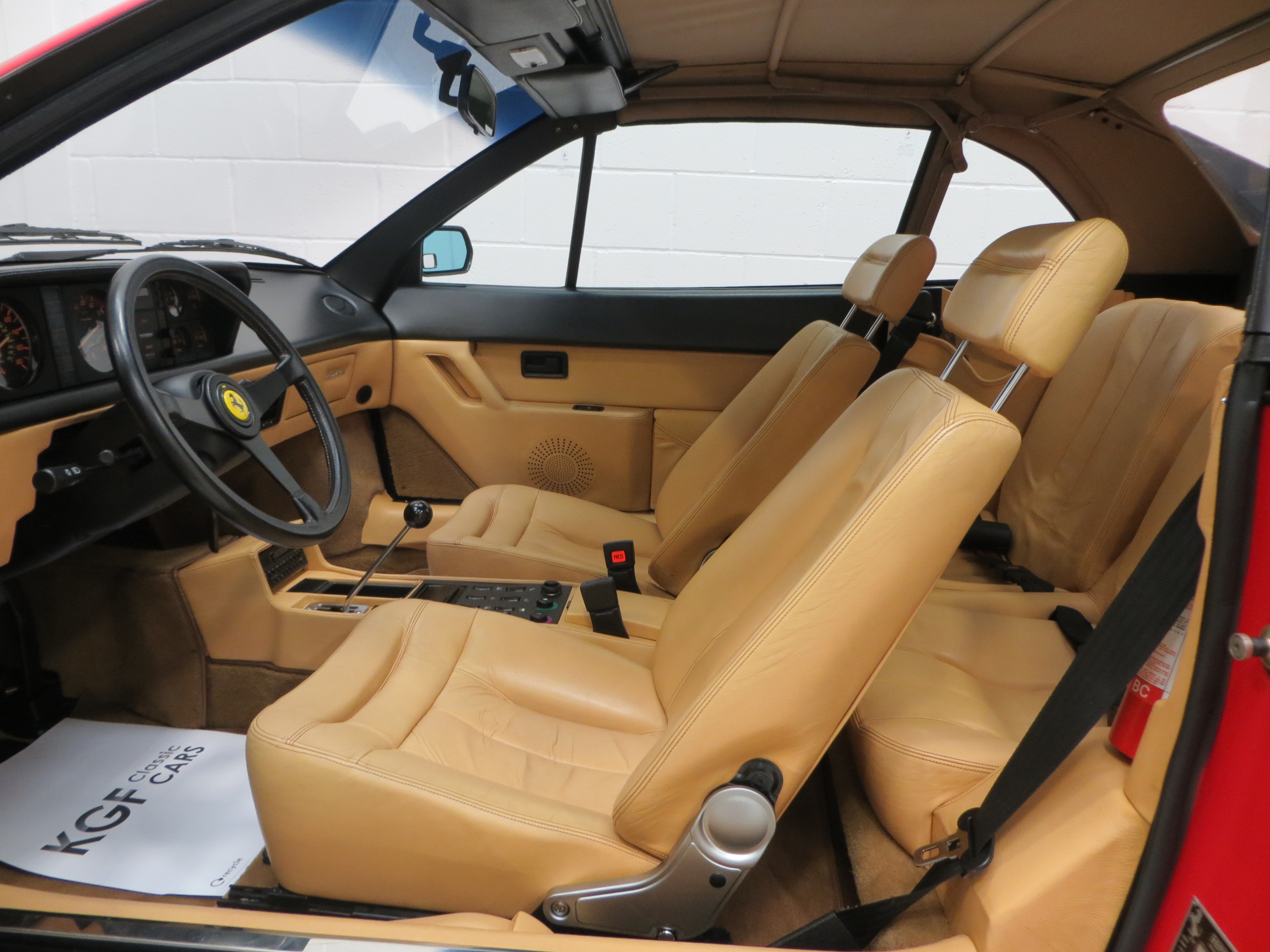 Fully trimmed in luxurious Connolly tan hide the supportive bucket-shaped seats are fully commensurate with the incredibly low miles covered. All electric features are fully functional and the Veglia instrumentation is iconic 80’s genius in orange slanted italic design. The polished open-gated gear selector is unmarked and reminds the driver of classic Ferrari ownership with added 2+2 practically thrown-in. Purists will note the visible grain on the Momo leather sports steering wheel because of the low miles covered and colour code sticker in the luggage compartment often lost in the first few years of ownership. All front and rear compartments are factory fresh with one tiny split to the boot carpet. This really is very close to a brand new Ferrari Mondial.