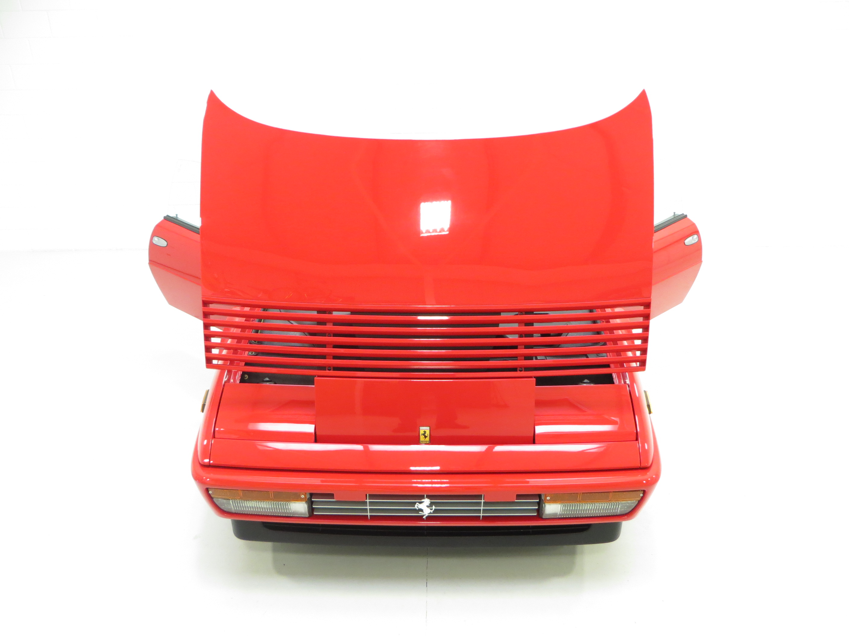 The distinctive 2+2 Pininfarina of Turin design is typical Ferrari of the period and looks glorious finished in deep Rosso Corsa (Code FER 300/9). First paint credentials still retain a glossy shine thanks to perfect storage and very low mileage credentials. All Cavallino Rampante badges along with all other trim is in perfect condition. The Saint Gobain glass carries the Ferrari logo and the plastic rear screen is crystal clear, again with the Ferrari logo. The louvre panels across the bonnet, body sides and engine cover are unmarked and only two tiny marks to the wing tops can be seen. The prominent rectangular side turn-indicator lamps affixed front and rear to all U.S. vehicles remain. There are themes that are unmistakeable – from the front grille, to the air intakes, to the circular rear lights, this is the perfect Ferrari in so many ways.