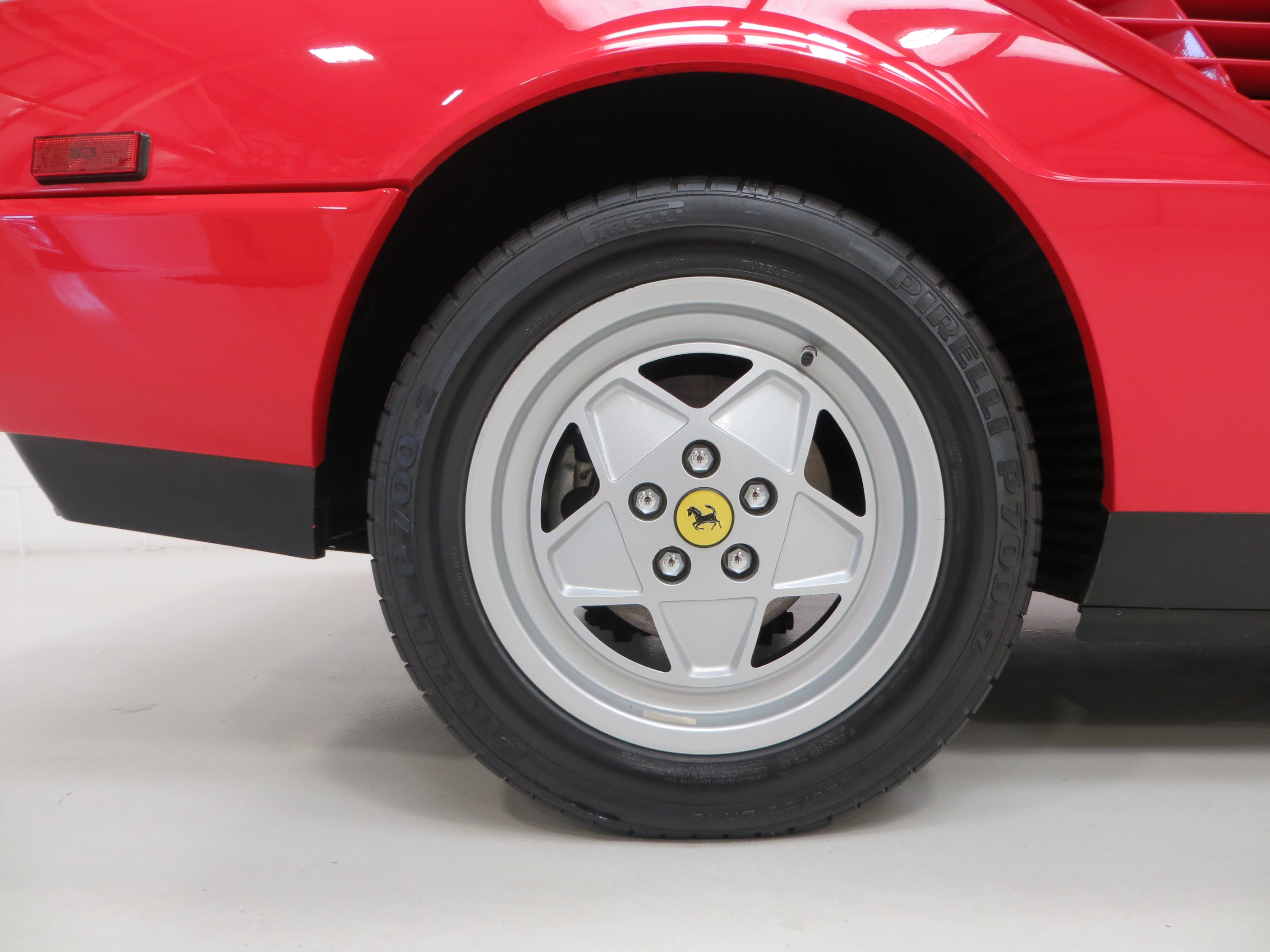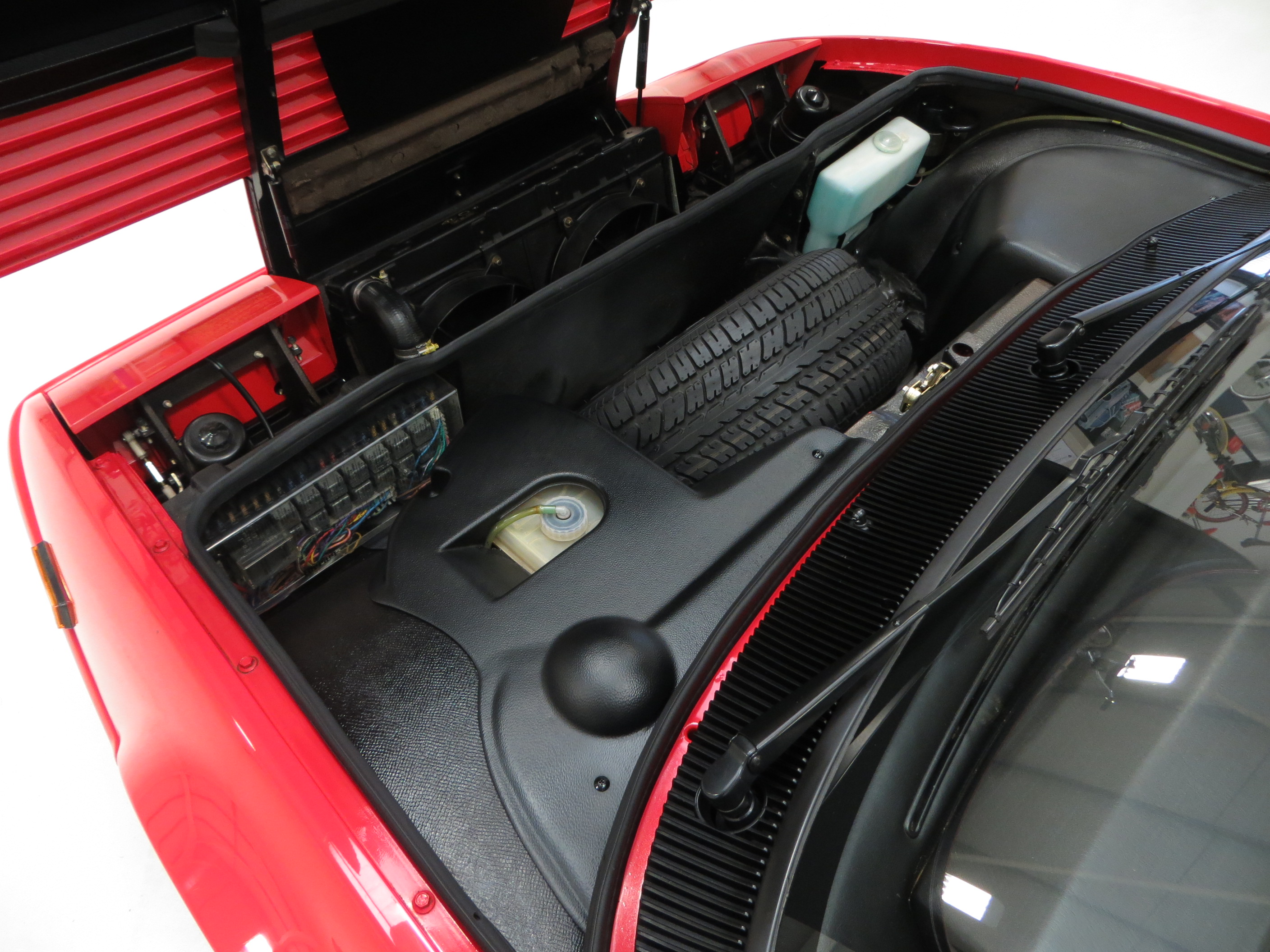 Virtually perfect light alloy cast rims benefit from convex centre and smoother angled spokes all featuring pristine yellow circular centre caps bearing Ferrari’s black Cavallino Rampante rearing-horse logo. A tiny mark to one alloy wheel is barely noticeable. All four tyres are correctly sized premium Perelli P700z items with the unused front mounted spare still wearing the factory supplied Goodyear Eagle VR55. As this is a later car from 1987 it incorporates the ATE anti-lock braking system with ventilated disk brakes to all four wheels.