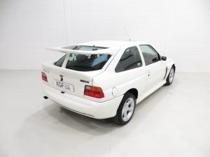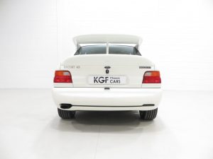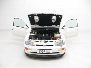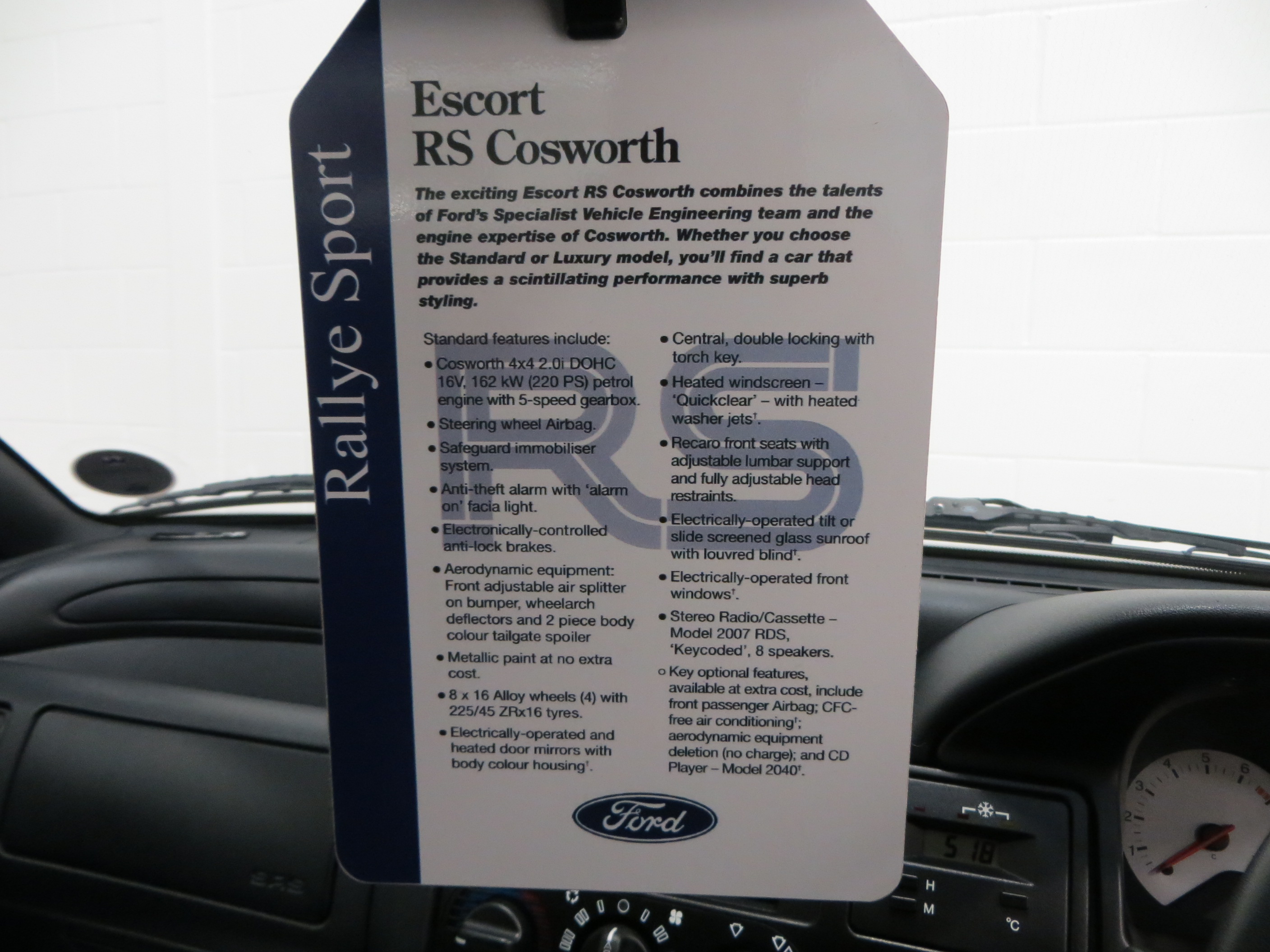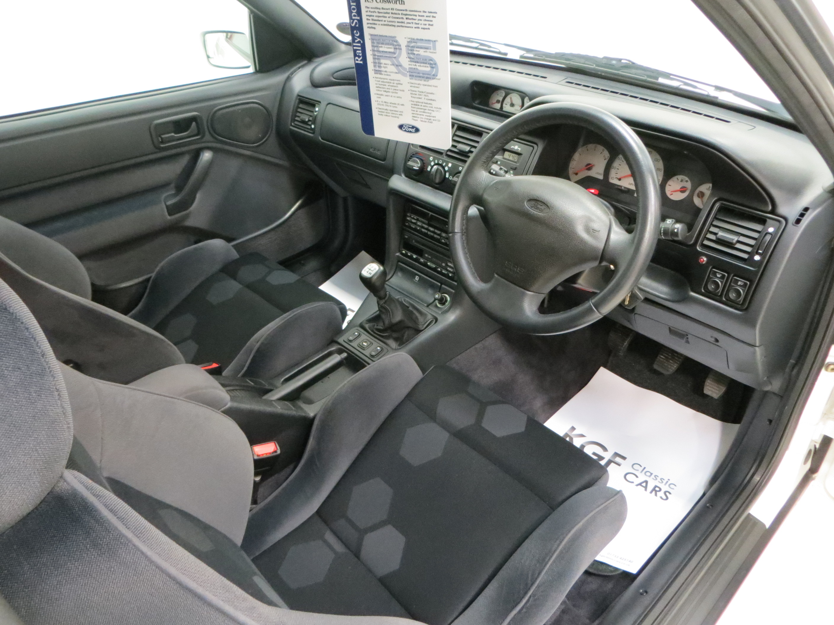 The breath-taking exterior of this Escort RS Cosworth is nothing short of magnificent. Finished in solid Diamond White, (Code B2), the paintwork boasts an impeccable shine from the flawless factory finish. All exterior trim, lights, badges and rubbers are perfect. All correct Ford window stickers remain intact including the Ford Security System and Dealer supplier rear window sticker. A private number plate included with ‘FMC’ suffix pays homage to the press cars used by the Ford Motor Company when new. A beautifully detailed underside featuring a standard exhaust is worthy of the demanding show scene. Incredibly original and unmolested and cossetted underneath an expensive soft fibre car cover included in the sale, this is a true champion collectors car.