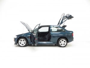 With 200 hours detail development in Fords own Cologne wind tunnel the rally-bred innovation of this model is instantly recognised. Finished in the unique Escort Cosworth launch colour of Mallard Green, (Code 4 2), the finish can be described as impeccable. An invoice in the file for Armourfend paint protection followed by temperature controlled storage and 2,500 careful dry mileage use only guarantees sheer perfection and a factory new appearance. The three-position front adjustable splitter still has the factory chalk marks and the underside is factory correct and spotlessly clean having never been altered from production. The colour-coded fuel filler cap and large door mirrors of early Big Turbo cars along with every inconceivable detail is correct. This one owner Escort Cosworth is the Holy Grail.