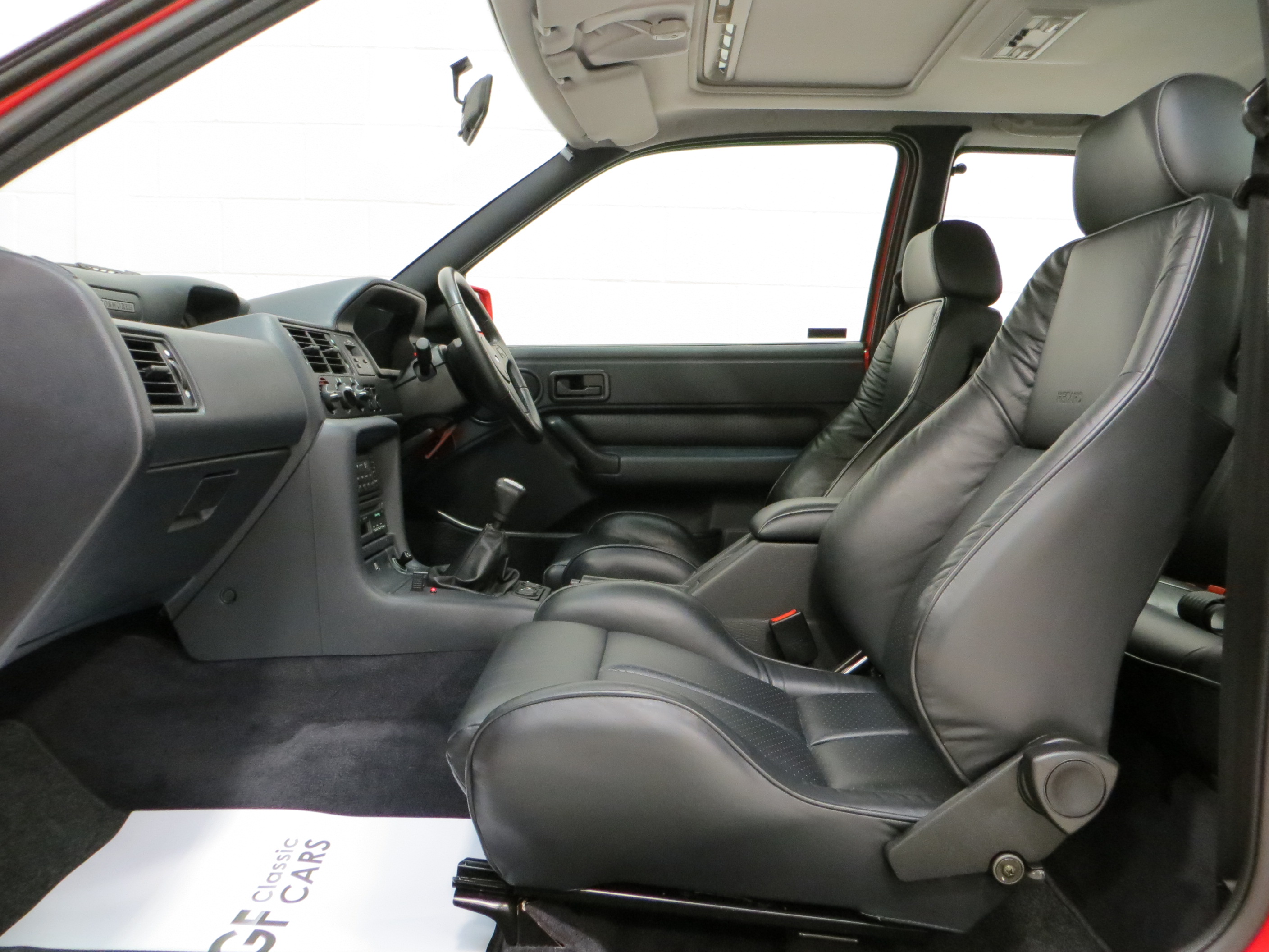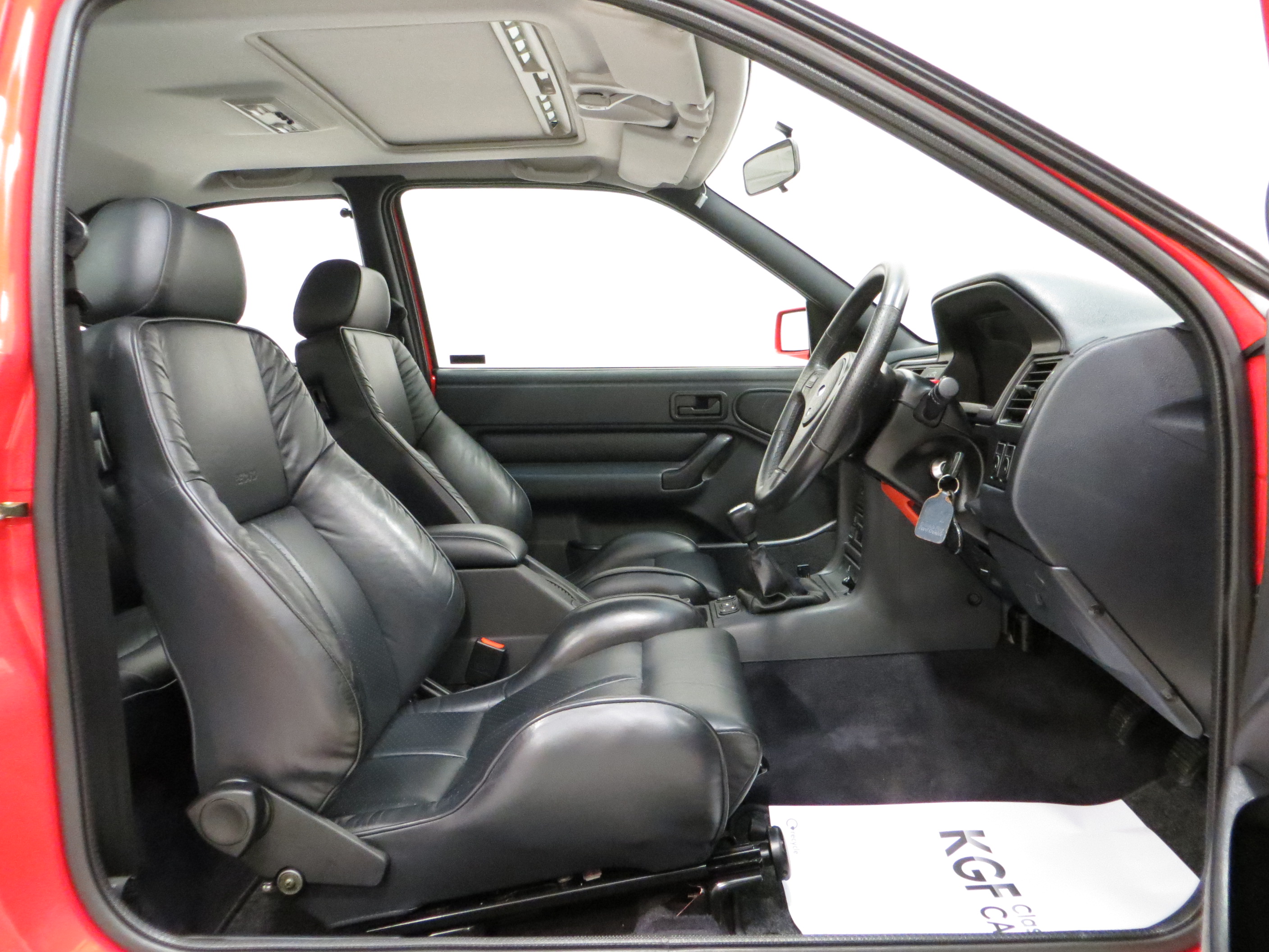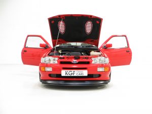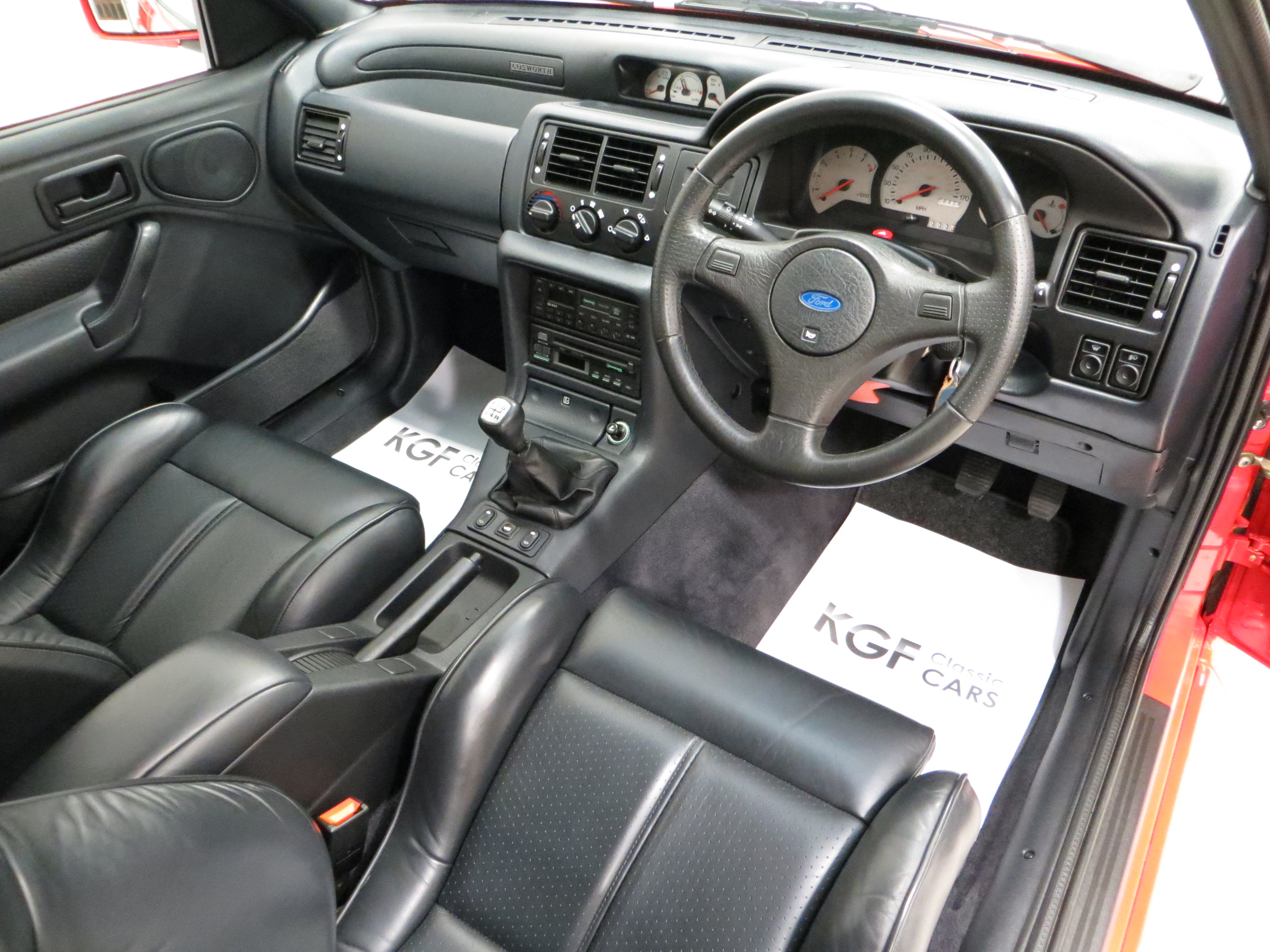 With 200 hours detail development in Fords Cologne wind tunnel the rally-bred innovation of this model is instantly recognised. Finished in desirable Radiant Red, (Code U 7), the finish can be described as impeccable. A reflective gloss finish will amaze onlookers and a testament to the cars appearance are various Concours awards at prestigious RS Owners Club shows. The three-position front adjustable splitter is perfect and the underside is an exhibitors dream with every component gleaming and as new. Factory markings, stampings and stickers are all present and correct. The colour-coded fuel filler cap and large door mirrors of early Big Turbo cars along with every inconceivable detail is correct. Undeniably one of the best in existence.