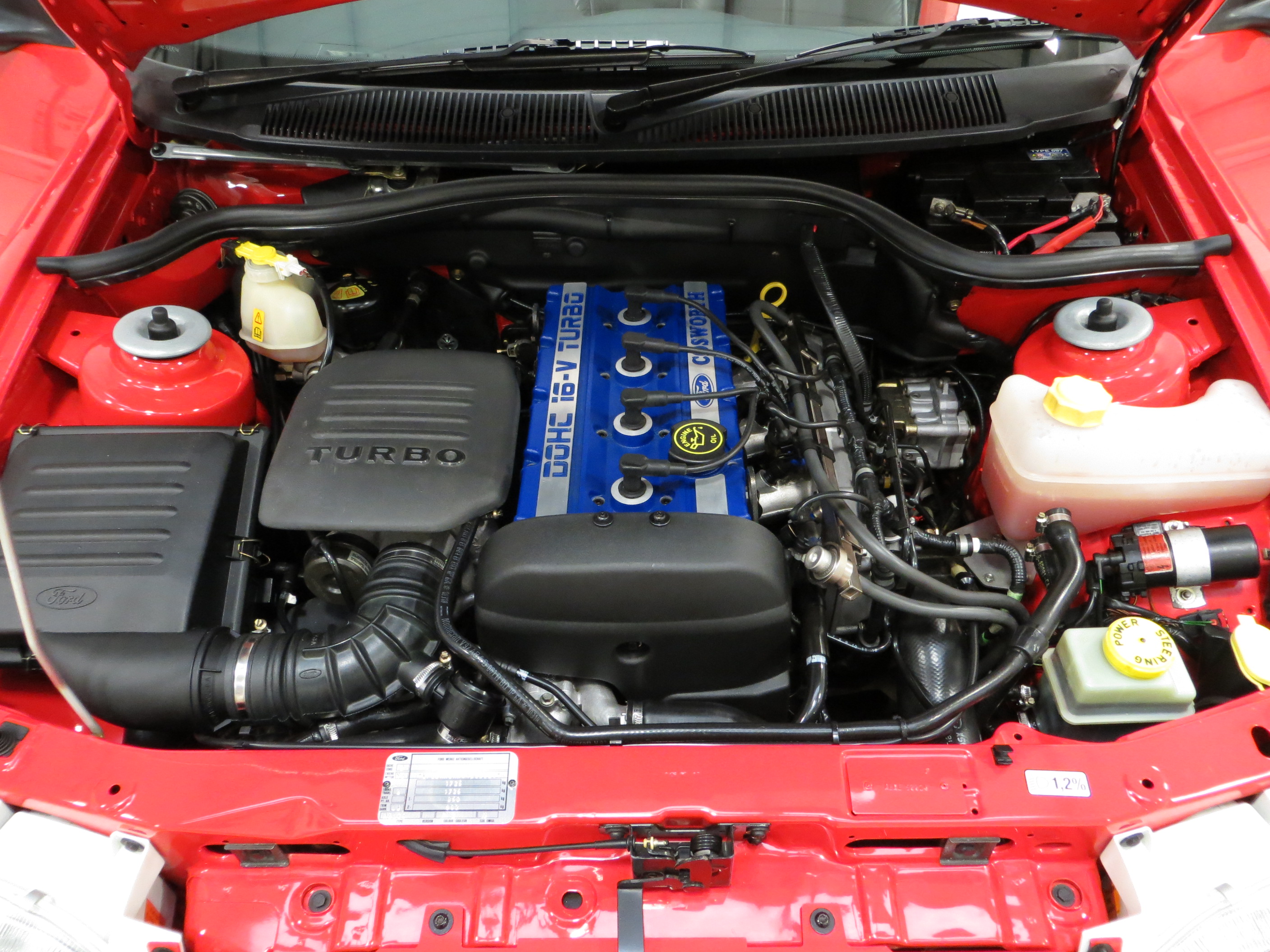Body colour front bumper with black lower extension, front airdam, louvred bonnet air intakes, wing air extraction grilles, integral driving lights and fog lights, padded armrest with cassette storage, oil pressure gauge, turbo gauge, voltmeter, quartz digital clock with ambient temperature, electro-luminescent dials, Ford 2008 radio/cassette with CD. Lux Model Equipment; Electrically operated and heated door mirrors, ‘Quickclear’ heated windscreen, heated washer jets, three-spoke leather covered steering wheel, rear centre armrest, rear head restraints, manual sunroof, electric windows, carpeted door bins.