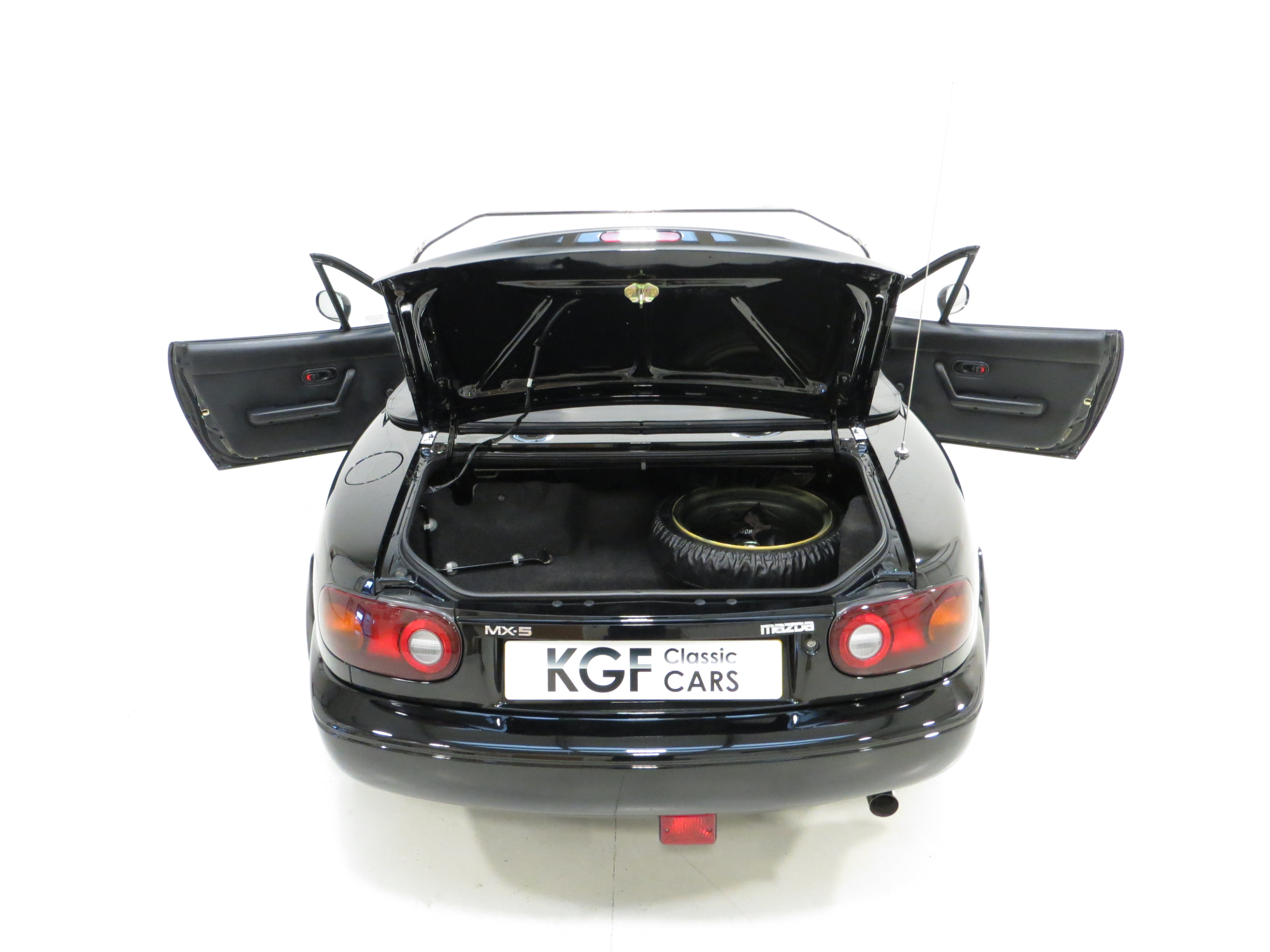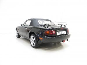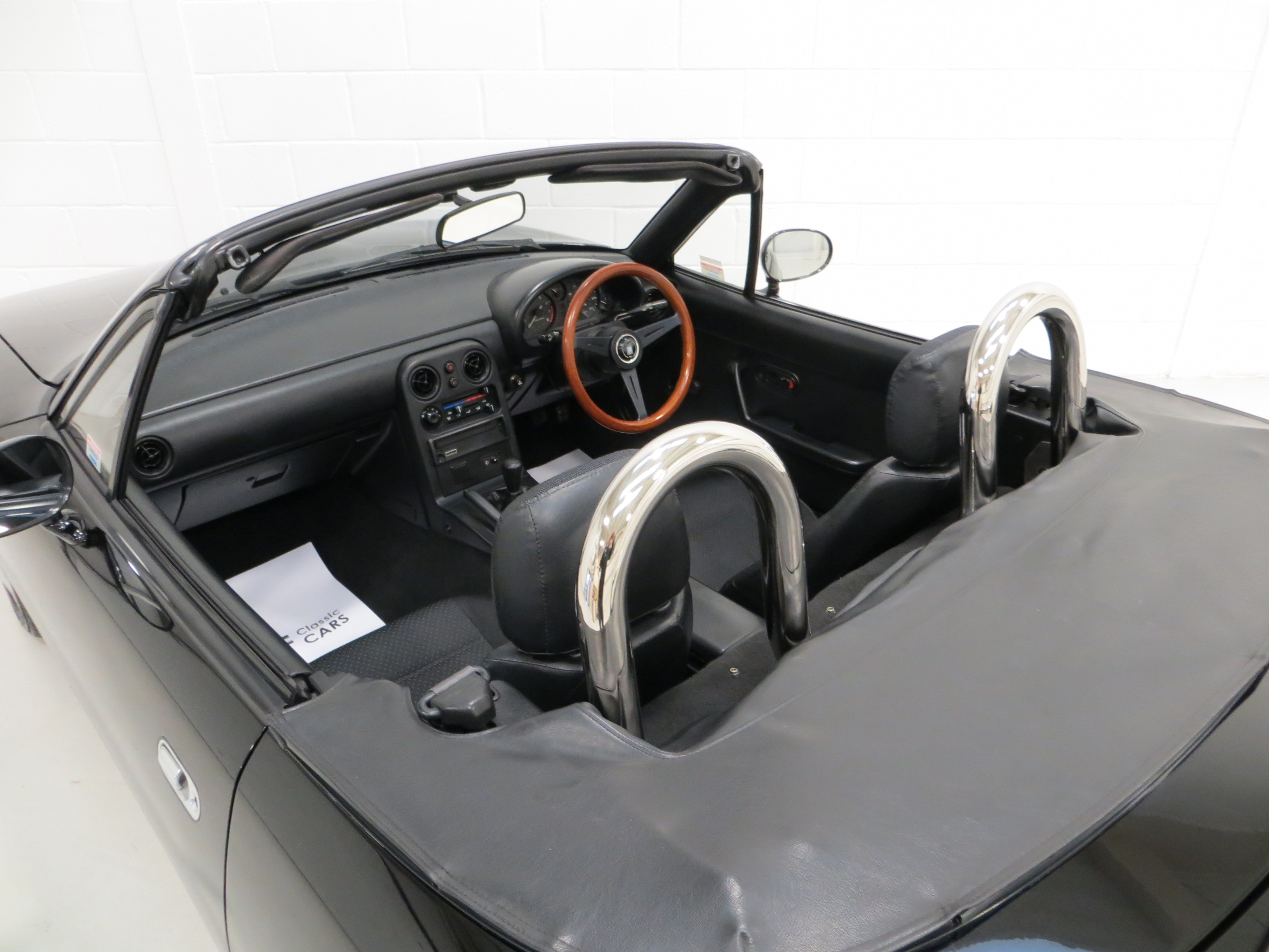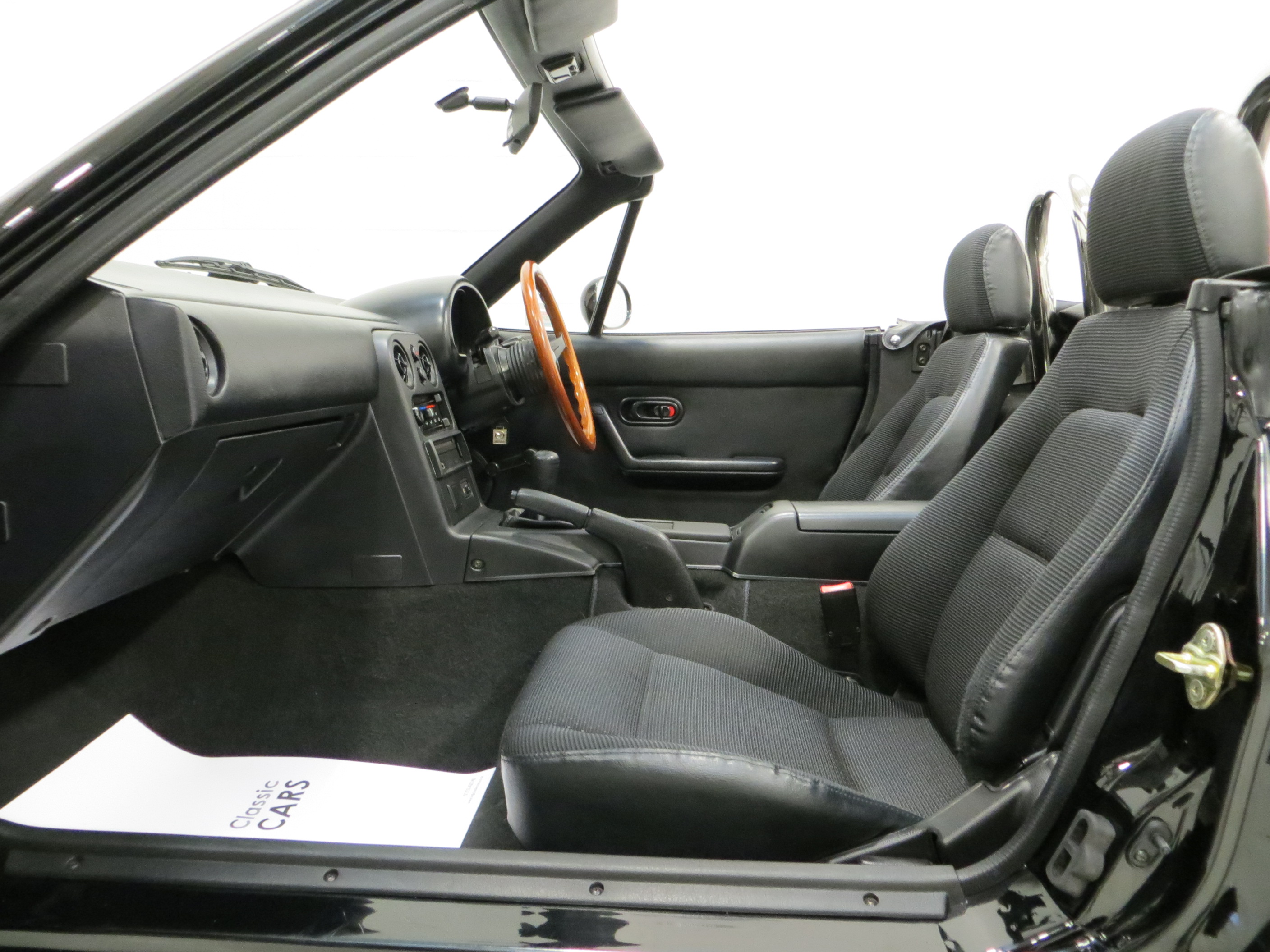 This wonderful Mazda MX-5 in factory original Brilliant Black, (Code PZ), boasts a stunning deep gloss shine and superb finish. The excellent finish to the paintwork is owing to the low mileage and garage storage from new. The underside and sills are clean and free from repair work and excess applied underseal. Miniscule markings are visible on close scrutiny, and worthy of mention are light markings to one rear mudguard and the nearside door mirror. A tiny light ding to the bonnet edge and driver’s door are barely visible. The black canvas hood is in perfect order with a tight fit, and the clear rear plastic window shows only light markings. The neat fitting tonneau cover is perfect. The epitome of a modern classic sports car, preserved and ready to enjoy.