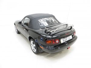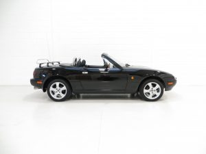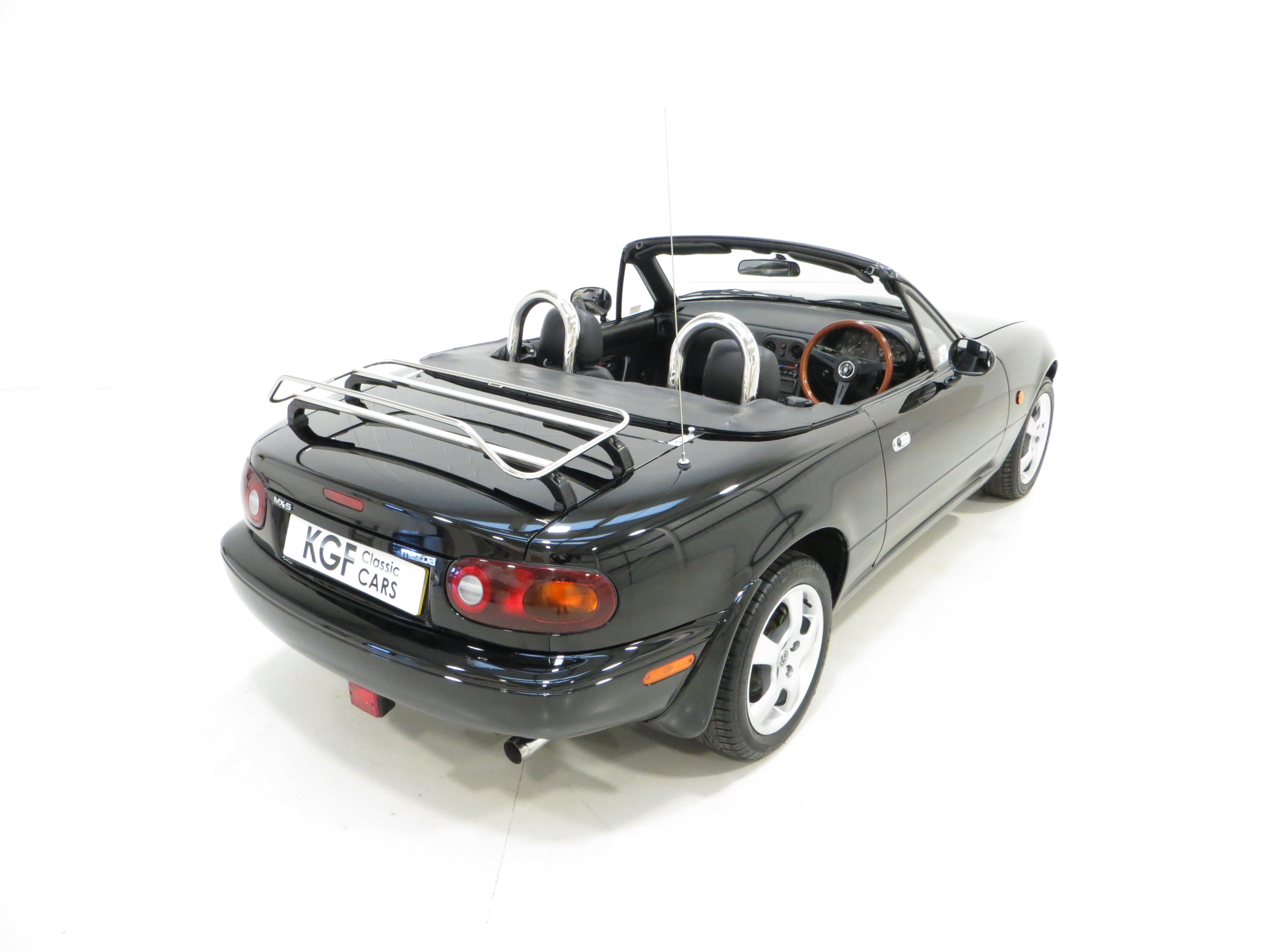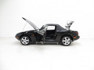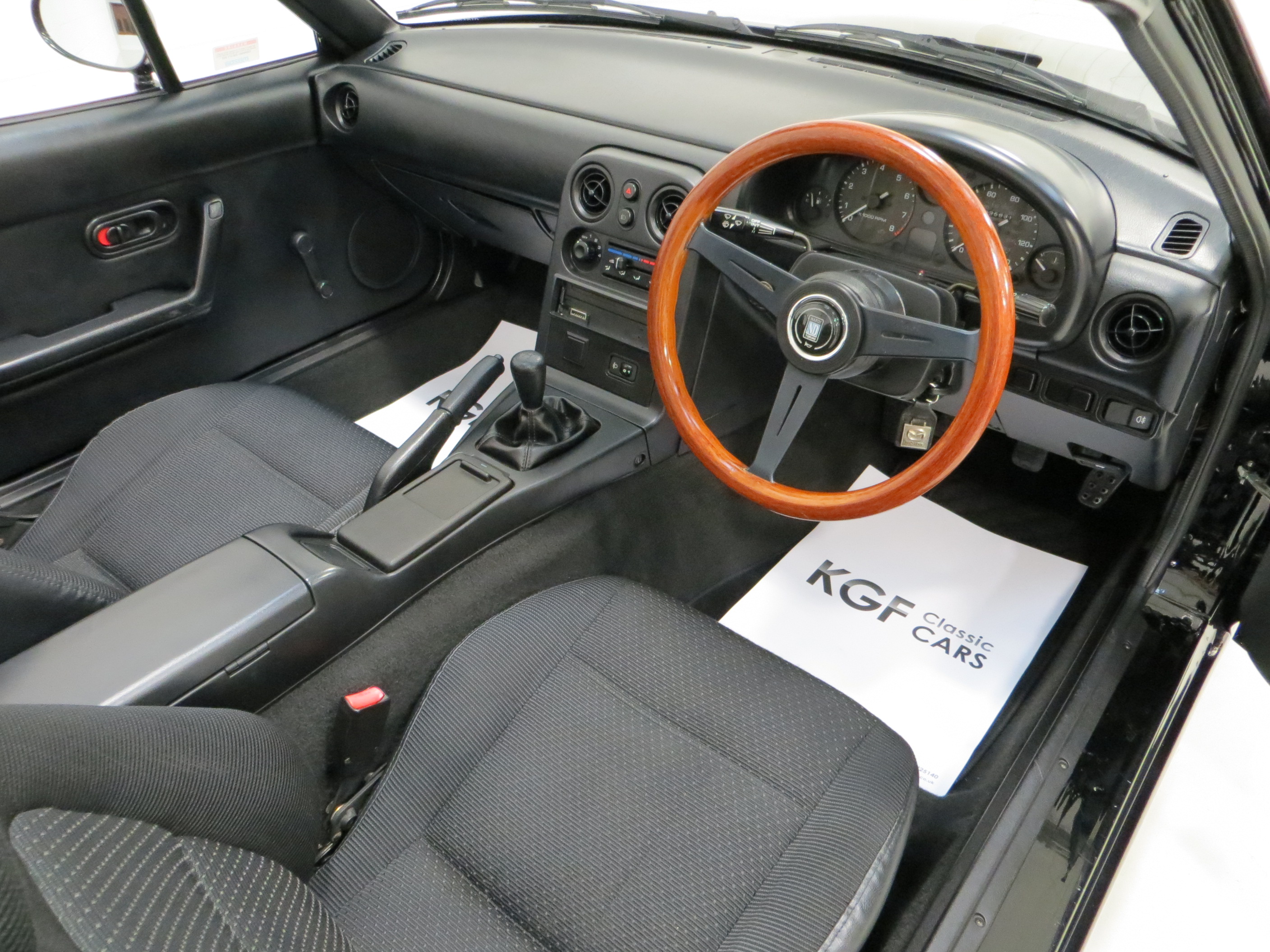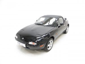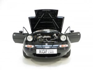 This wonderful Mazda MX-5 in factory original Brilliant Black, (Code PZ), boasts a stunning deep gloss shine and superb finish. The excellent finish to the paintwork is owing to the low mileage and garage storage from new. The underside and sills are clean and free from repair work and excess applied underseal. Miniscule markings are visible on close scrutiny, and worthy of mention are light markings to one rear mudguard and the nearside door mirror. A tiny light ding to the bonnet edge and driver’s door are barely visible. The black canvas hood is in perfect order with a tight fit, and the clear rear plastic window shows only light markings. The neat fitting tonneau cover is perfect. The epitome of a modern classic sports car, preserved and ready to enjoy.