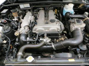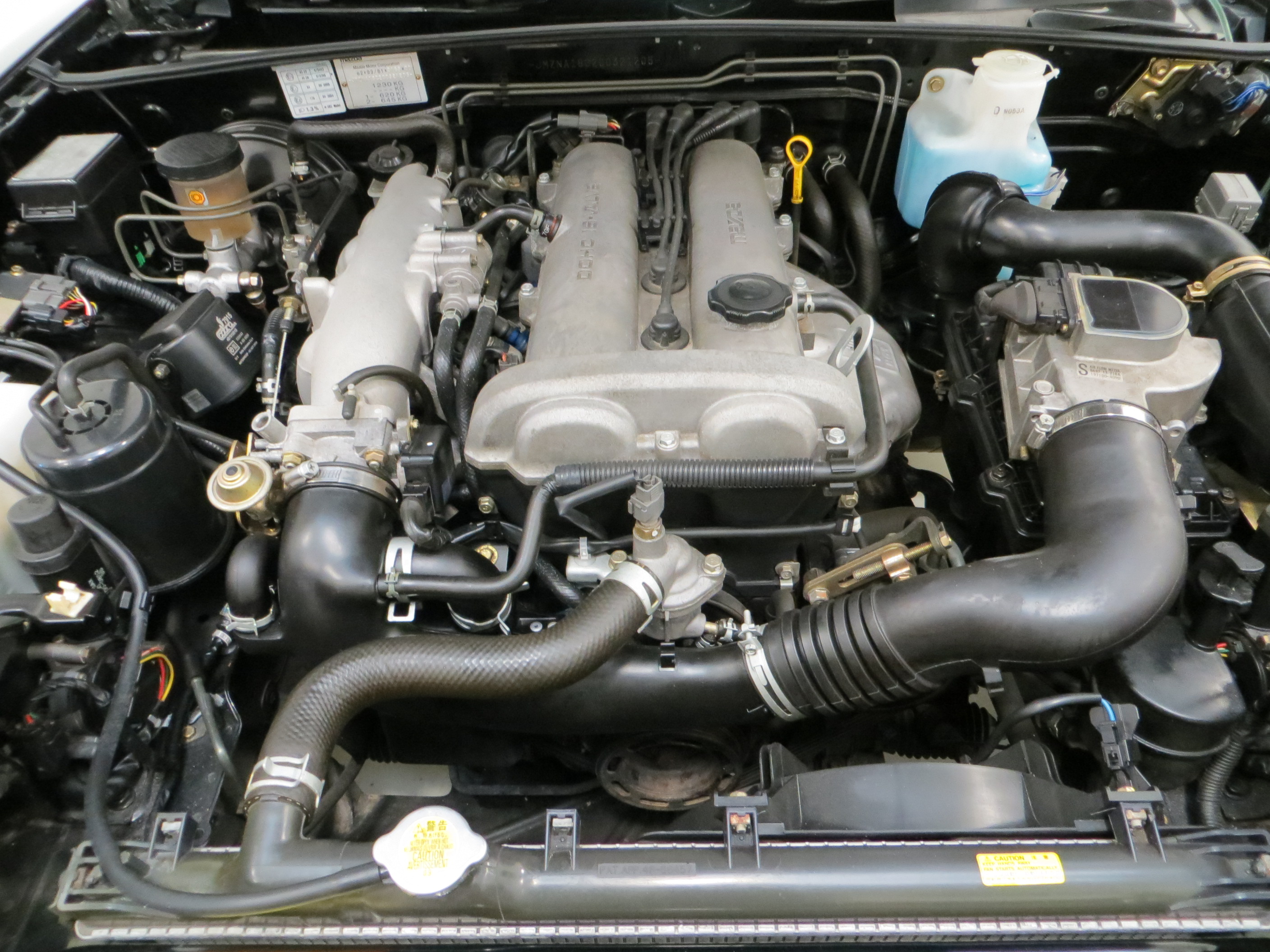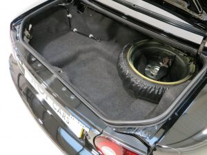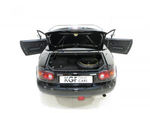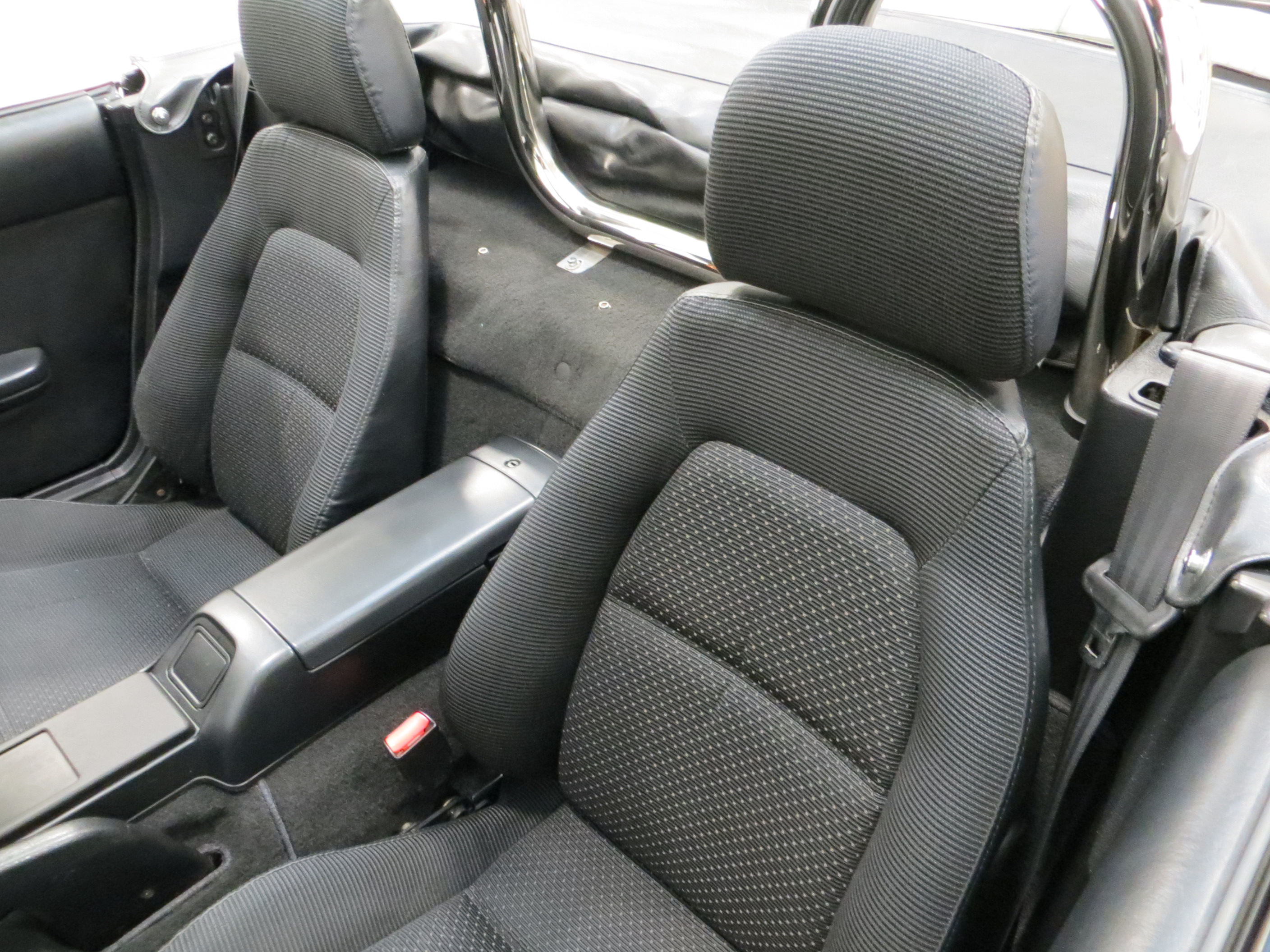 Trimmed in the standard Black Cloth upholstery, (Code NA3), this interior is exactly how Mazda intended. Everything is co-ordinated and operates perfectly with the superb quality feel familiar to MX5 owners. The seats remain in exceptional order with none of the common bobbling and bolster wear. The expensive wooden Nardi-Torino steering wheel is a work of art, as are the bright chrome optional roll-hoops, an attractive safety feature. The classic sports dashboard houses a cluster of crystal clear instruments that function precisely. The tailored MX5 over mats remain in place and protect the immaculate black carpeting. The tool kit, wheel brace and covered space saver wheel are all present and spotlessly clean. The ultimate modern classic twin seater sports car.