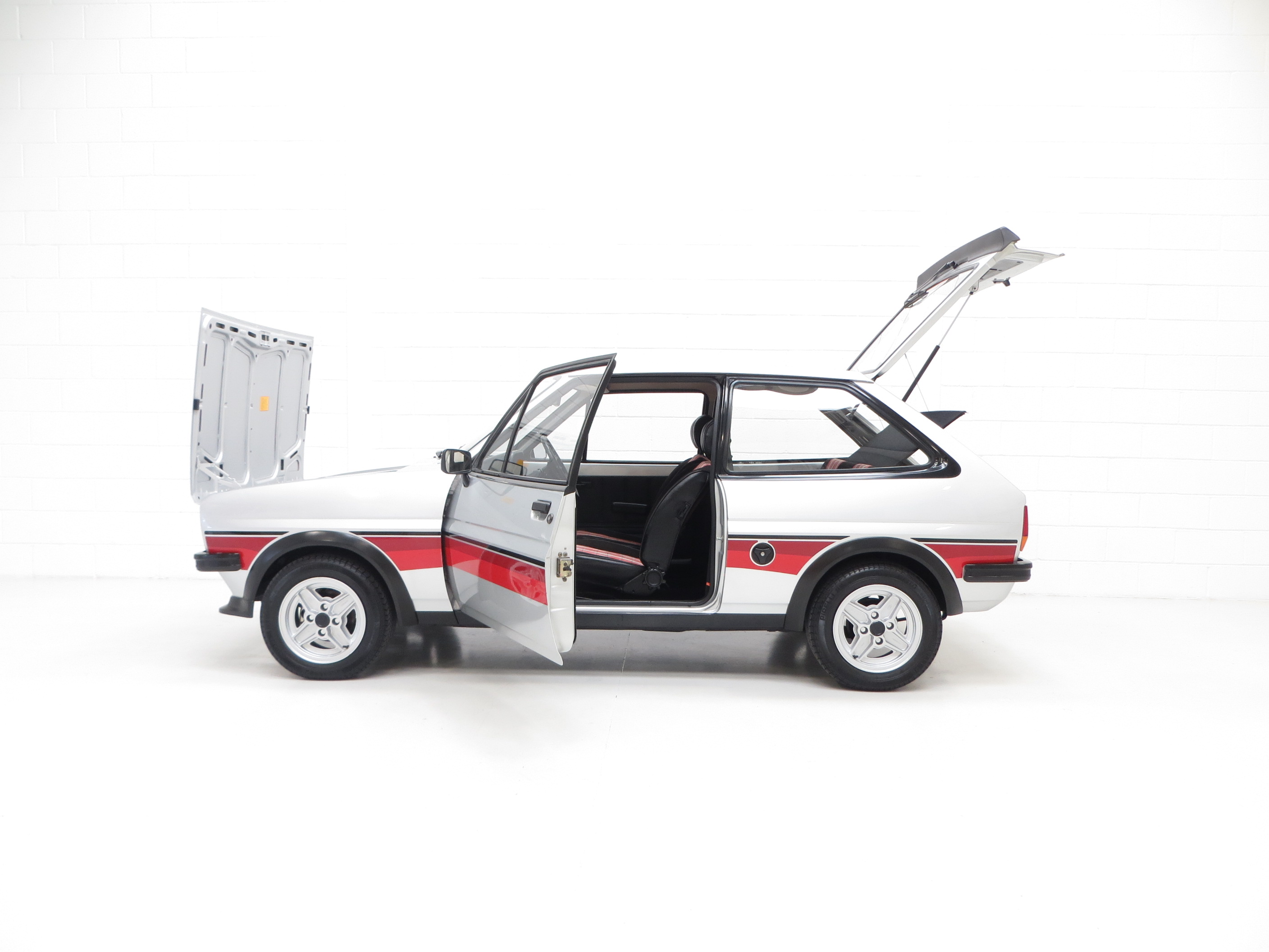 This incredibly rare Fiesta Supersport is finished in optional Strato Silver, (Code V 6), and demonstrates a brilliant shine of a cherished, perfectly stored car. Knowledgeable scrutineers will be amazed how this fragile car has survived in the correct Ford production guise with factory original panels throughout. Unique to the Supersport, one bolt bumper mounts in the correctly sized recess, supplements the known bulged rear valence to accommodate the spare alloy wheel in the boot area. Date stampings in hidden areas remain and production spot-welds even extend to both sills! Correct Hella halogen headlights and Ford twin driving lamps remain fitted and the decals are original factory fitted and not reproduction items. They have been clear lacquered. There is one small scratch and minor stone chips to the bonnet left untreated to uphold first paint credentials. The glass is number plate etched with the rear screen displaying the supplying dealer sticker. Both the screen sticker and front and rear number plates are original items and not reproduction. Amazing.