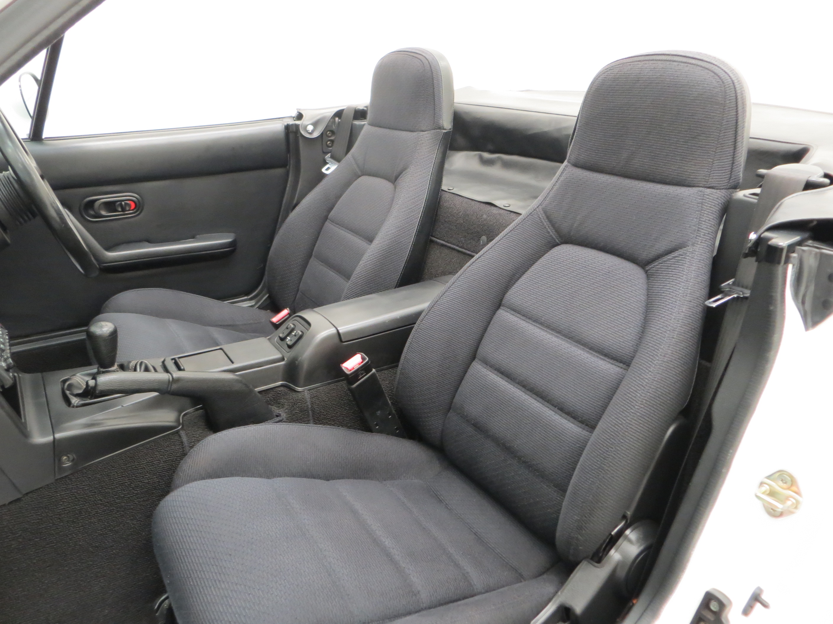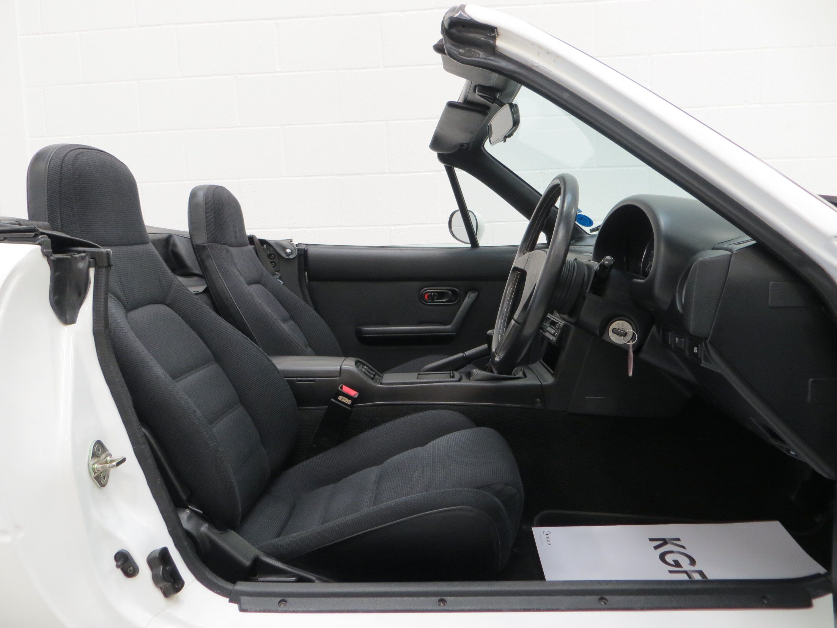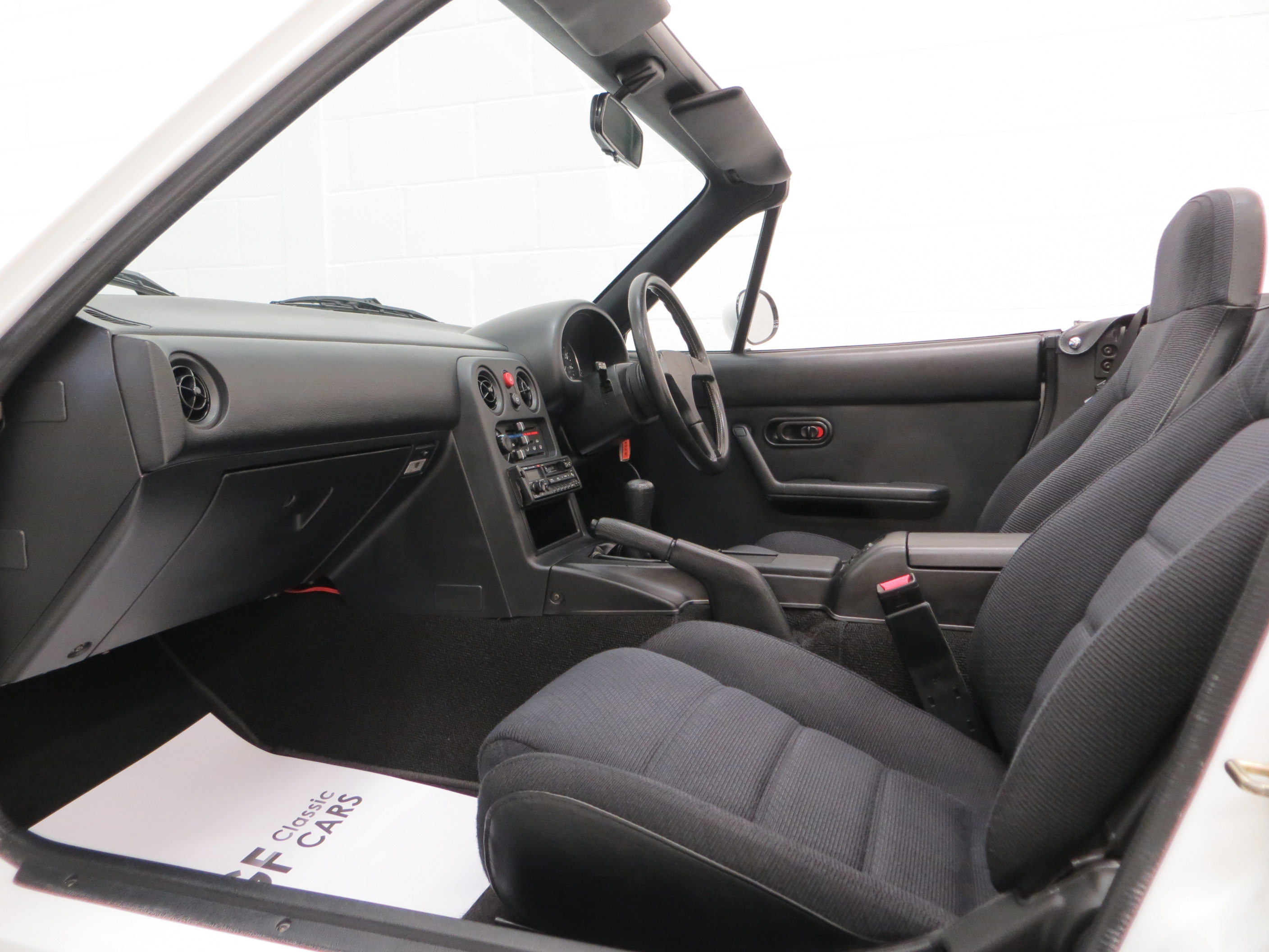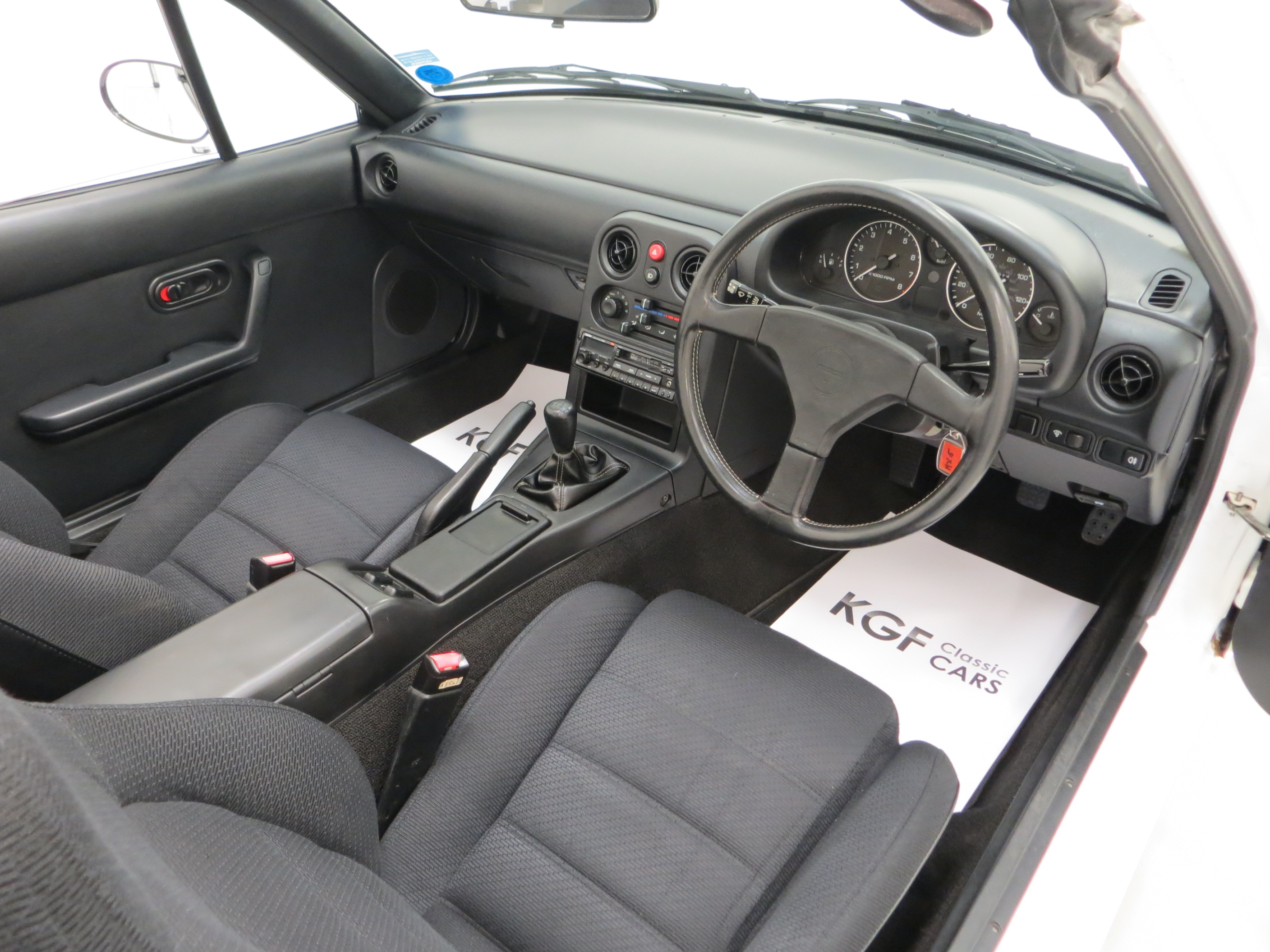 Trimmed in the standard Black Cloth upholstery this interior remains precisely as Mazda intended, and everything is co-ordinated perfectly. The high-backed seats offer great comfort and support, and show virtually no aging to the fabric. The seat structure including the bolsters are firm and retain correct shape. The classic sports dashboard houses a cluster of crystal-clear instruments that function precisely as does the factory fitted Clarion CRH60 radio cassette. The original leather trimmed steering wheel with white stitching is fully intact and just a very small seam split to the driver’s door inner handle is worthy of mention. The tonneau cover and original wheel brace, jack and toolkit are all present. Even the factory supplied touch up paint tins have been kept and the original sticker remains attached to the boot carpet! The no frills driver focused concept perfected by Mazda is simply wonderful, and this example upholds that notion exactly.
