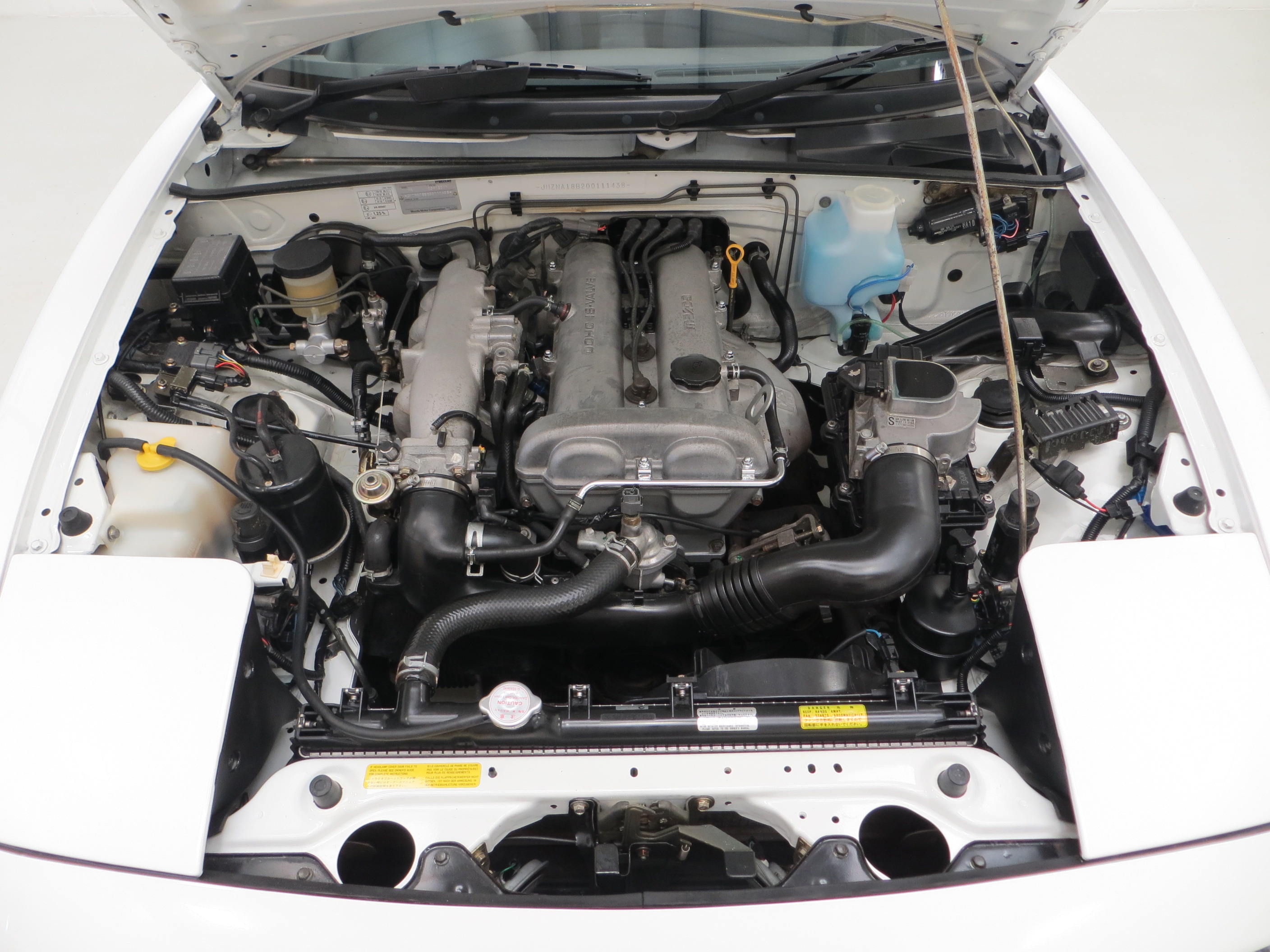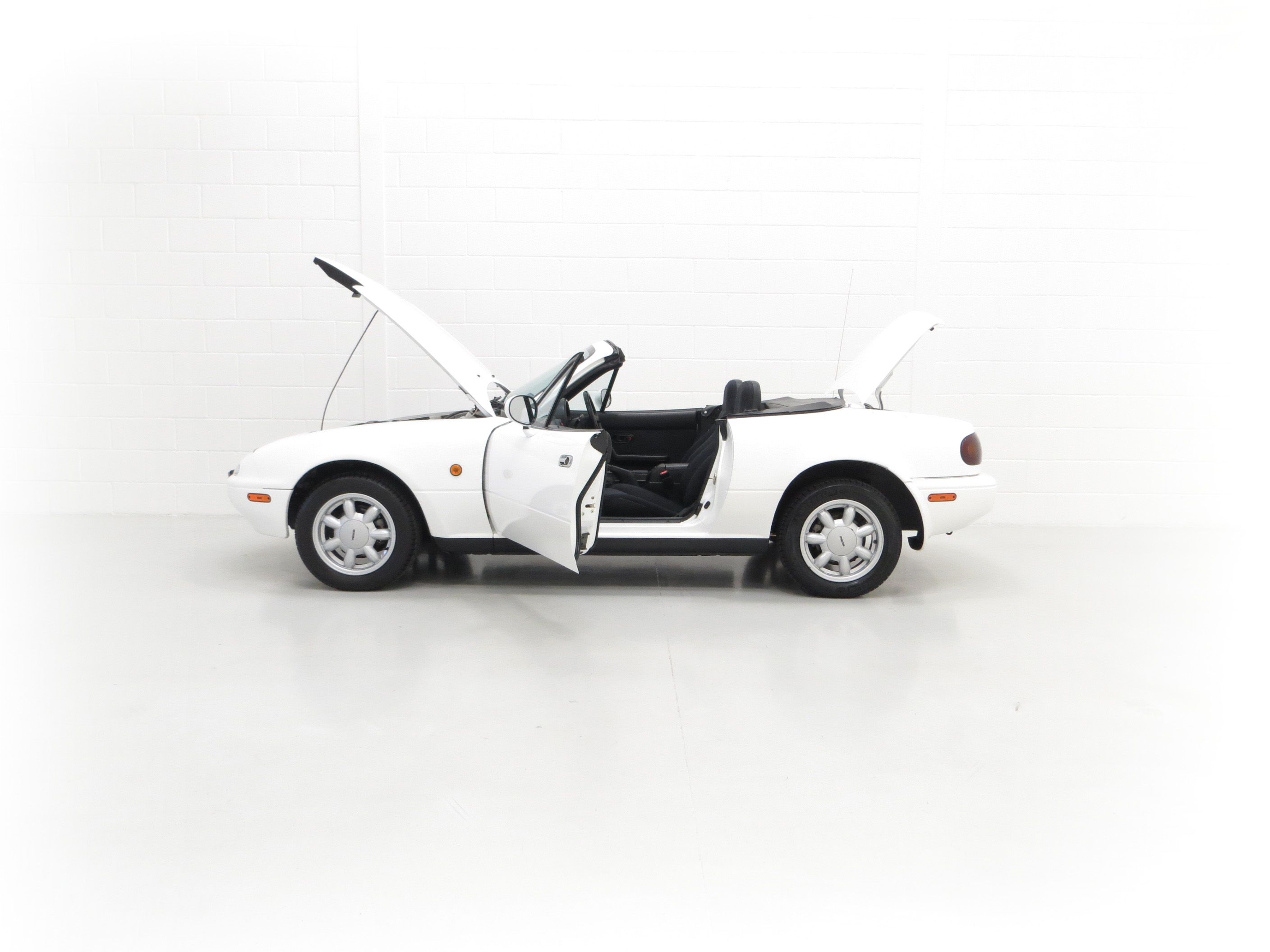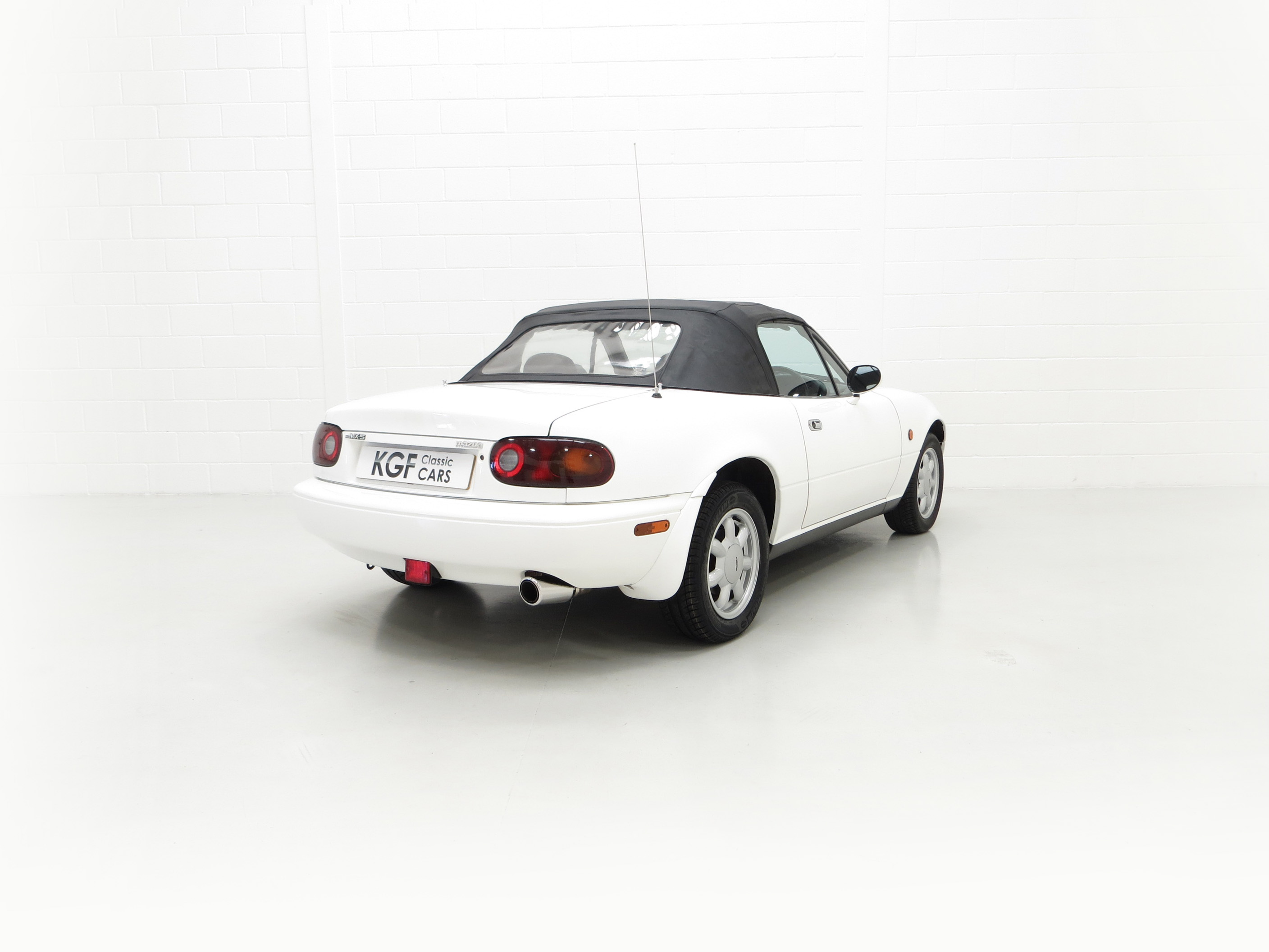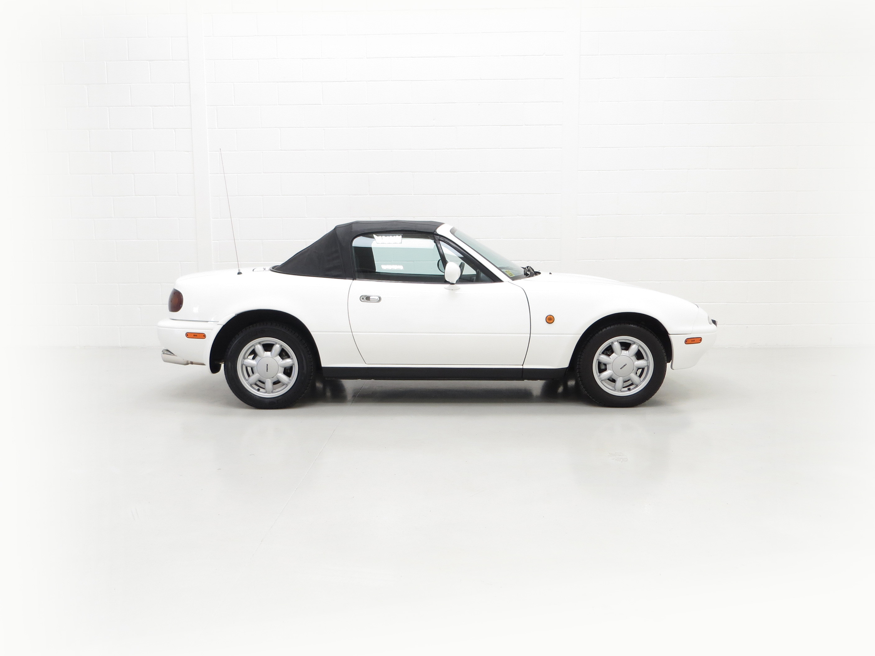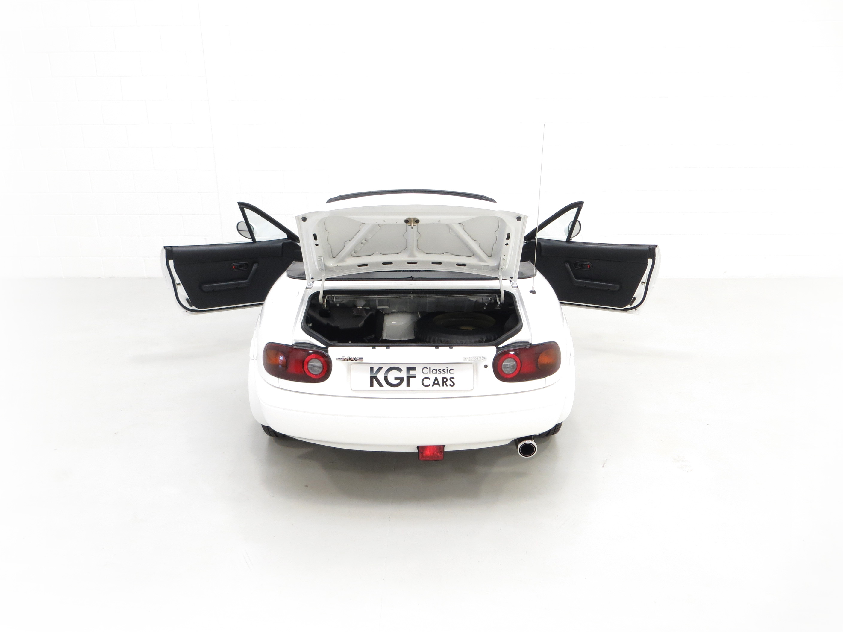 Trimmed in the standard Black Cloth upholstery this interior remains precisely as Mazda intended, and everything is co-ordinated perfectly. The high-backed seats offer great comfort and support, and show virtually no aging to the fabric. The seat structure including the bolsters are firm and retain correct shape. The classic sports dashboard houses a cluster of crystal-clear instruments that function precisely as does the factory fitted Clarion CRH60 radio cassette. The original leather trimmed steering wheel with white stitching is fully intact and just a very small seam split to the driver’s door inner handle is worthy of mention. The tonneau cover and original wheel brace, jack and toolkit are all present. Even the factory supplied touch up paint tins have been kept and the original sticker remains attached to the boot carpet! The no frills driver focused concept perfected by Mazda is simply wonderful, and this example upholds that notion exactly.