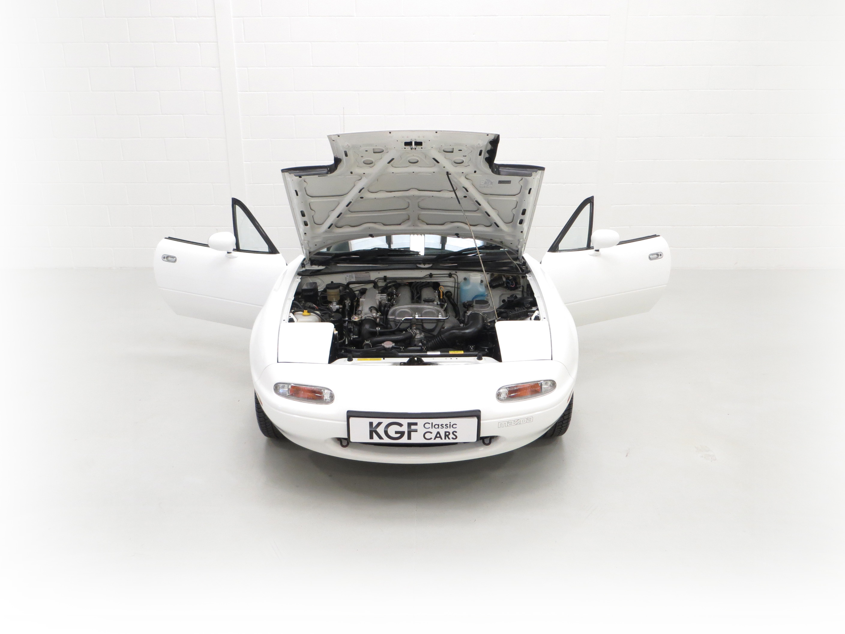 To experience driving a low mileage and unspoilt Mk1 MX-5 is a true motoring delight. The lightweight 1.6 litre 16v DOHC engine sits low and behind the front axle to offer a low centre of gravity and centralised weight distribution making handling perfectly balanced and delightfully responsive. With 114bhp available, a top speed of 121mph and 0-60mph time of 8.7 seconds is achieved. A Mazda MX5 Owners Club and specialist recommended stainless steel exhaust rear section has been fitted and it sounds subtle yet superb! The engine bay is very clean with all factory plates and stickers intact, including the often-lost bonnet underside stickers. Even factory wax has been preserved! The truly delightful close ratio five speed gearbox provides short and positive gear changes. Huge grin motoring guaranteed!