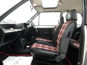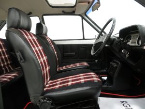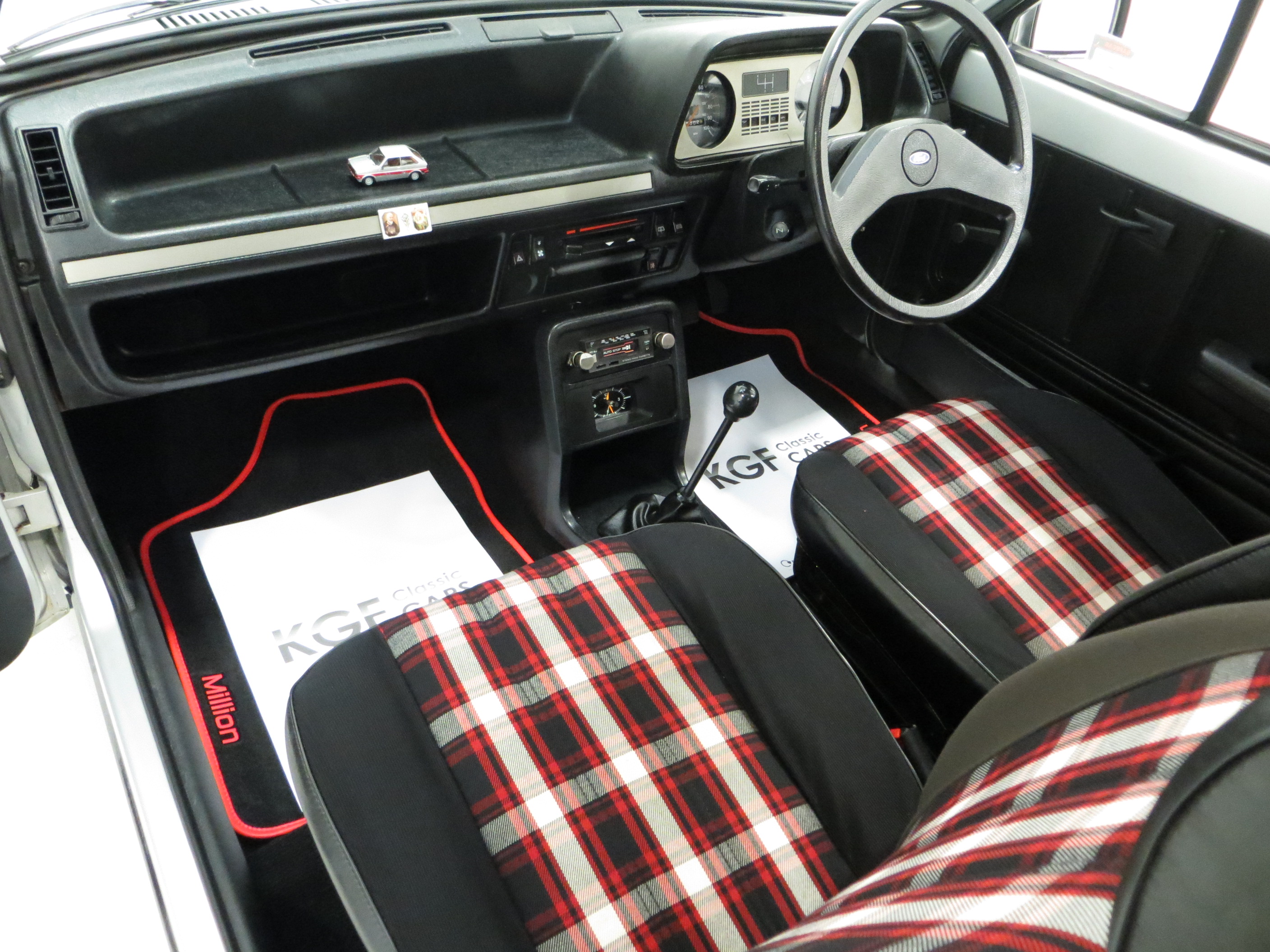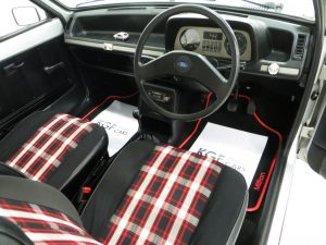 A wonderfully period and time warp interior. Fiesta Million cars were based on the humble Fiesta L model but featured many extras including the exclusive chequered ‘Scott’ seat fabric, (Code A1). This was very similar in design to the Carla Fabric used in the Fiesta Supersport. Remaining exactly as Ford intended, the preserved upholstery is commensurate with the low mileage and has suffered no rips or colour fade whatsoever and nothing other than very light wear to the top corner of each front seat back. The loop pile carpets are protected by specially made Million logo velour mats and the perforated headlining is fully intact. The door cards are unmarked. All equipment, switches and gauges function including the quartz clock and heater fan on both speed settings. There is a hairline crack to the dash front and the padded dash top is perfect homing an identical model car and a Saint Pio of Pietrelcina.