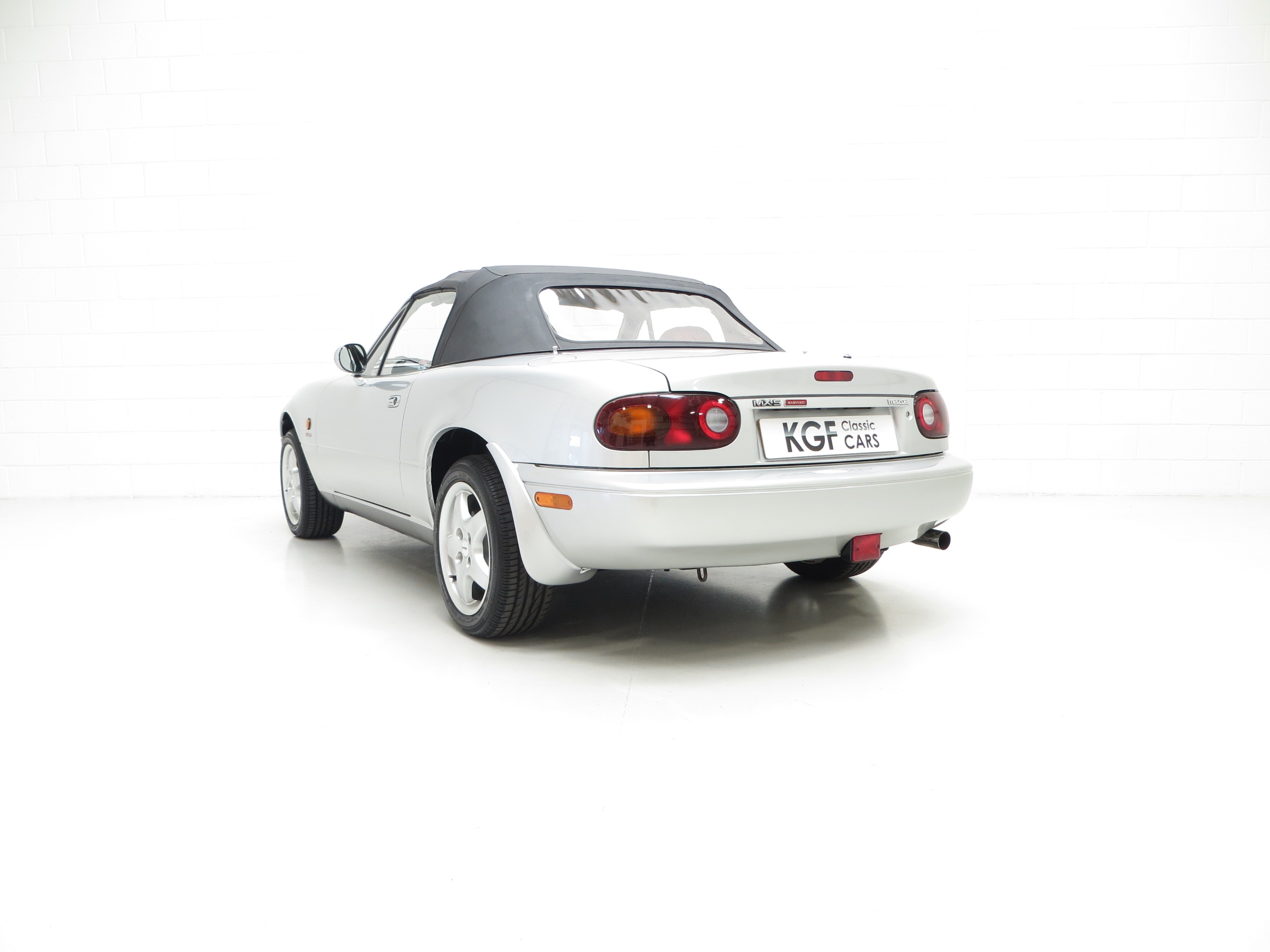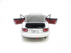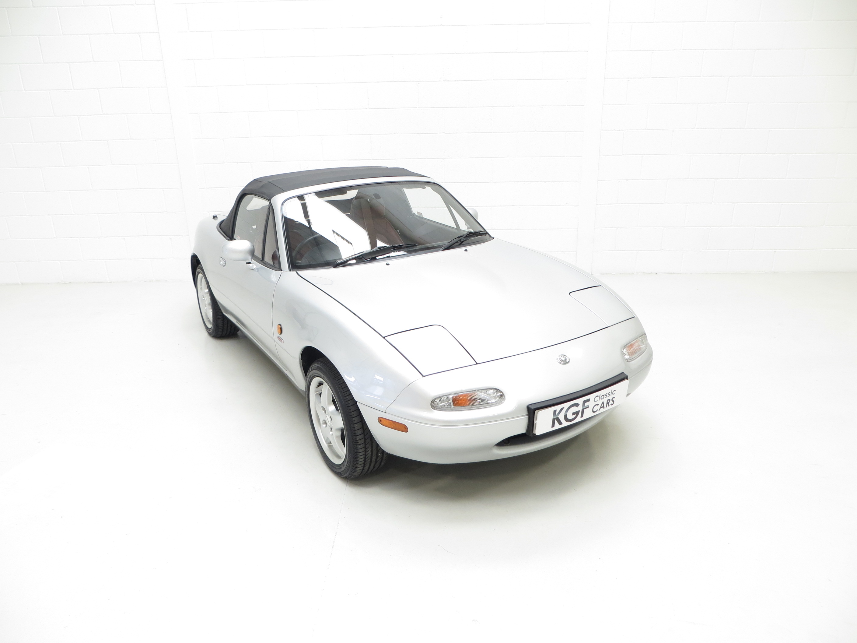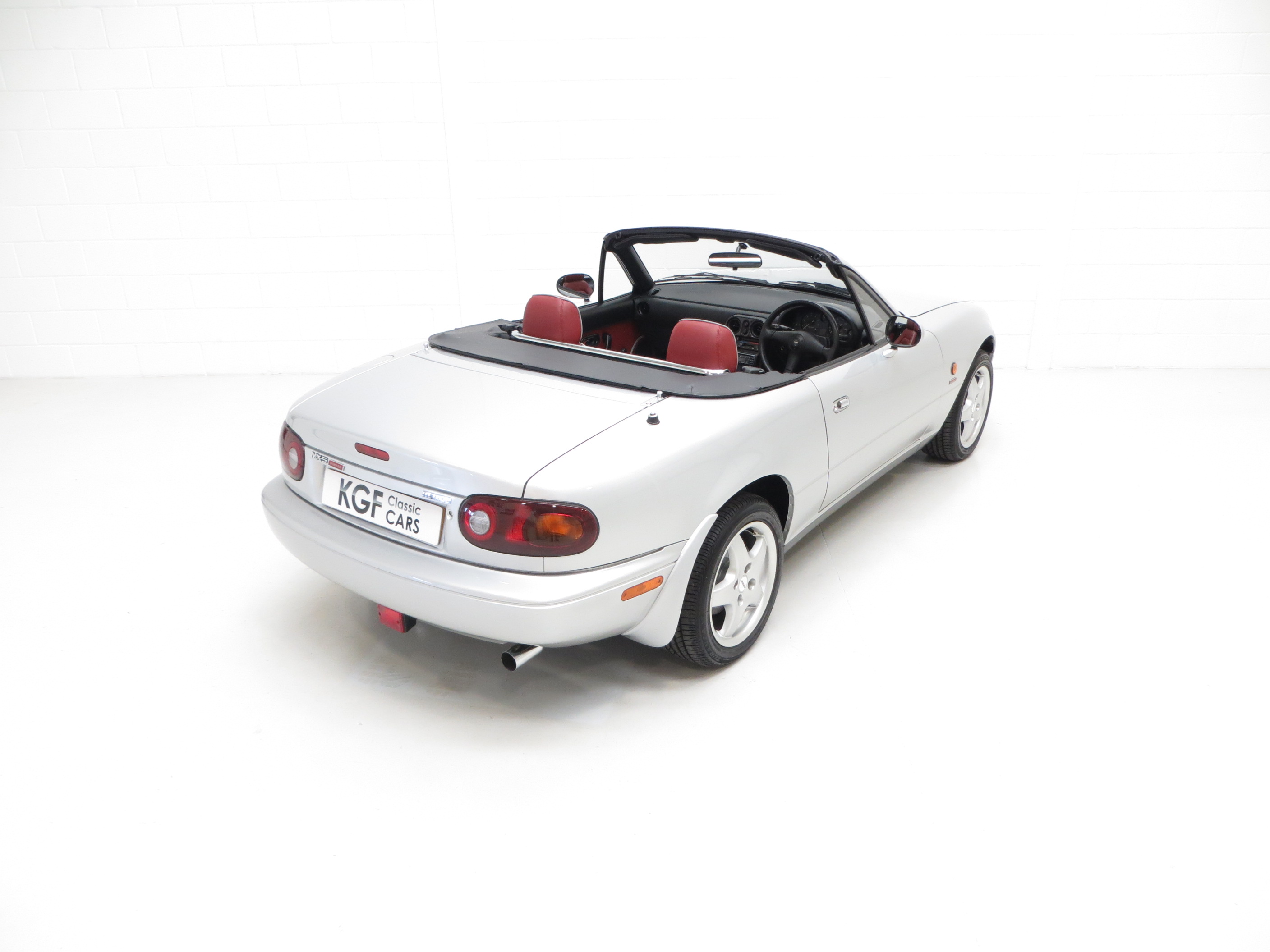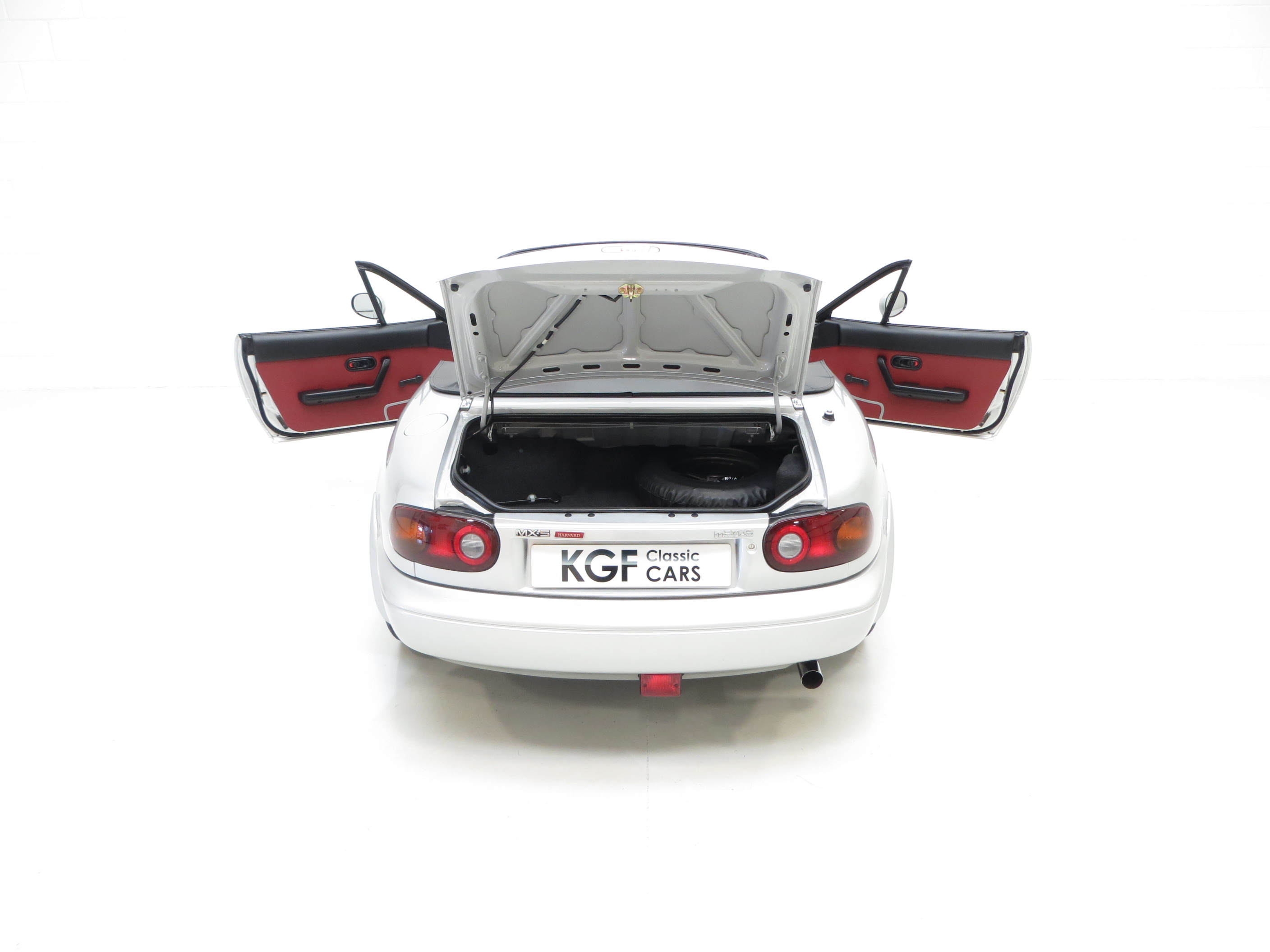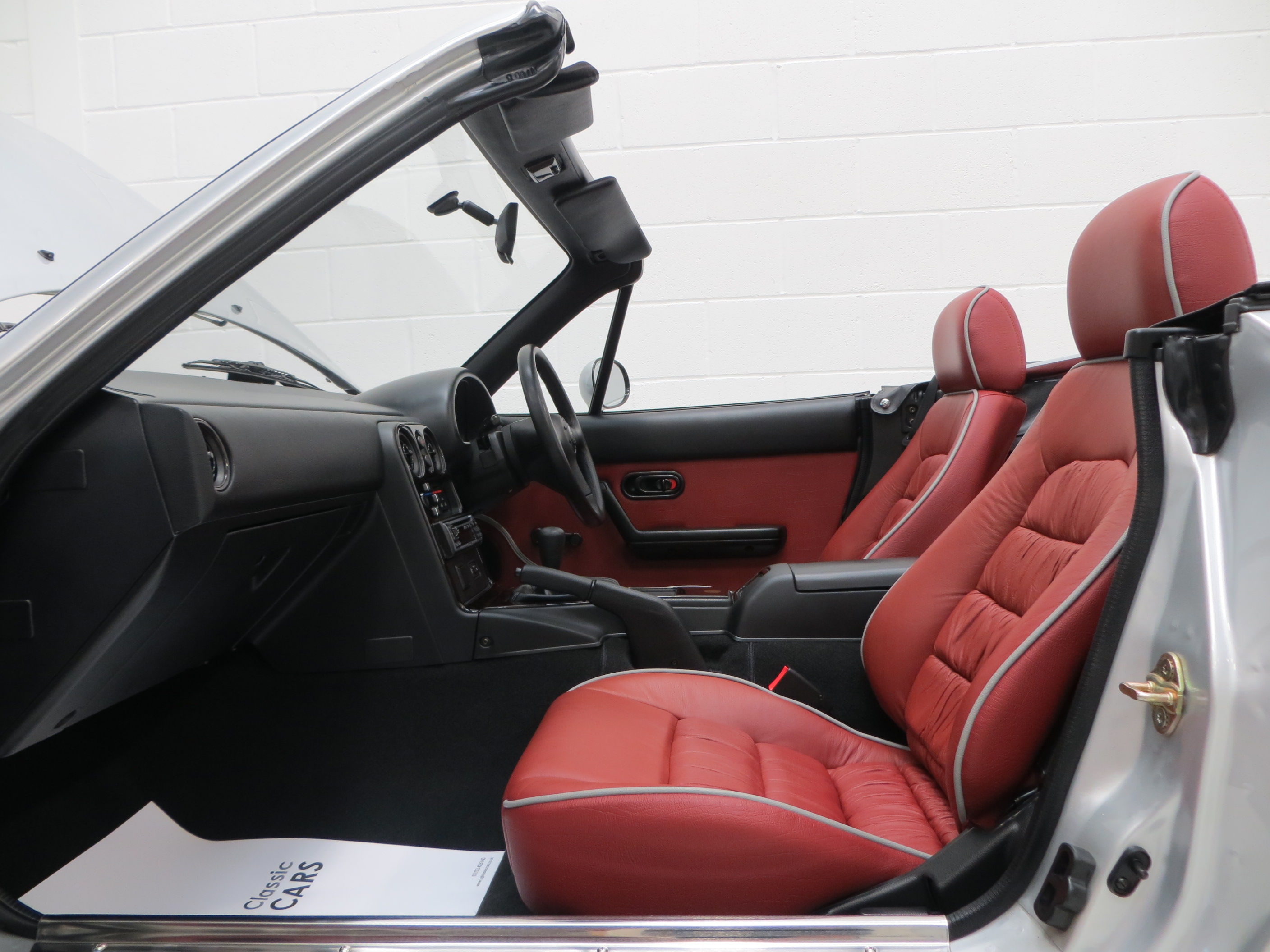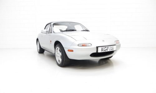 This collectable Mazda MX-5 is one of just 500 examples all finished in classic Silver Stone metallic, (Code 3L). Preserved with such low miles and cossetted storage the paint finish is spectacular and factory original with only a tiny mark to the drivers door barely noticeable. Exhibitionists will be amazed at the clean underside with factory paint dabs and wheel arch spot welds still visible. The black canvas hood is in perfect order with a tight fit and the rear window is crystal clear with no crease marks. The correct special edition badges remain unmarked. Mazda museum quality.