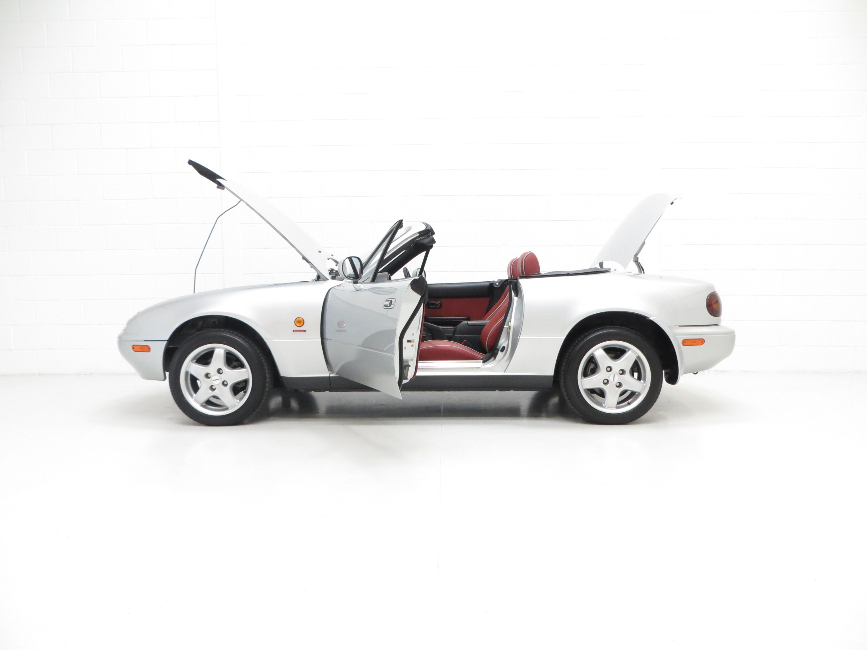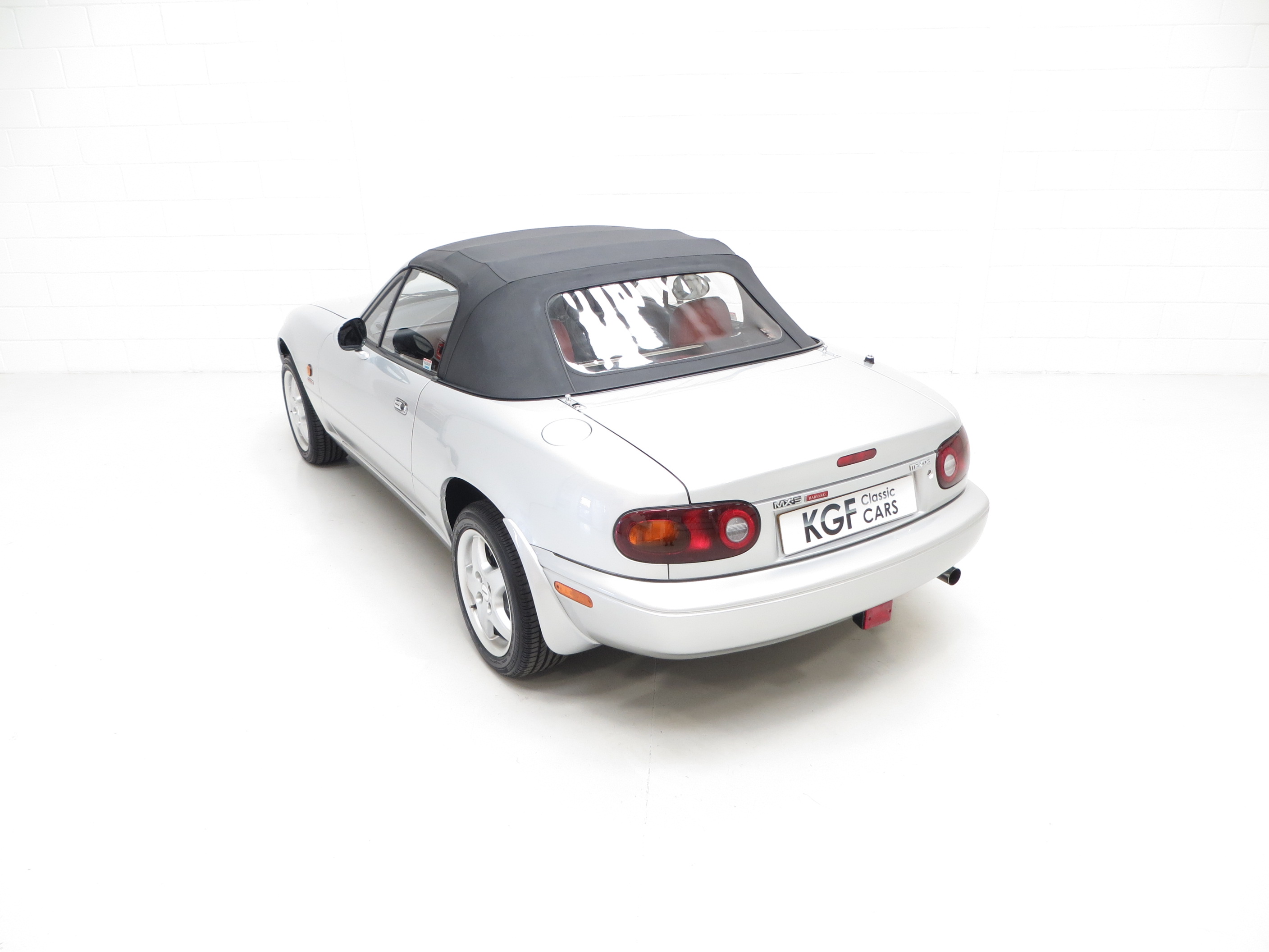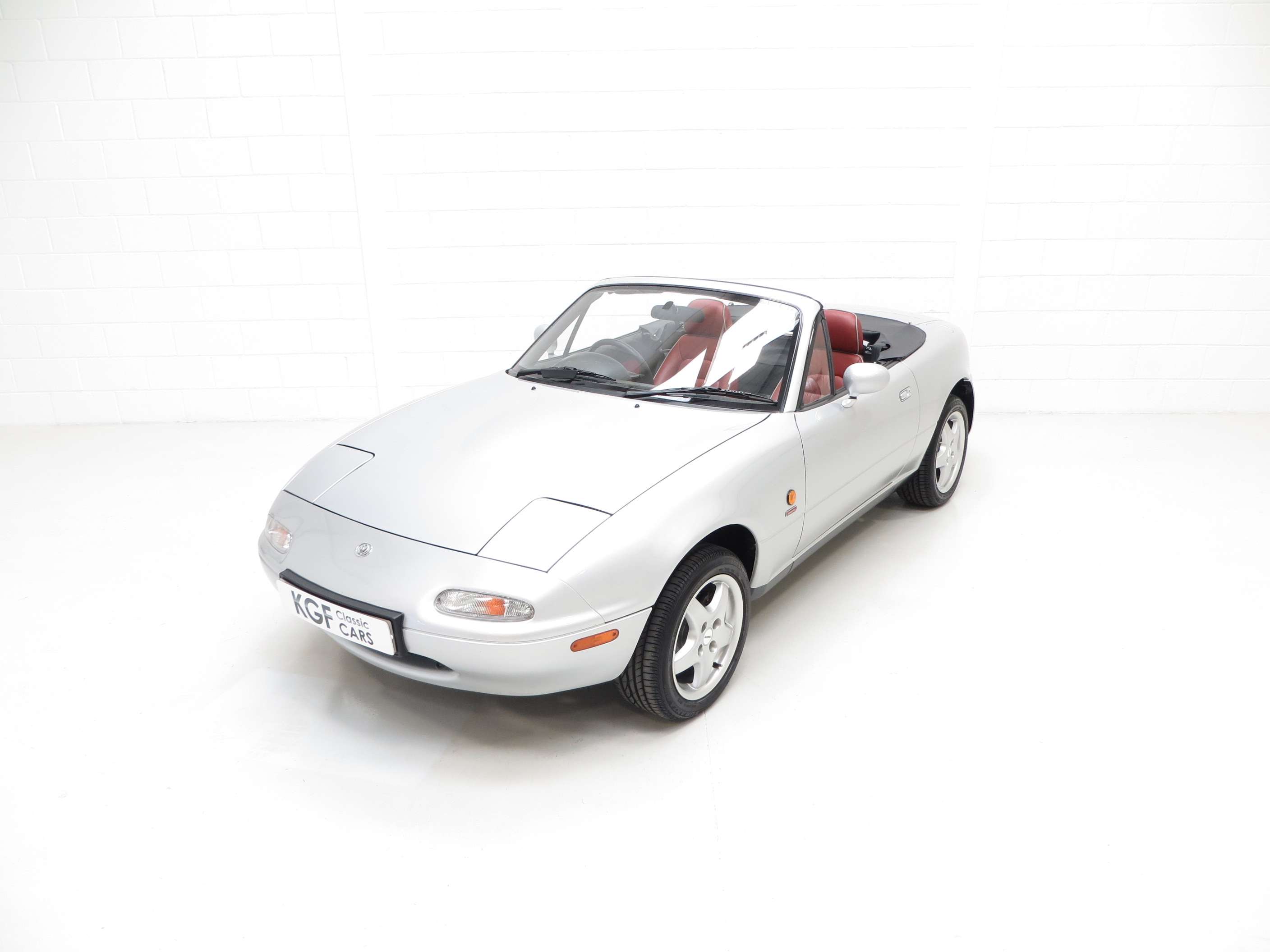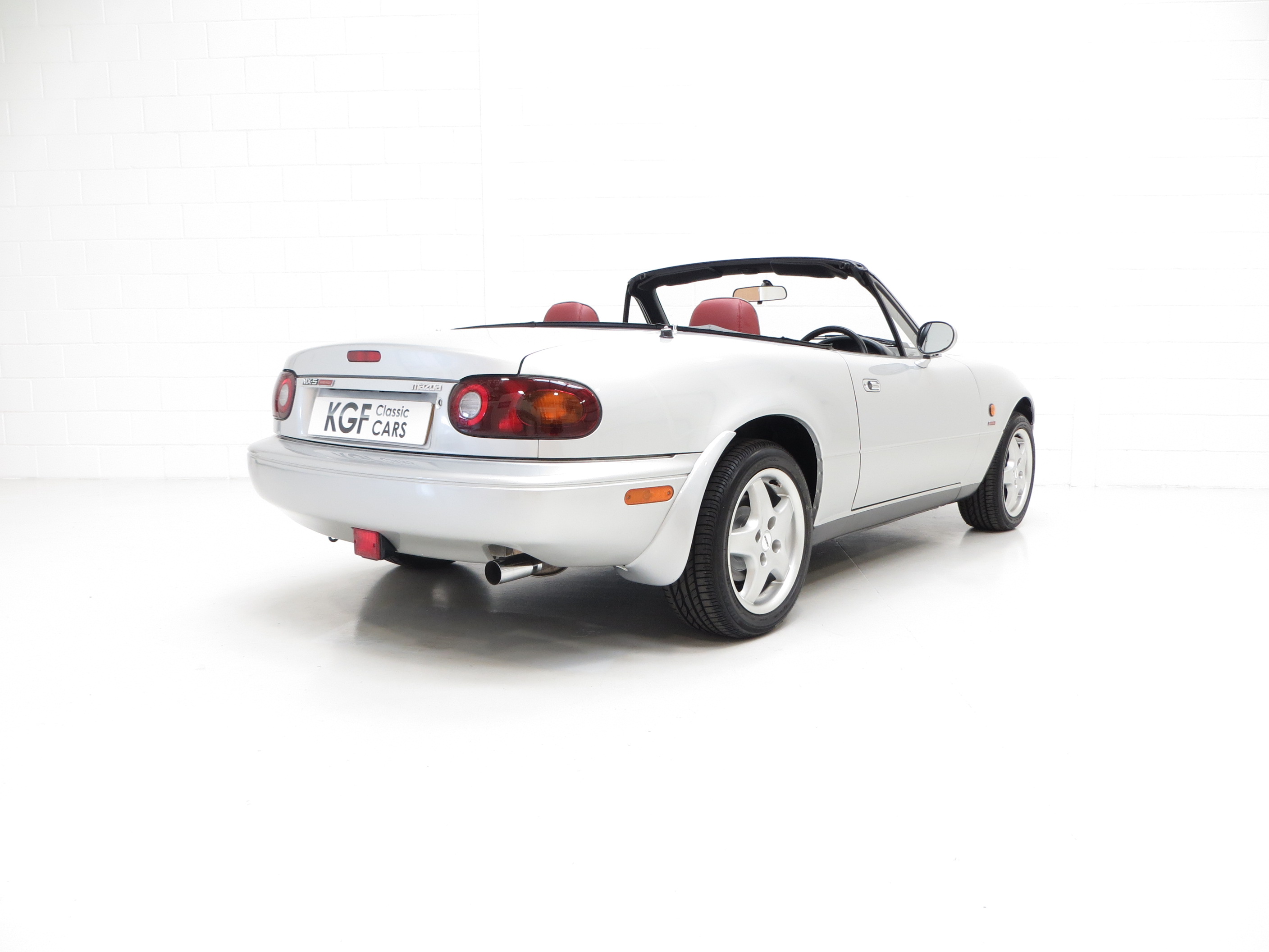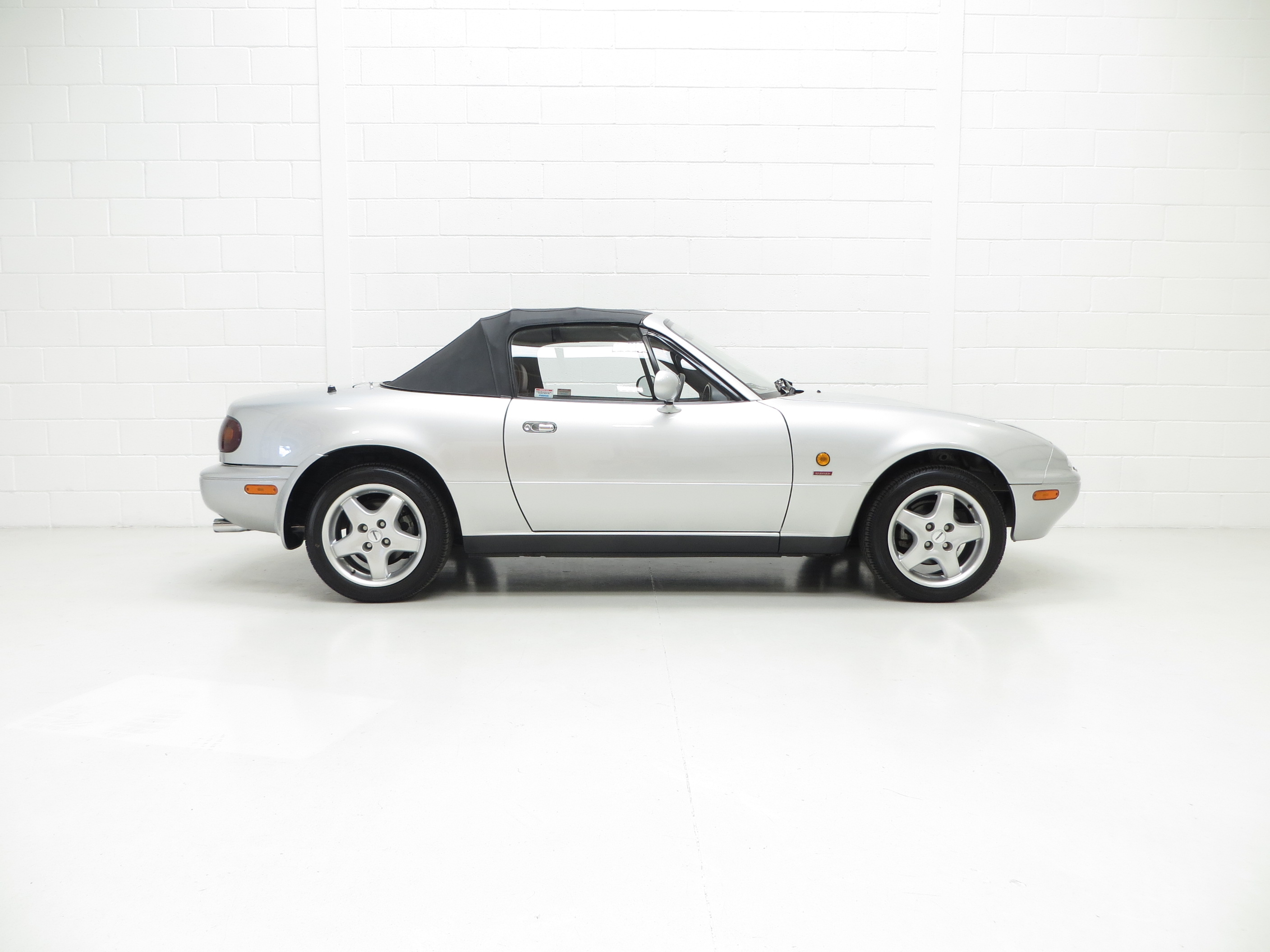 This collectable Mazda MX-5 is one of just 500 examples all finished in classic Silver Stone metallic, (Code 3L). Preserved with such low miles and cossetted storage the paint finish is spectacular and factory original with only a tiny mark to the drivers door barely noticeable. Exhibitionists will be amazed at the clean underside with factory paint dabs and wheel arch spot welds still visible. The black canvas hood is in perfect order with a tight fit and the rear window is crystal clear with no crease marks. The correct special edition badges remain unmarked. Mazda museum quality.