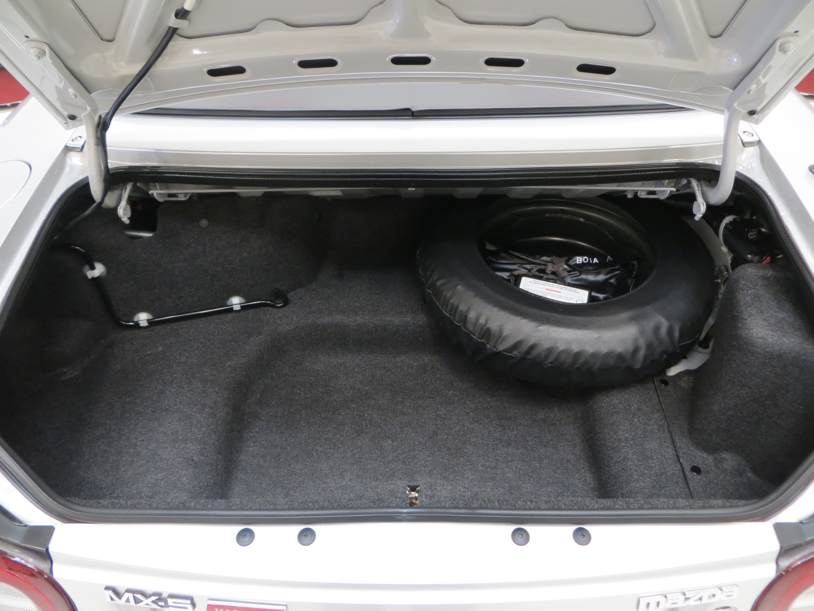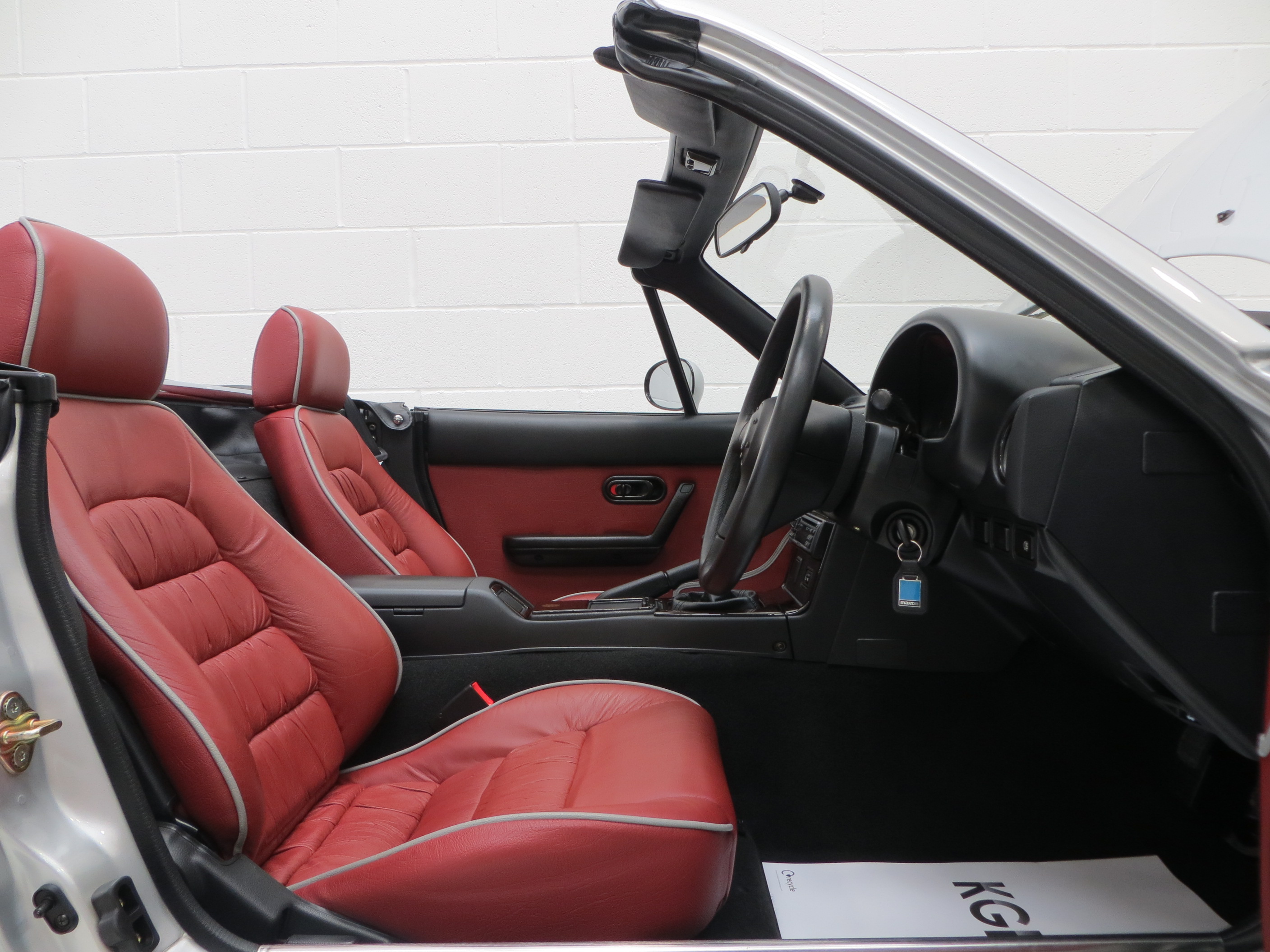 The interior is trimmed in luxurious burgundy leather with grey piping, (Code NA3) and is exactly how Mazda intended being showroom fresh with no wear. Purists will be stunned that the exclusive Harvard carpet mats are still in their polythene wrapping and all factory stickers remain attached including the rear carpet sticker often lost on the first vacuum. Prominent veins on the Momo leather steering wheel and urethane gearknob are indicators only found on very low mileage examples, and the walnut effect trim has one minor mark. The chrome scuff plates still have some of the factory protective film on them. The tonneau cover, tool kit, jack, wheel brace and covered space saver wheel are all present, spotlessly clean and in the case of the tonneau cover still in the manufacturer packaging. Incredible.
