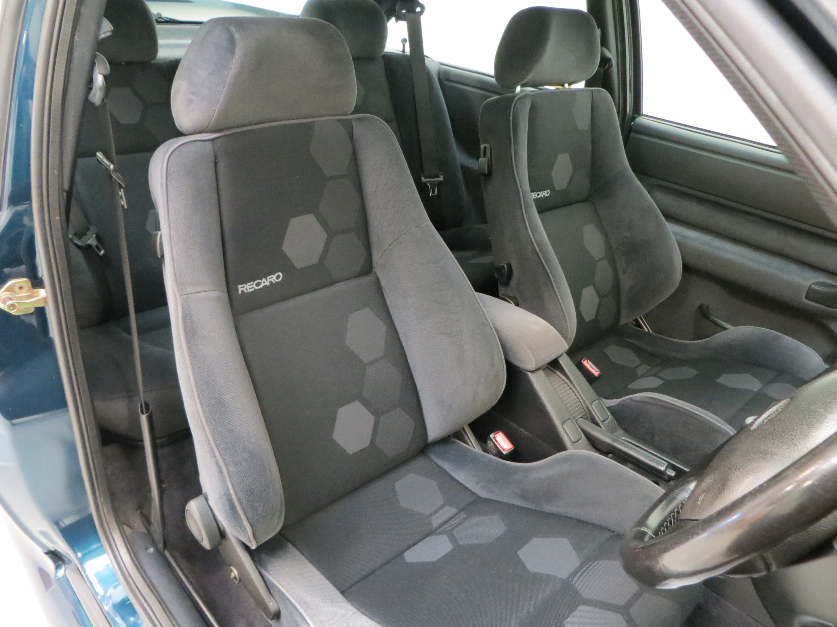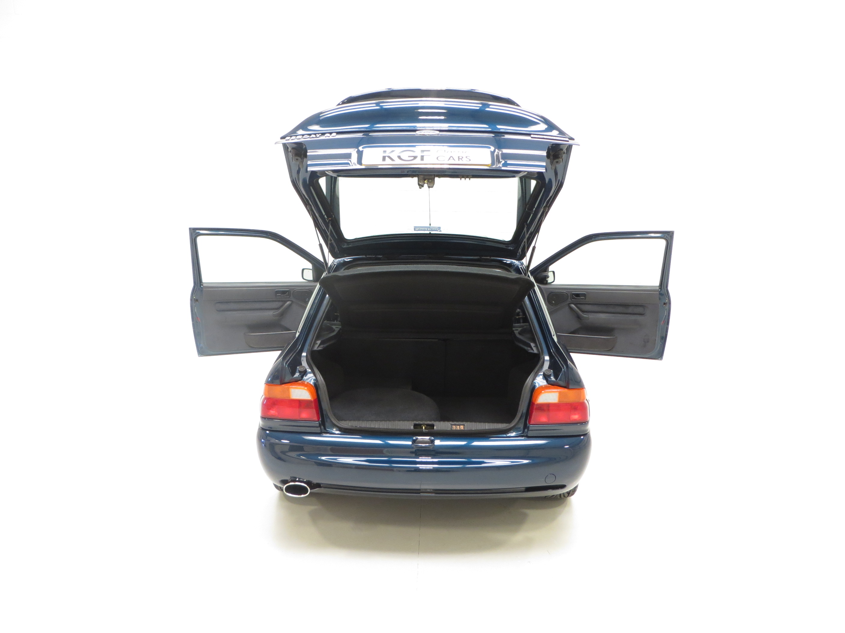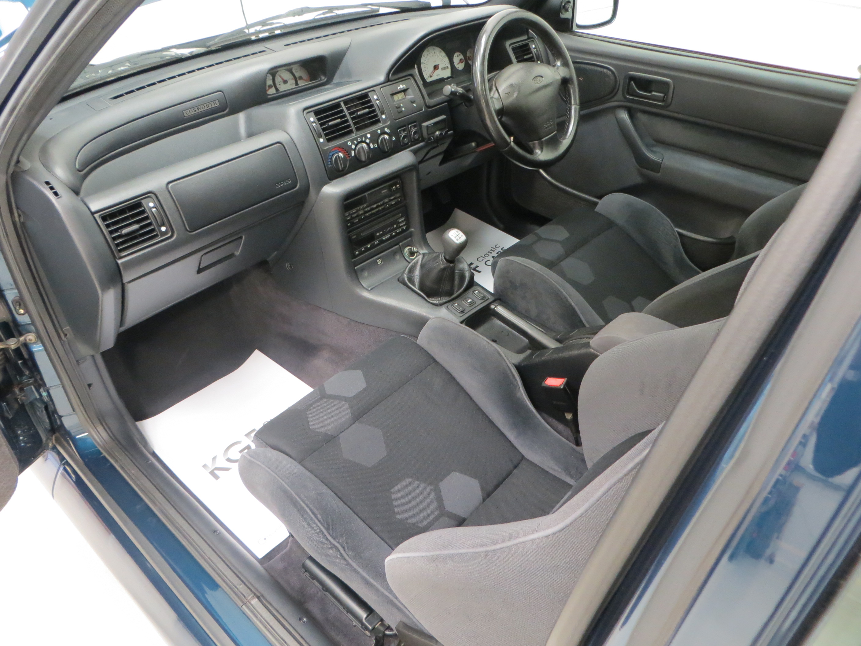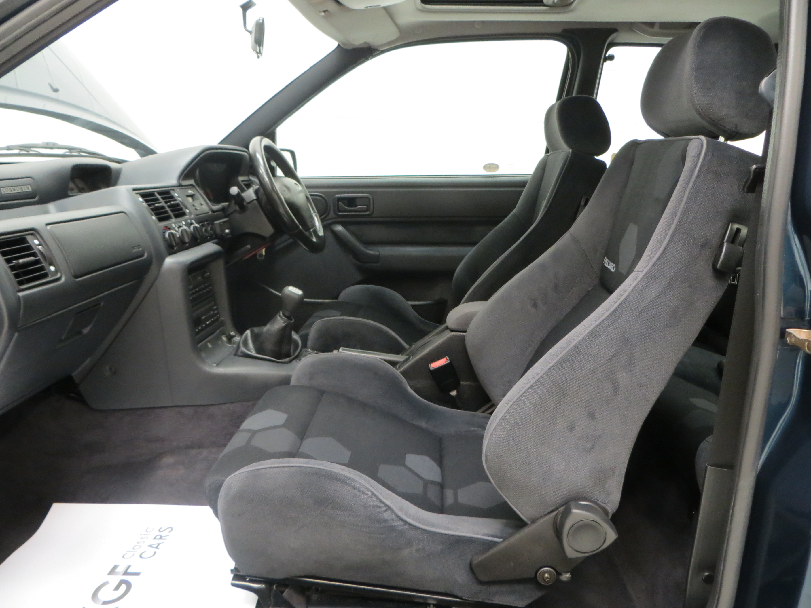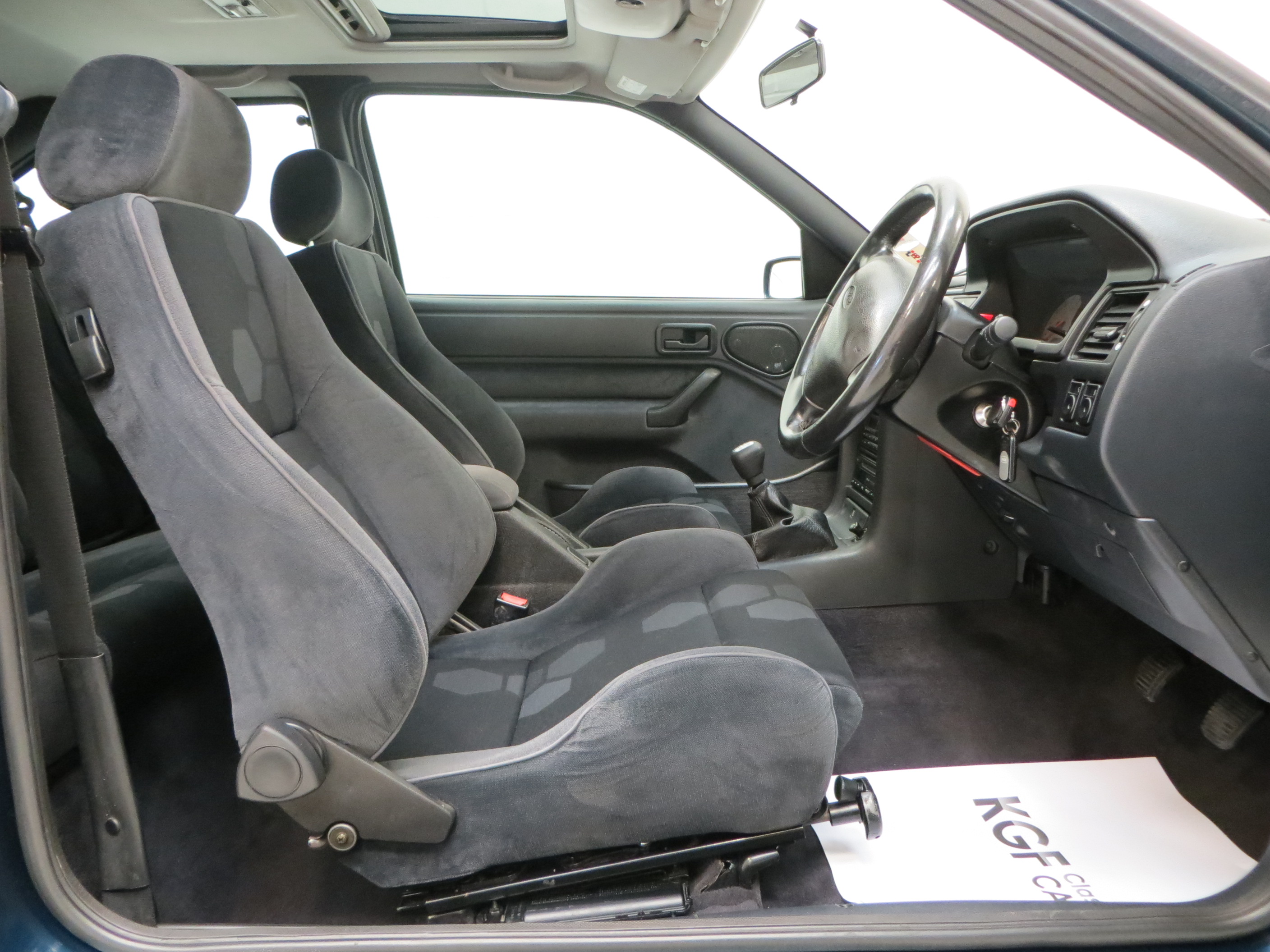 Finished in striking Petrol Blue, (Code C5), available only in late production models between November 1994 and December 1995, this is a very rare colour. The paintwork boasts a uniform shine guaranteed to attract admiring glances. Markings and hairline scratches are visible upon close scrutiny and all exterior trim sections, lights and badges are excellent. The driver’s door weather strip is lifting slightly to the edge. The iconic whale tail spoiler is fully intact and vulnerable black lower extension to the front bumper has been replaced. Ford window stickers remain attached including the Ford Security System and supplying dealer rear window sticker. A true Ford RS legend.