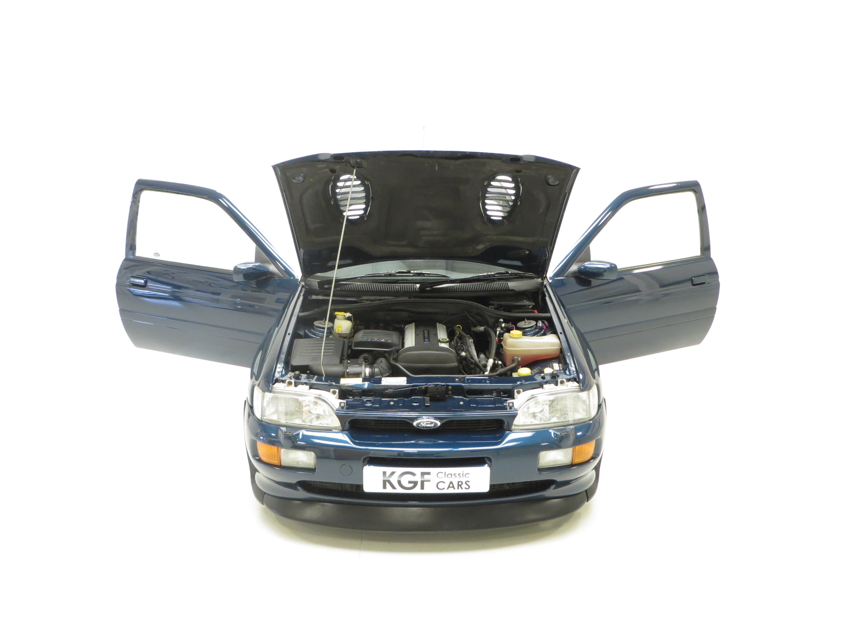 Body colour front bumper with black lower extension, front airdam, louvred bonnet air intakes, wing air extraction grilles, integral driving lights and fog lights, driver airbag, padded armrest with cassette storage, oil pressure gauge, turbo gauge, voltmeter, quartz digital clock with ambient temperature, white sports dials, Ford 2007 RDS radio/cassette. Lux Model equipment; Electrically operated and heated door mirrors, ‘Quickclear’ heated windscreen, heated washer jets, three-spoke leather covered steering wheel, rear centre armrest, rear head restraints, electric sunroof, electric windows, carpeted door bins. Factory Options; Passenger airbag, CFC free air conditioning, CD player model 2040.
